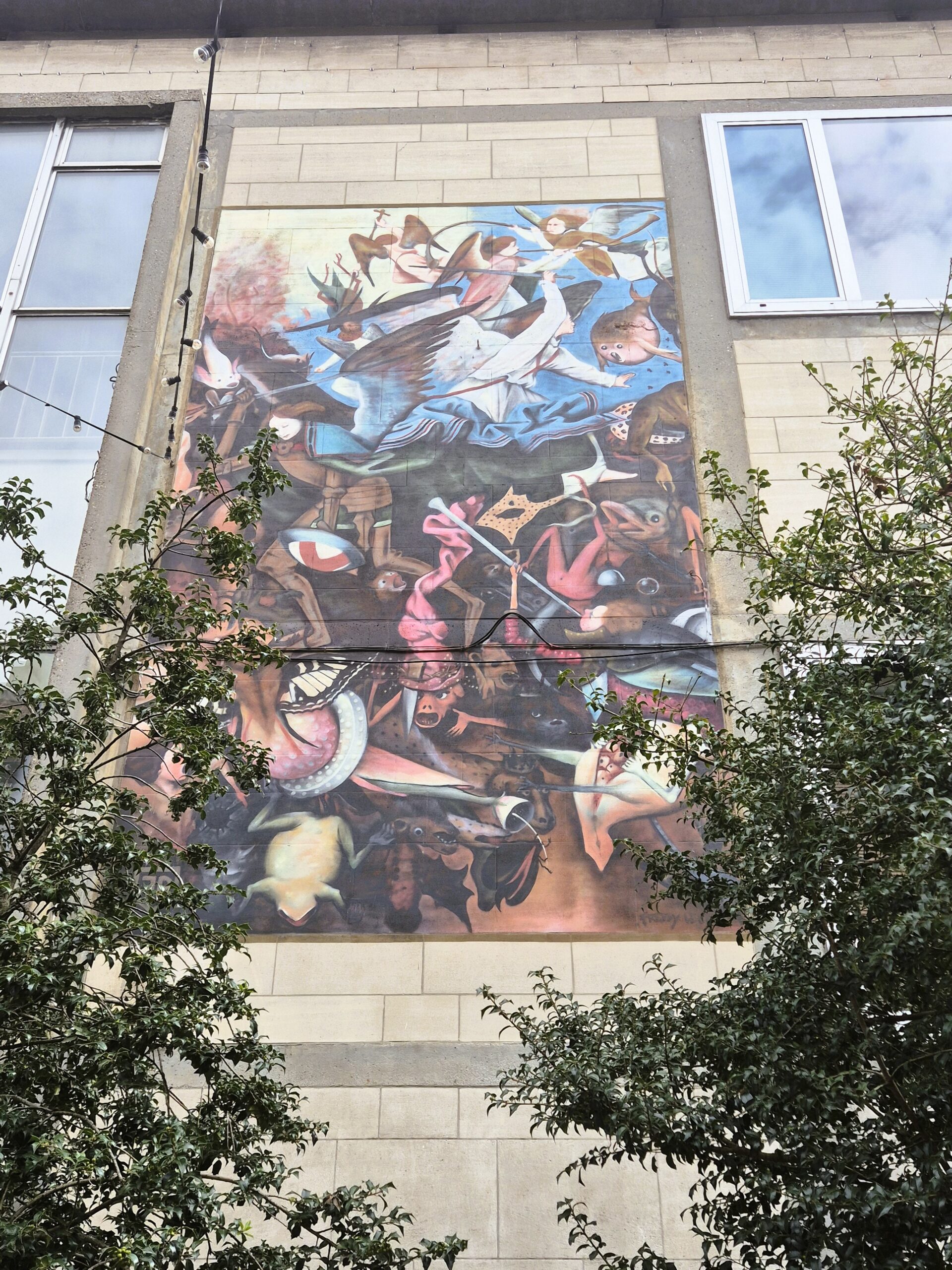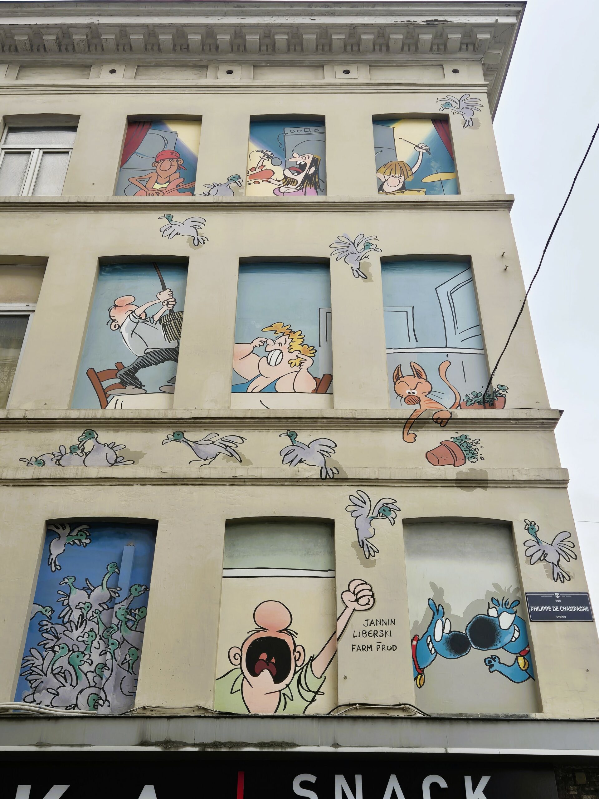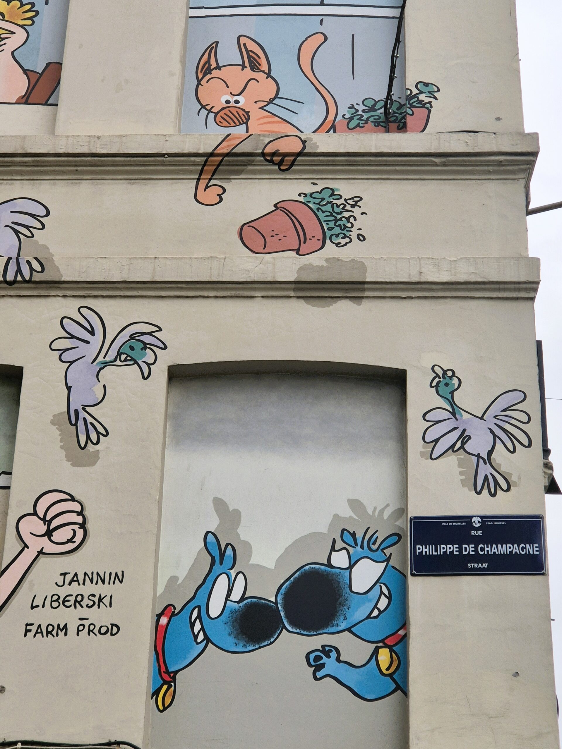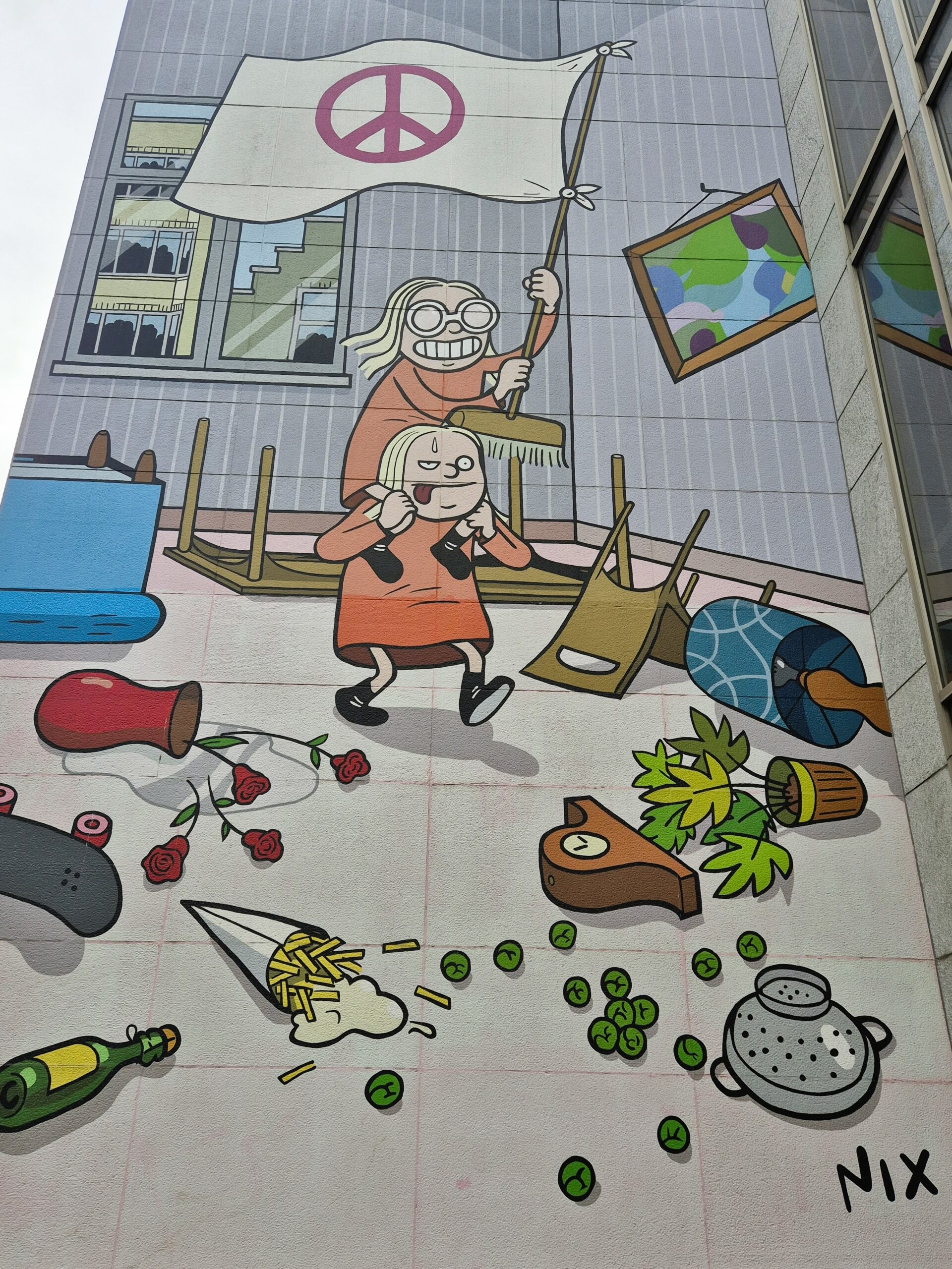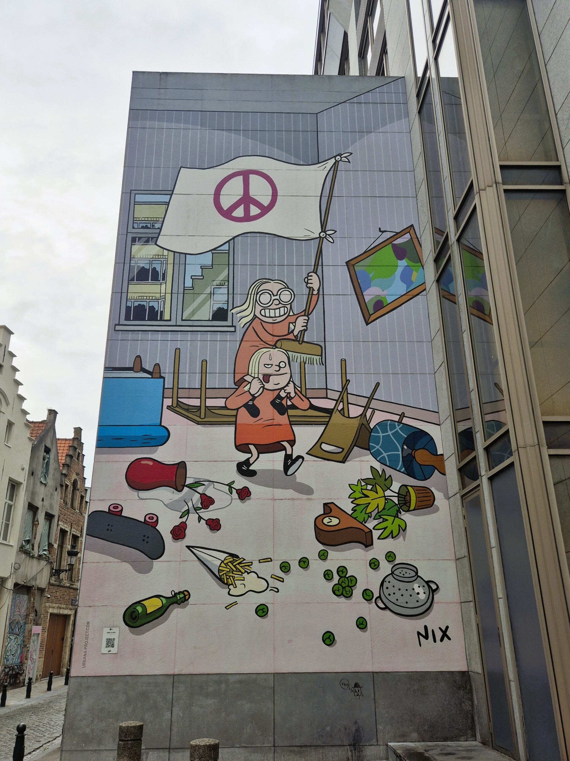 Μόλις ένα τετράγωνο παραπέρα, οι Kinky και Cosy, οι ιδιότροπες δίδυμες αδερφές που γέννησαν η πένα και η φαντασία του Βέλγου συγγραφέα – καρτουνίστα Nix, κυριολεκτικά σπέρνουν τον όλεθρο και προκαλούν χάος στις Βρυξέλλες. Τουλάχιστον αυτό βλέπουμε να συμβαίνει στη συγκεκριμένη τοιχογραφία, όπου οι «enfants terribles» των βέλγικων καρτούν, κραδαίνοντας μια αυτοσχέδια σημαία της ειρήνης δεμένη σε σκουπόξυλο, μετατρέπουν το σπίτι τους σε πεδίο μάχης: αναποδογυρισμένα έπιπλα, βάζα και διακοσμητικά πεταμένα στο πάτωμα, όπως και οι τηγανιτές πατάτες με μαγιονέζα και τα λαχανάκια Βρυξελλών – ένα κλείσιμο του ματιού απ’ τη πλευρά του Nix σε κλισέ ταυτισμένα με την πατρίδα του. (Rue des Bogards 19)