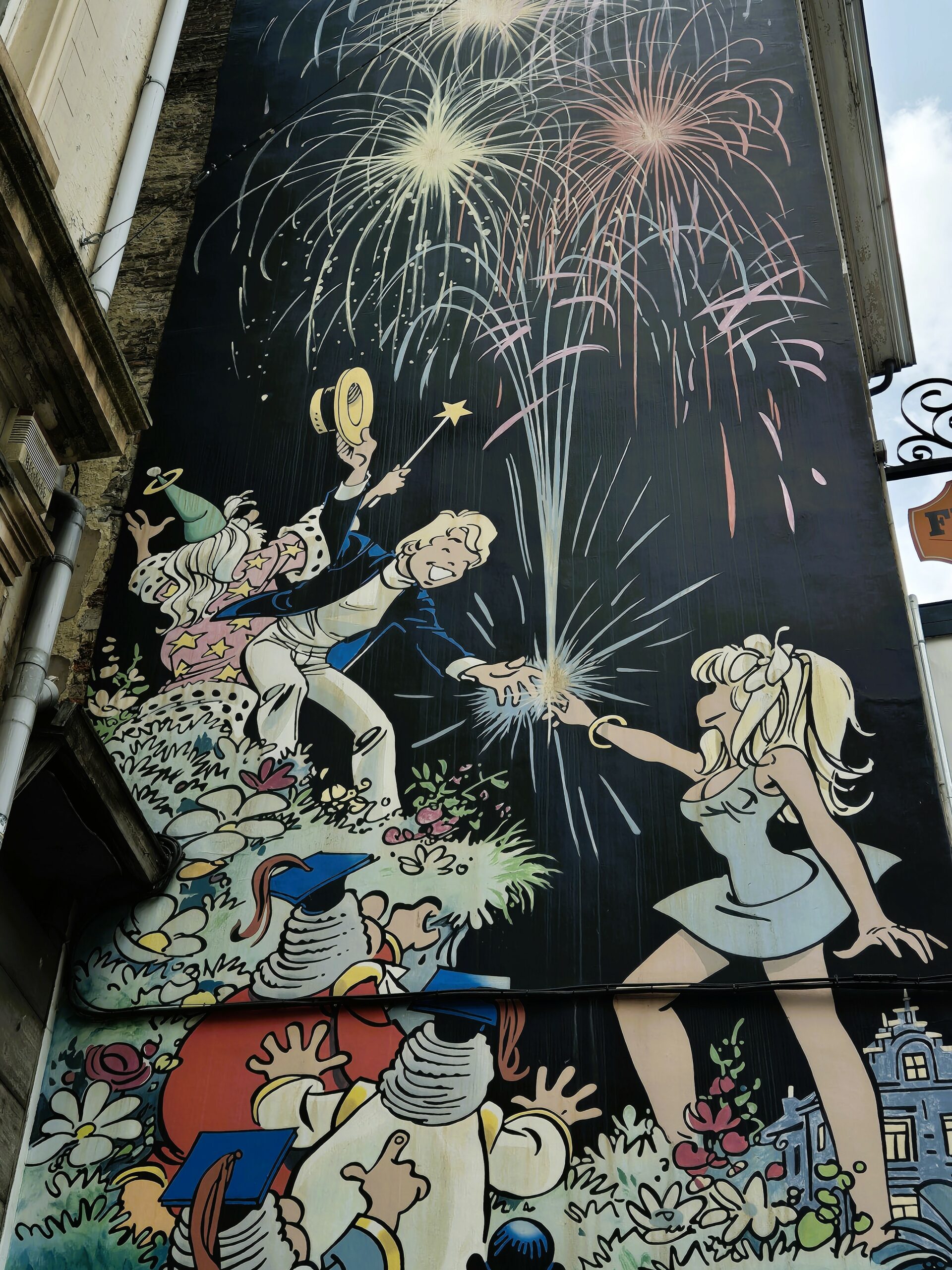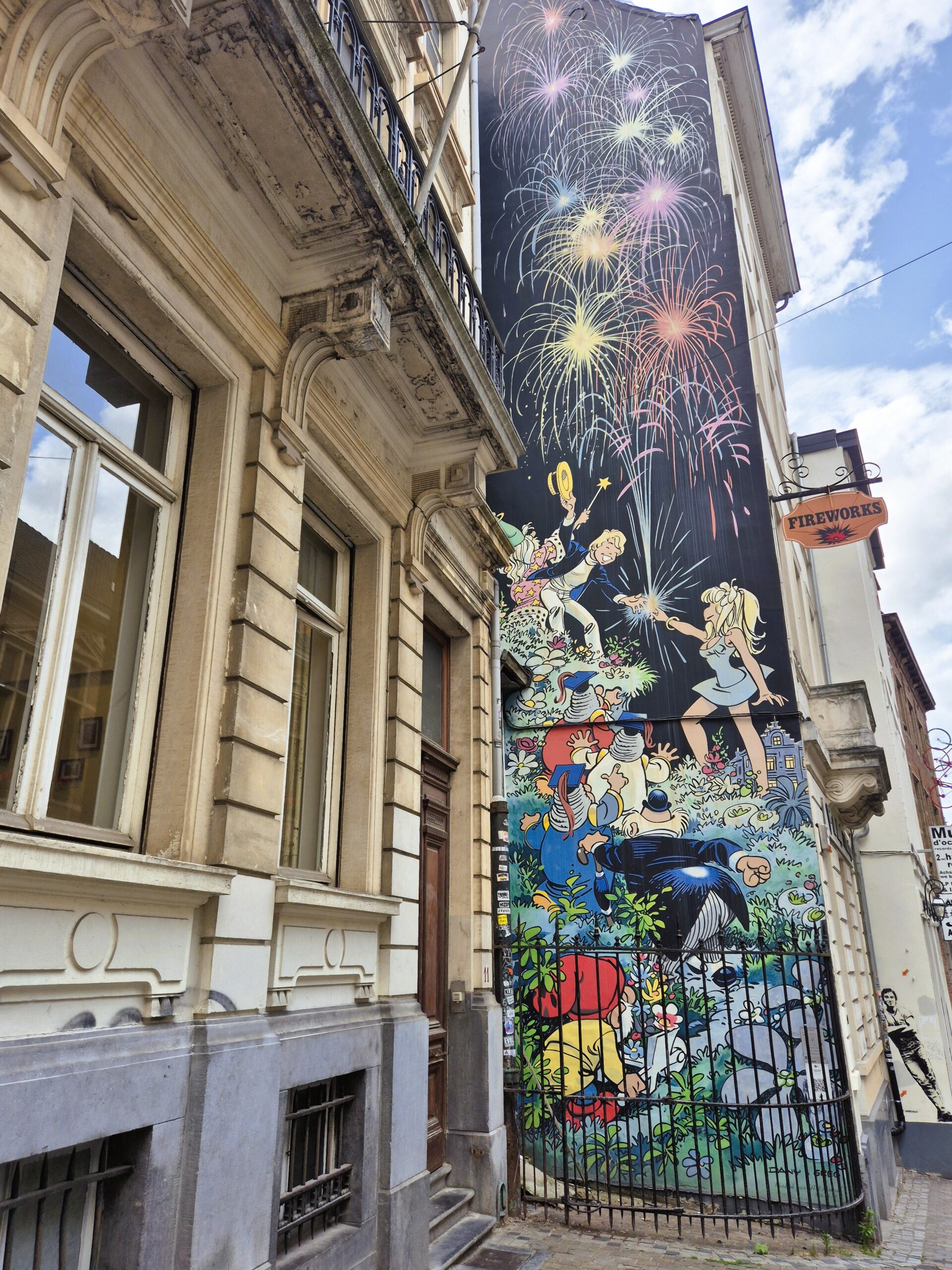Κυριολεκτικά λίγα βήματα παραπέρα, ο καρτουνίστας Dany σκορπά λάμψη και αισιοδοξία στο νο 9 της οδού Rue du Chêne, με μία ιδιαίτερα ζωηρόχρωμη από τις 80 περίπου τοιχογραφίες των Βρυξελλών. Εδώ μεταφερόμαστε απευθείας στον ονειρικό κόσμο της Rêverose, το ουτοπικό σύμπαν που ο συγγραφέας κόμικς Greg δημιούργησε το 1968, κι όπου δεν έχει αξία το χρήμα καθώς πληρώνεις με δάκρυα χαράς, τραγούδια, γέλιο και φιλιά. Στη γεμάτη ποιητικότητα, φαντασία και χρώμα σκηνή της τοιχογραφίας, ο κεντρικός χαρακτήρας Olivier Rameau της ομώνυμης σειράς, απλώνει ευτυχισμένος το χέρι του προς την αισθησιακή Colombe Tiredaile, με τα πυροτεχνήματα γύρω τους να συμβολίζουν τη μαγεία του φανταστικού τους κόσμου.
