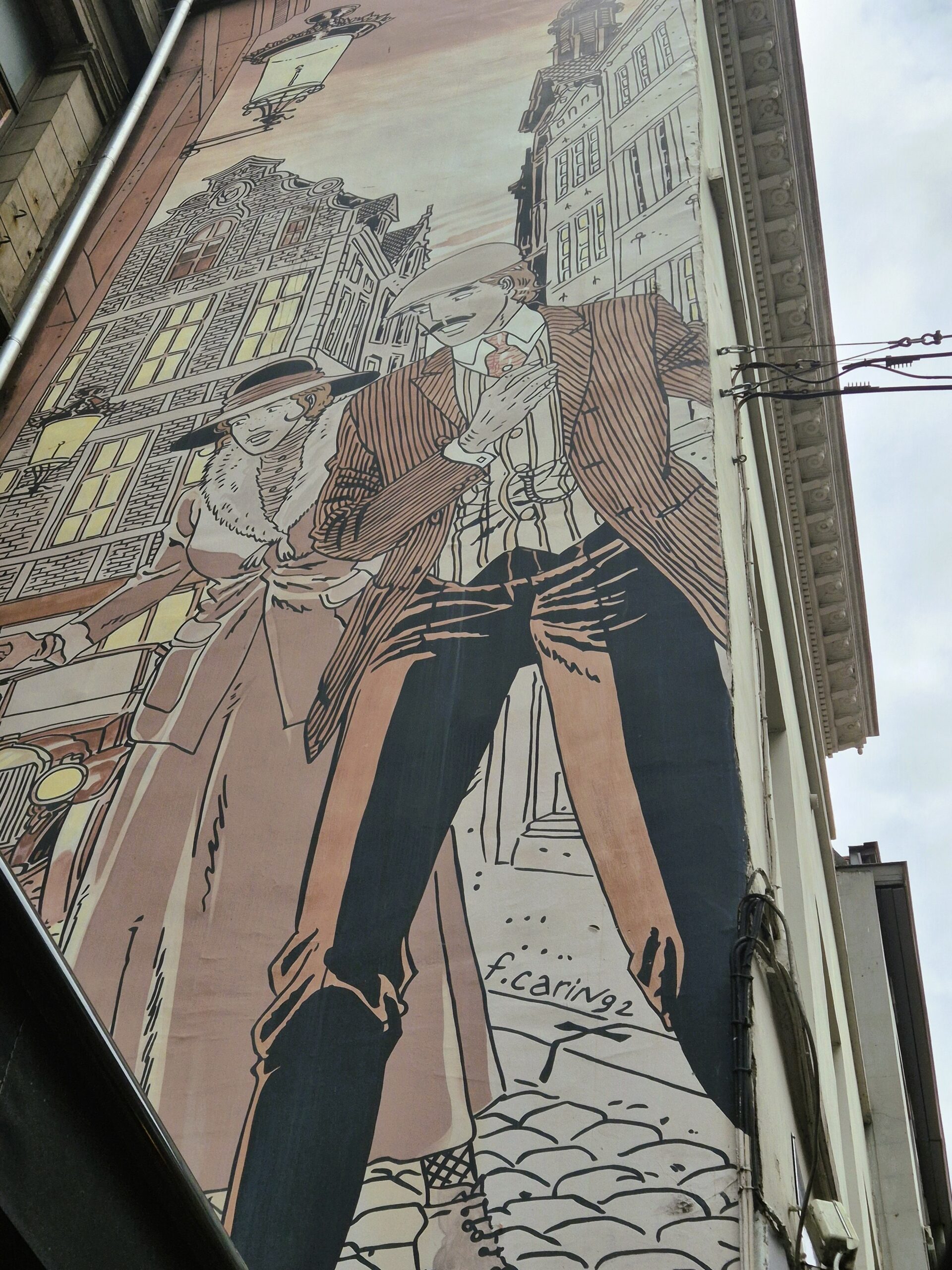 Rue du Marché au Charbon και σε μια από τις ωραιότερες εκφράσεις του street art στις Βρυξέλλες. Η γεμάτη κομψότητα και λεπτομέρεια τοιχογραφία του 2002 που σχεδίασε ο Βέλγος καλλιτέχνης Francis Carin, μας μεταφέρει στην εποχή του Πρώτου Παγκοσμίου Πολέμου, όπου ο άψογα ντυμένος gentleman Victor Sackville ταξιδεύει ανά τον κόσμο ως κατάσκοπος στην υπηρεσία της Αυτού Μεγαλειότητας του βασιλιά της Μεγάλης Βρετανίας, κάνοντας τα πάντα για να ανατρέψει τα σχέδια των εχθρών του Στέμματος.