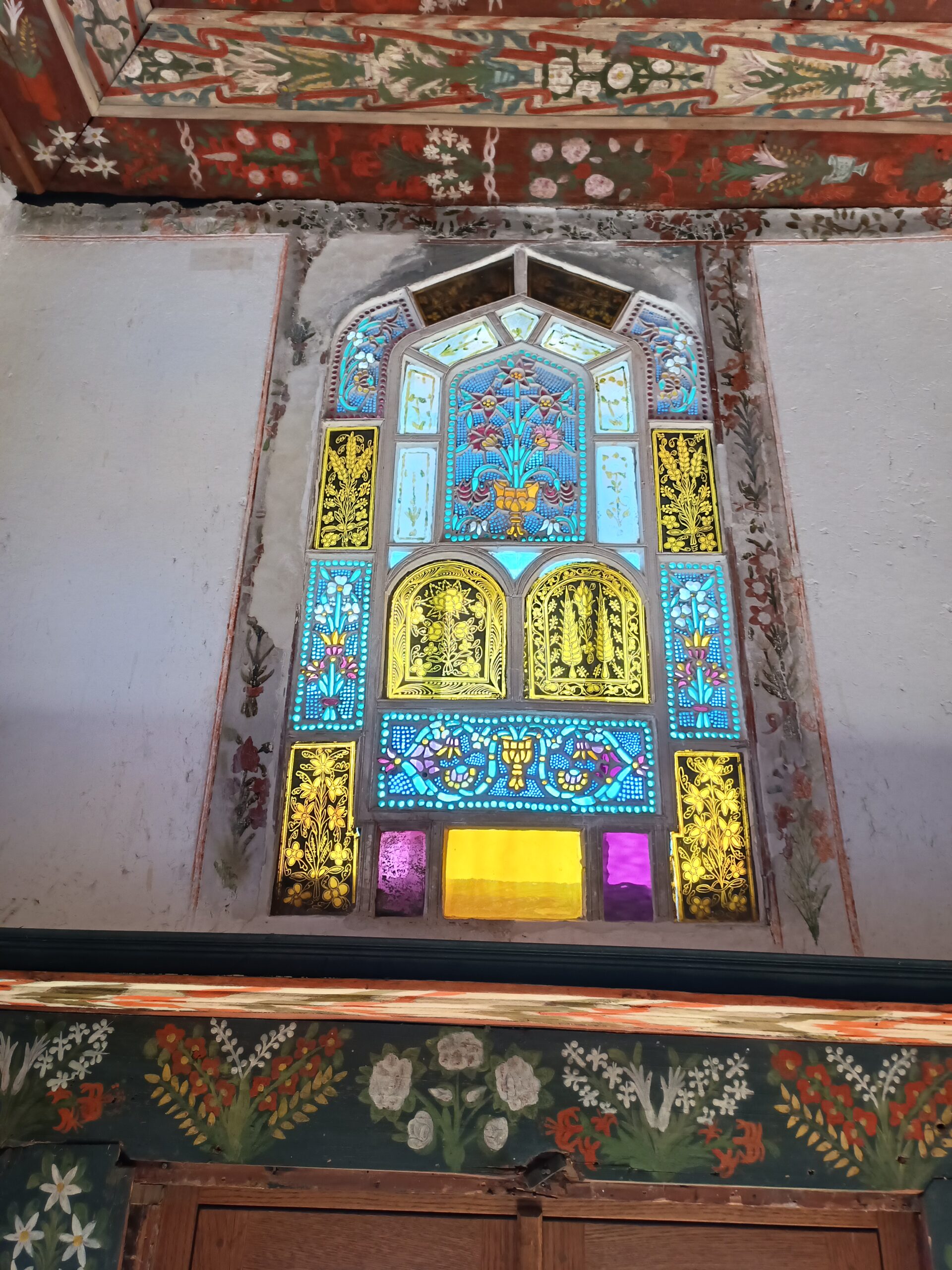 Ίσως, όμως, πιο εντυπωσιακά είναι τα σπάνια βιτρώ του αρχοντικού. Ζωγραφισμένα σε έντονα χρώματα που επιτρέπουν το λιγοστό φως της συννεφιασμένης περιοχής να διεισδύει αρμονικά στον χώρο δημιουργούν μία αίσθηση ζεστασιάς μέσα σε μία πολύχρωμη πανδαισία που γεμίζει τον χώρο. Φυτά με περίτεχνα άνθη, βυζαντινοί αετοί, θυρεοί και άλλα σύμβολα γεμίζουν τα τετραγωνισμένα βιτρώ που είναι τοποθετημένα με μαθηματική ακρίβεια ψηλά πάνω στους τοίχους.