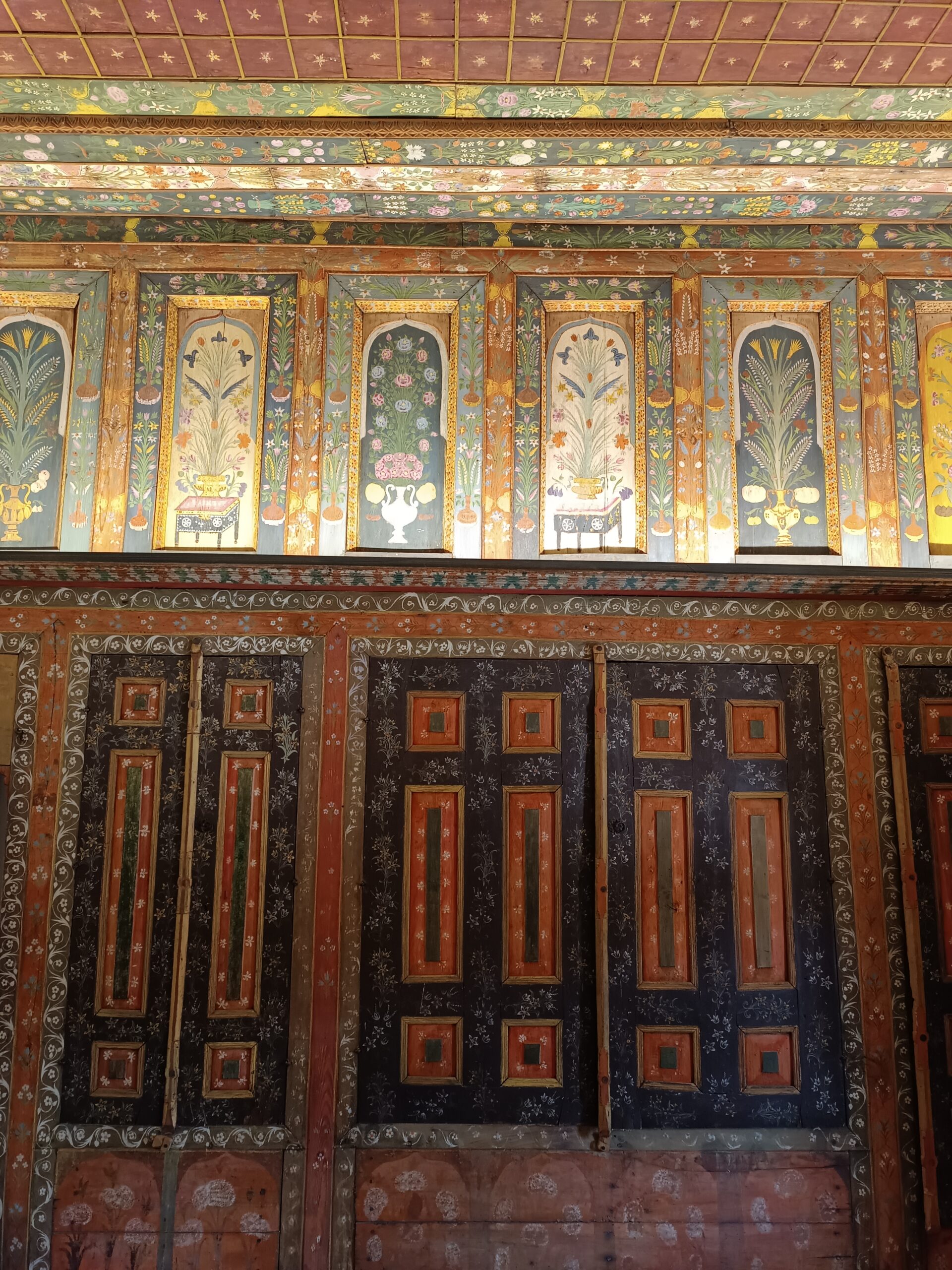 Ίσως, όμως, πιο εντυπωσιακά είναι τα σπάνια βιτρώ του αρχοντικού. Ζωγραφισμένα σε έντονα χρώματα που επιτρέπουν το λιγοστό φως της συννεφιασμένης περιοχής να διεισδύει αρμονικά στον χώρο δημιουργούν μία αίσθηση ζεστασιάς μέσα σε μία πολύχρωμη πανδαισία που γεμίζει τον χώρο. Φυτά με περίτεχνα άνθη, βυζαντινοί αετοί, θυρεοί και άλλα σύμβολα γεμίζουν τα τετραγωνισμένα βιτρώ που είναι τοποθετημένα με μαθηματική ακρίβεια ψηλά πάνω στους τοίχους.