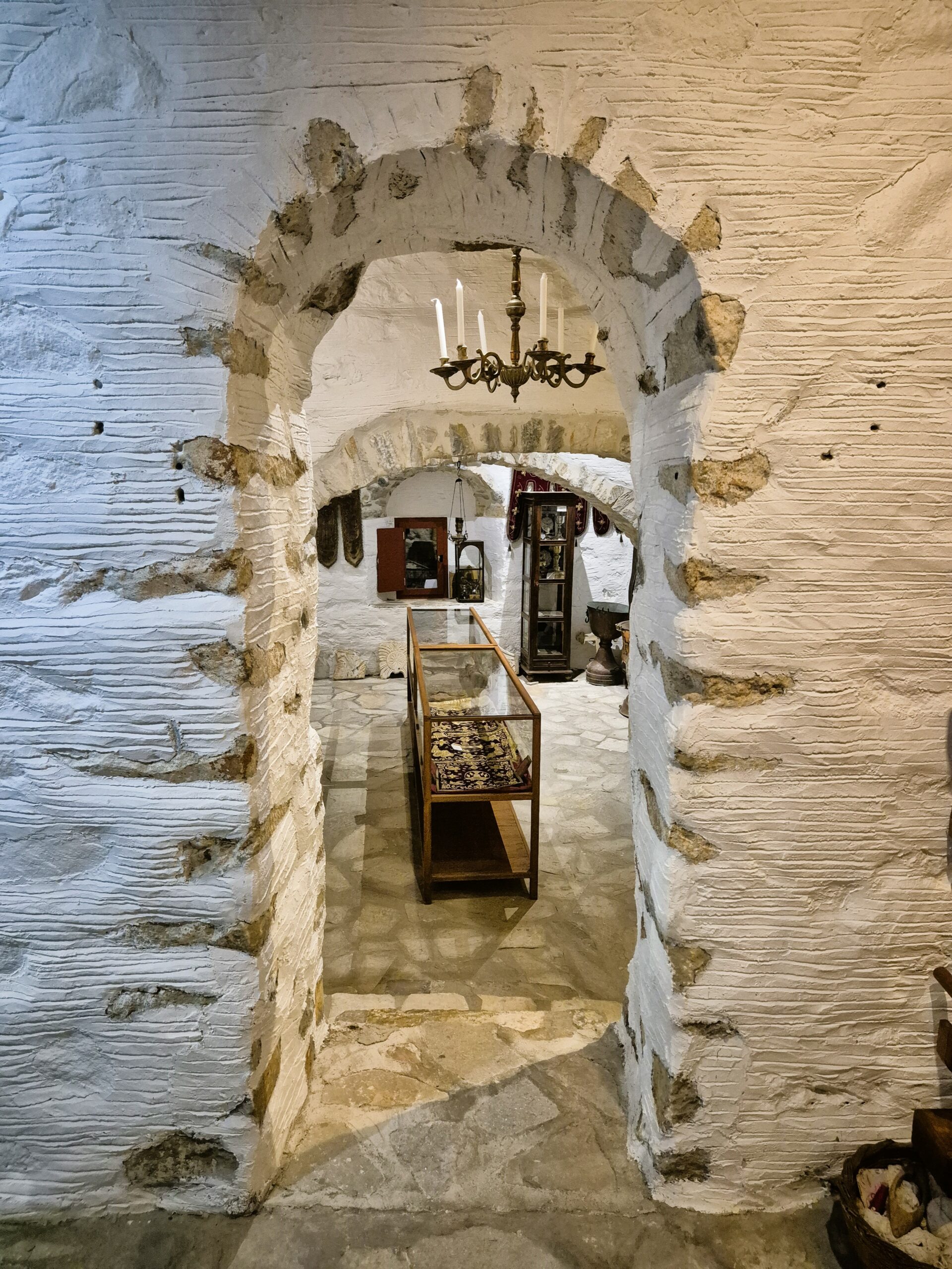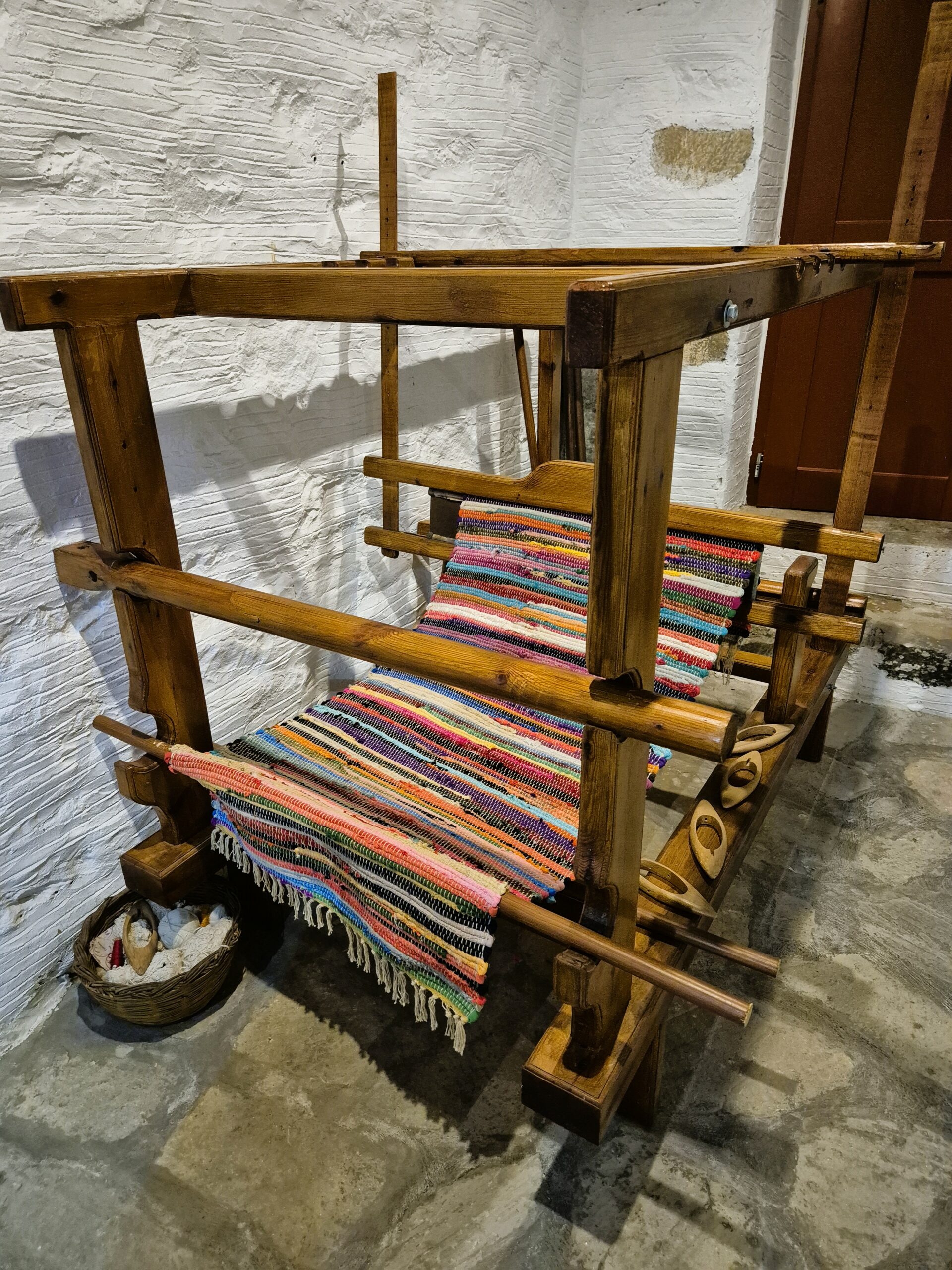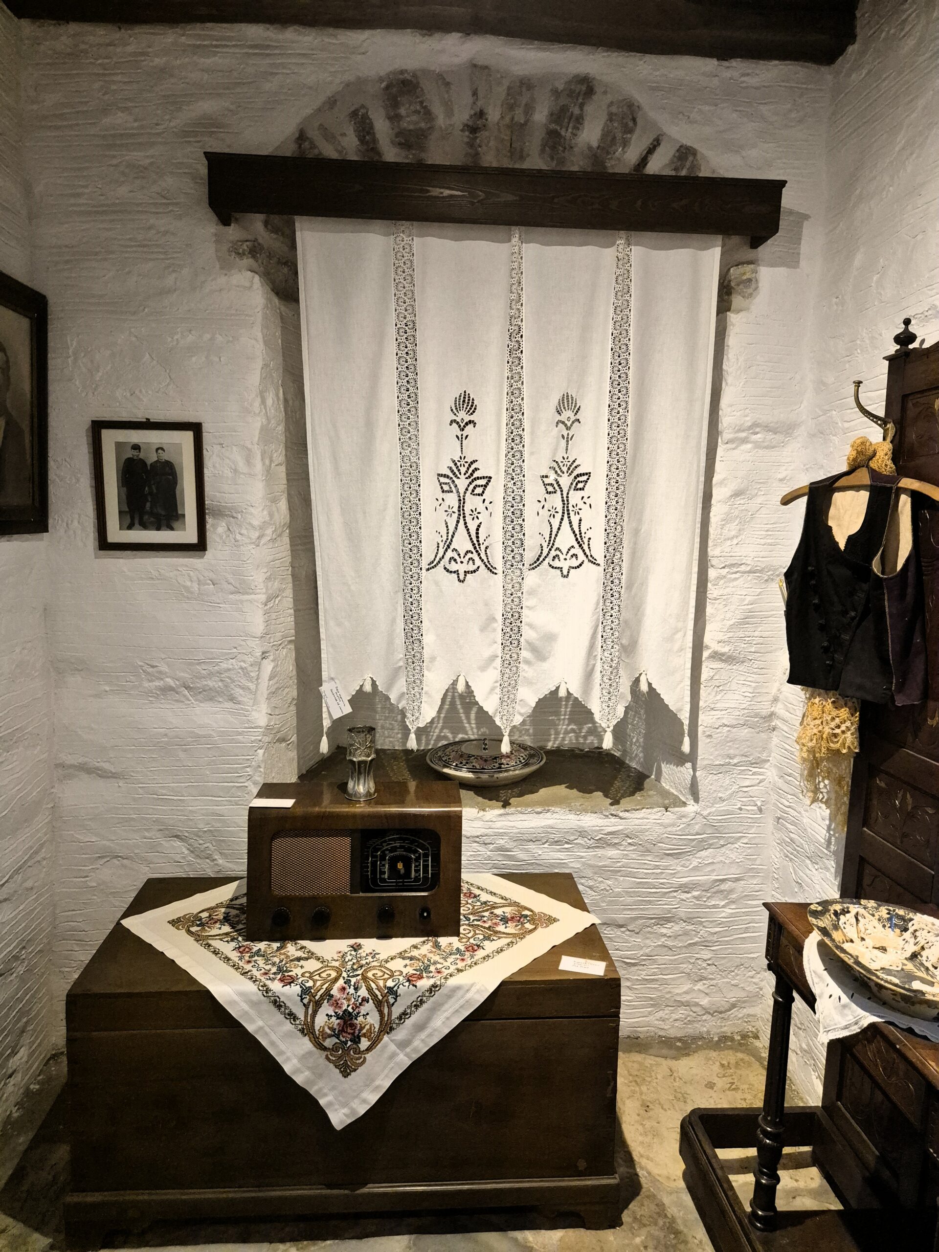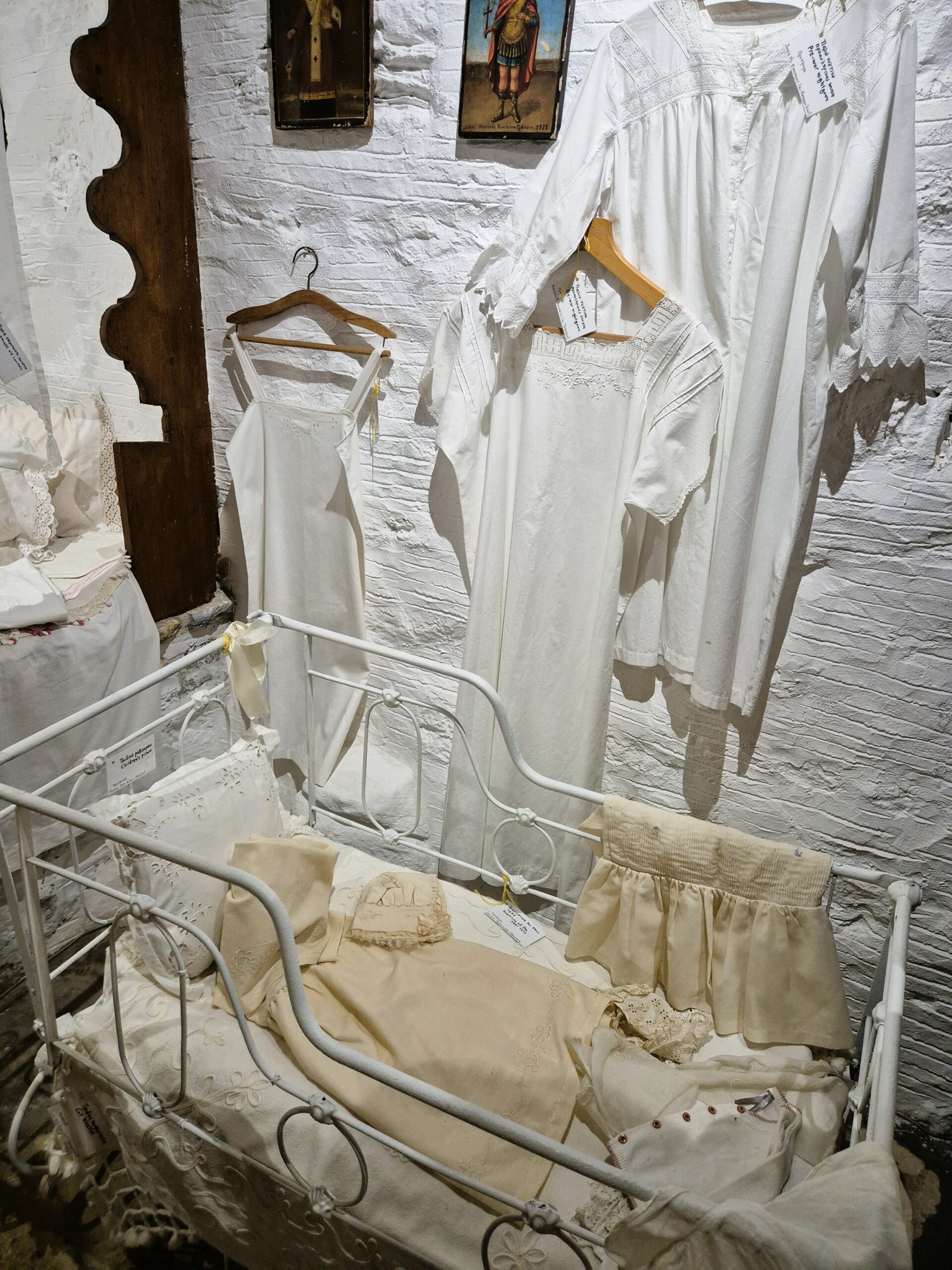 Πλάι του, μια καλοδιατηρημένη βρεφική κούνια, βαφτιστικά ρούχα του 1932, γαμήλια νυφικά του 1936, παλιές σερβάντες διακοσμημένες με εργόχειρα αληθινά έργα τέχνης, παλιά σερβίτσια, αλλά και το πρώτο ραδιόφωνο που ήρθε στο χωριό και λειτουργούσε με μπαταρίες. Στην κεντρική τραπεζαρία δεν μπορείς παρά να θαυμάσεις ένα τραπεζομάντηλο – σωστό οικογενειακό κειμήλιο 200 ετών, αλλά και στα γύρω ξυλόγλυπτα έπιπλα τα παλιά μαξιλάρια, κεντημένα με παραστάσεις από το φυσικό τοπίο της Νάξου. Η ξεναγός μας στο μουσείο κ. Δέσποινα Προμπονά, μας βεβαιώνει ότι τα ελάφια που αναπαρίστανται σε κάποια, όντως, υπήρχαν στην περιοχή. Προικιά, κοφτά, λεπτεπίλεπτες δαντέλες, παραδοσιακές στολές, όλα φινετσάτα, φτιαγμένα με μεράκι και κόπο, μάρτυρες της εποχής όπου η τέχνη του χειροποίητου δεν είχε χάσει την άνιση μάχη με τη μαζική παραγωγή. Το πιστοποιούν, από τη μια η ρόκα και το αδράχτι με τα οποία φτιαχνόταν νήμα από μαλλί για πλέξιμο αλλά και για τα υφαντά του αργαλειού, ο οποίος εκτίθεται λίγο παρακάτω, κι από την άλλη η εξέλιξη της τεχνολογίας με τη μορφή μιας παλιάς ραπτομηχανής.