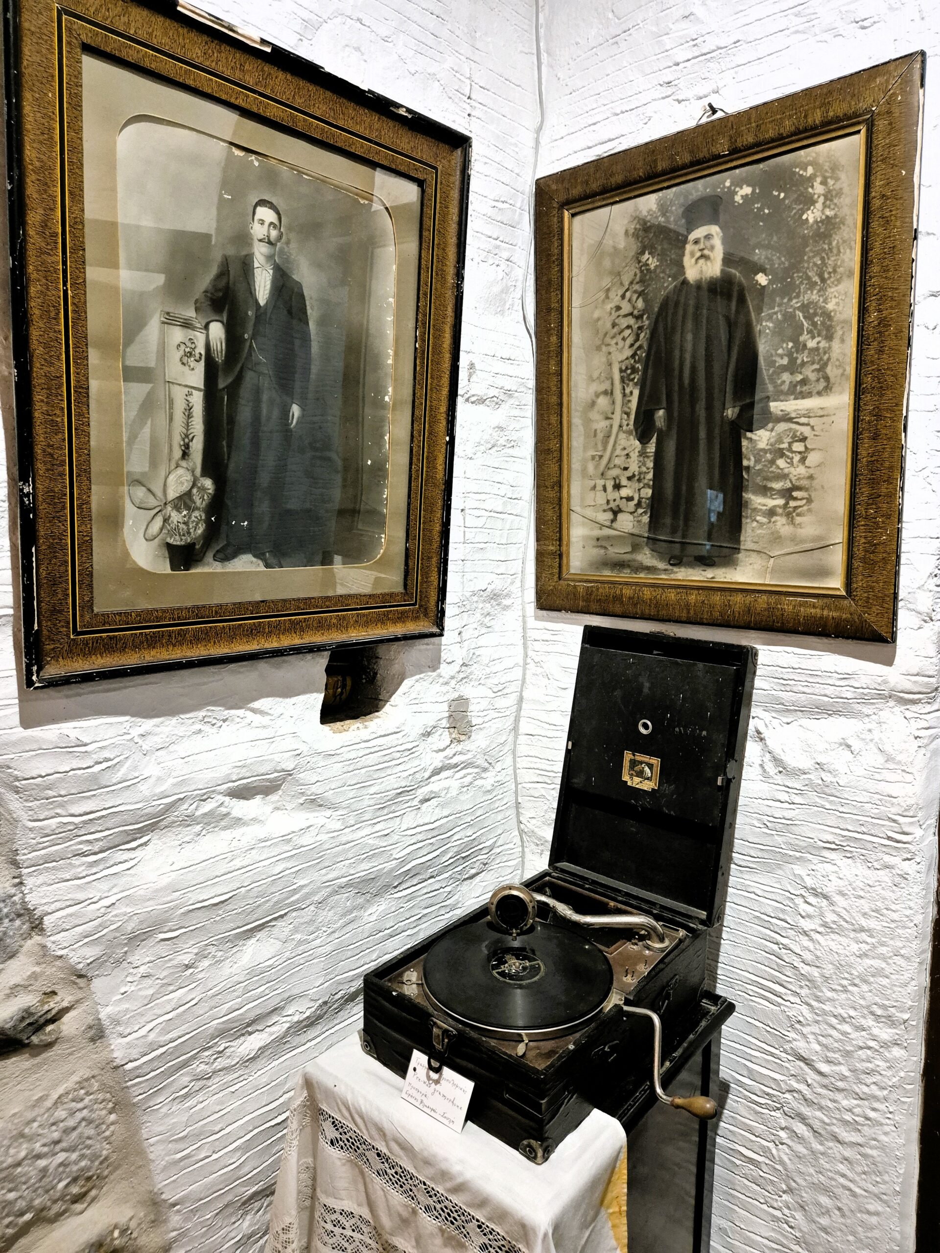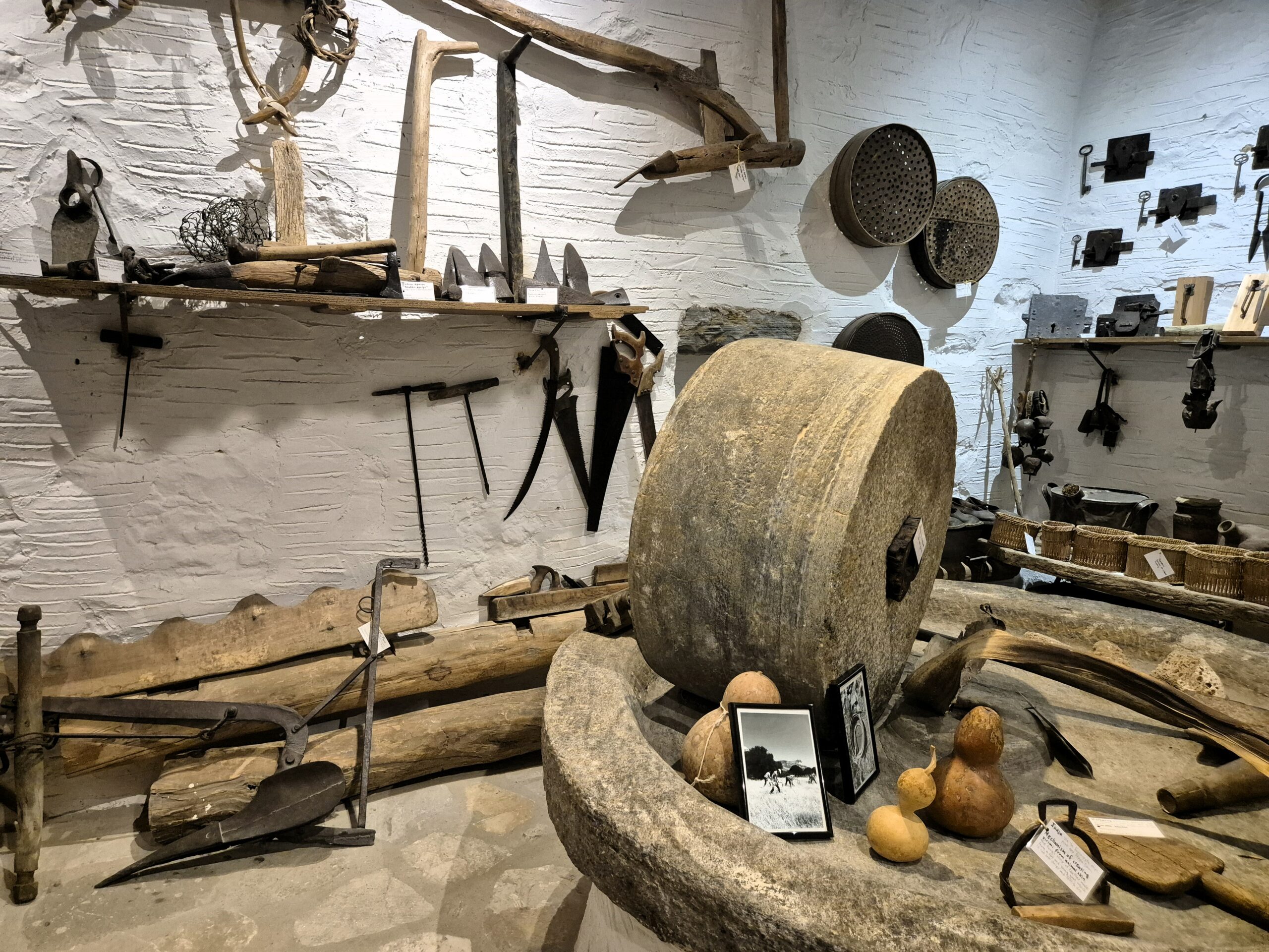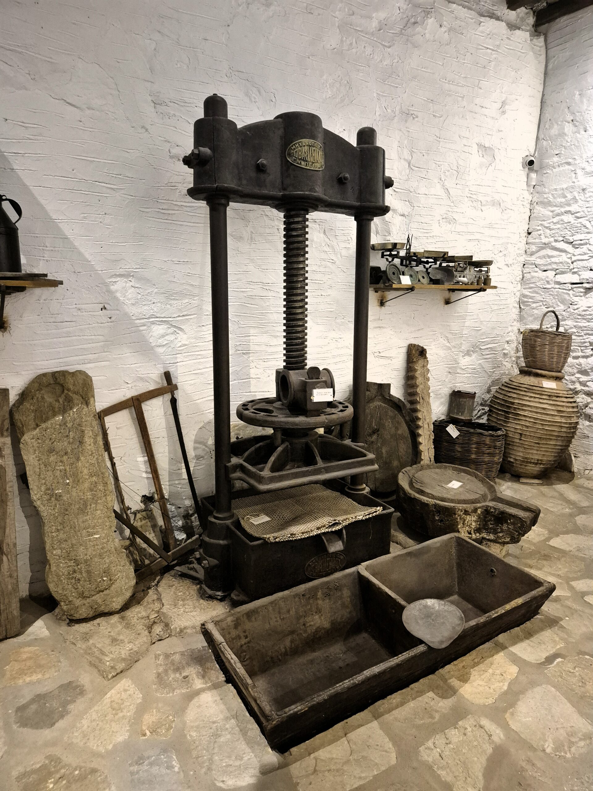 Δεν λείπουν ούτε το παλιό γραμμόφωνο, η τσαμπούνα, το ταμπούκι από δέρμα ζώου -το χειροποίητο, κρουστό, ποιμενικό μουσικό όργανο- και οι παλιές ζυγαριές. Και αυτές, όπως και το μαγκάλι στο θολωτό πετρόχτιστο τζάκι, το λαδοφάναρο, οι λάμπες πετρελαίου, τα παλιά μπακιρένια σκεύη, οι κουτάλες από κέρατα ζώων, ο χειρόμυλος για το άλεσμα μικροποσοτήτων σιτηρών στο σπίτι, το ξύλινο ψυγείο πάγου, τα πήλινα κιούπια όλων των μεγεθών για το λάδι, τα ξερά σύκα και το κρασί, και το πιο πρωτότυπο όλων, το πήλινο σφούνι για την άντληση του κρασιού, αποτελούσαν αναπόσπαστο μέρος της καθημερινότητας κάθε νοικοκυριού.
