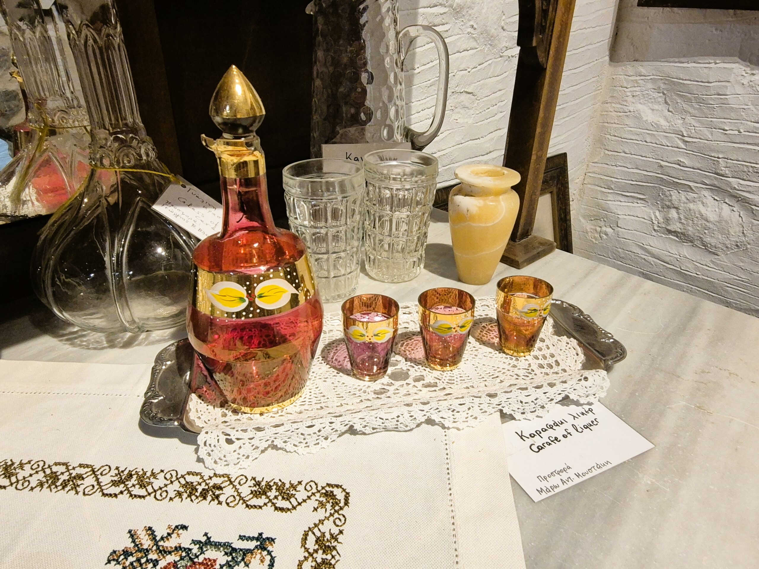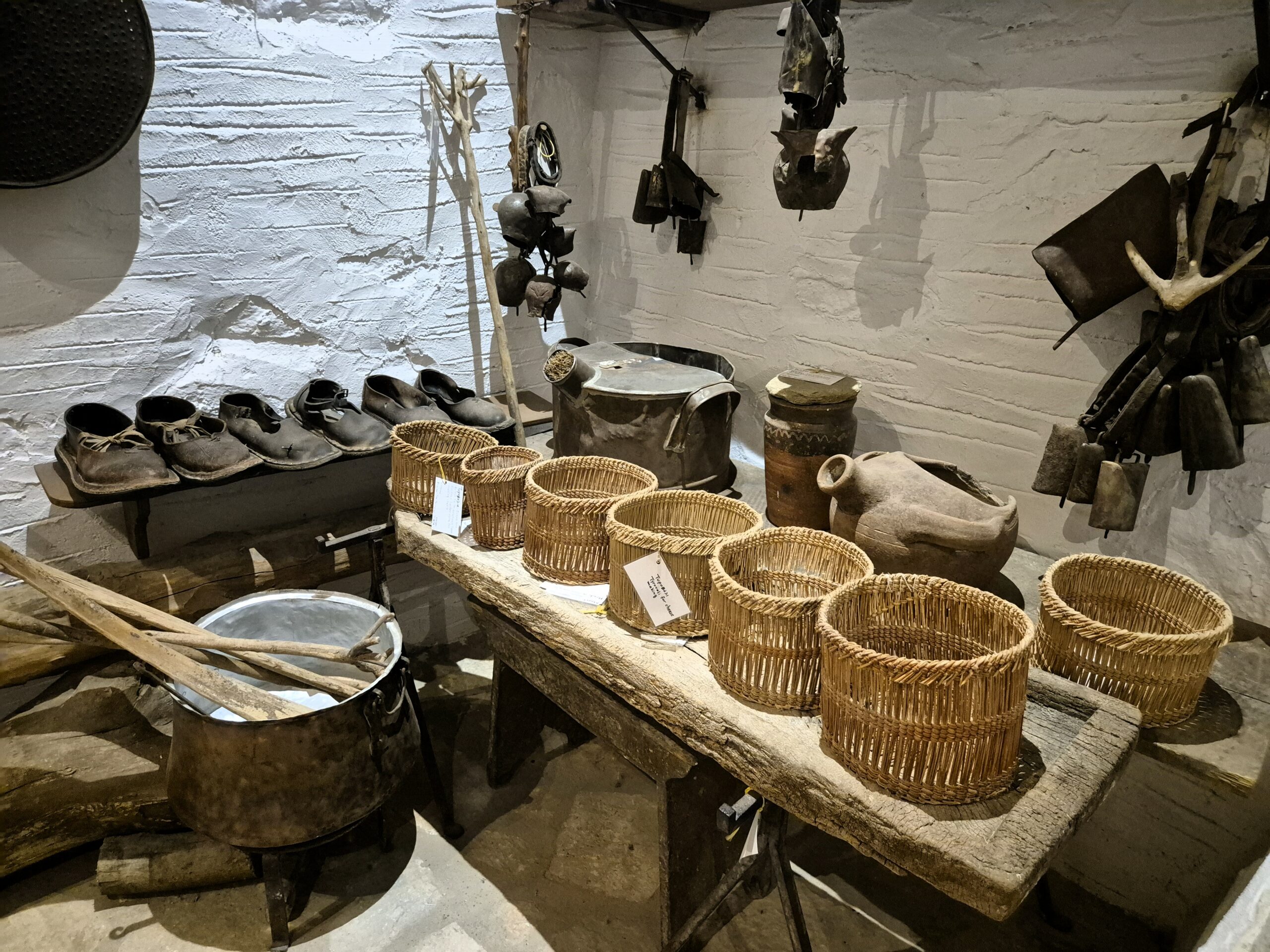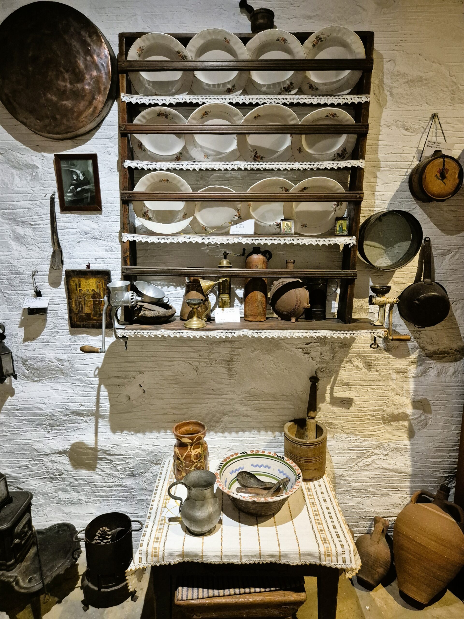 Δεν λείπουν ούτε το παλιό γραμμόφωνο, η τσαμπούνα, το ταμπούκι από δέρμα ζώου -το χειροποίητο, κρουστό, ποιμενικό μουσικό όργανο- και οι παλιές ζυγαριές. Και αυτές, όπως και το μαγκάλι στο θολωτό πετρόχτιστο τζάκι, το λαδοφάναρο, οι λάμπες πετρελαίου, τα παλιά μπακιρένια σκεύη, οι κουτάλες από κέρατα ζώων, ο χειρόμυλος για το άλεσμα μικροποσοτήτων σιτηρών στο σπίτι, το ξύλινο ψυγείο πάγου, τα πήλινα κιούπια όλων των μεγεθών για το λάδι, τα ξερά σύκα και το κρασί, και το πιο πρωτότυπο όλων, το πήλινο σφούνι για την άντληση του κρασιού, αποτελούσαν αναπόσπαστο μέρος της καθημερινότητας κάθε νοικοκυριού.