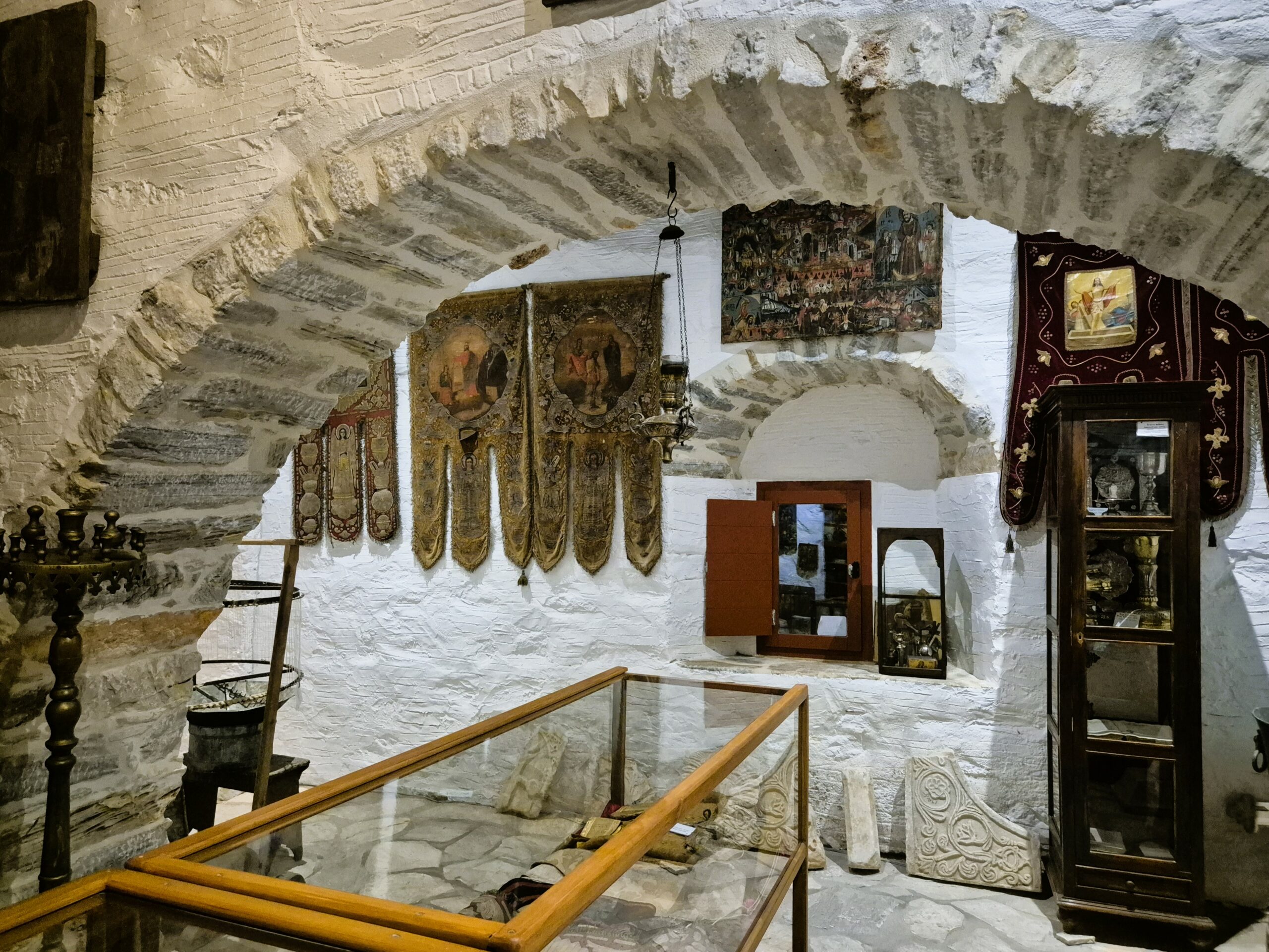 Πριν το πέρασμα στο δεύτερο τμήμα του μουσείου, όπου παρουσιάζονται τα παραδοσιακά επαγγέλματα, μεσολαβεί η ενδιαφέρουσα ενότητα του Εκκλησιαστικού Μουσείου. Είναι η αίθουσα όπου μπορεί κανείς να θαυμάσει λειτουργικά σκεύη και κειμήλια που χρονολογούνται στον 19ο αιώνα, περίτεχνα κεντημένα άμφια διαφόρων περιόδων, κάποια εκ των οποίων ρωσικής προέλευσης, εκκλησιαστικά βιβλία, τάματα, παλιές εικόνες από κοντινά μοναστήρια και κολυμπήθρες όπου βαφτίστηκαν πολλοί Φιλωτίτες. Την προσοχή μεταξύ των εκθεμάτων τραβά ένας κηροπλάστης, ένα μανουάλι του 1928 και μια σπάνια εικόνα του 1790. Πρόκειται για μια ιδιαίτερη κατασκευή πάνω σε μέταλλο που αναπαριστά τη δίκη του Χριστού, με προέλευση από την Κωνσταντινούπολη. Στο σημείο αυτό, η κ. Δέσποινα κάνει μια άκρως ενδιαφέρουσα παρένθεση για να μας διευκρινίσει τη σχέση με την Κωνσταντινούπολη όπως και με τη Μικρά Ασία των Φιλωτιτών, οι οποίοι: οι μεν άντρες έβρισκαν εκεί δουλειά ως αμπελοκαλλιεργητές, οι δε κοπέλες δούλευαν σε σπίτια Γάλλων για να φτιάξουν την προίκα τους.