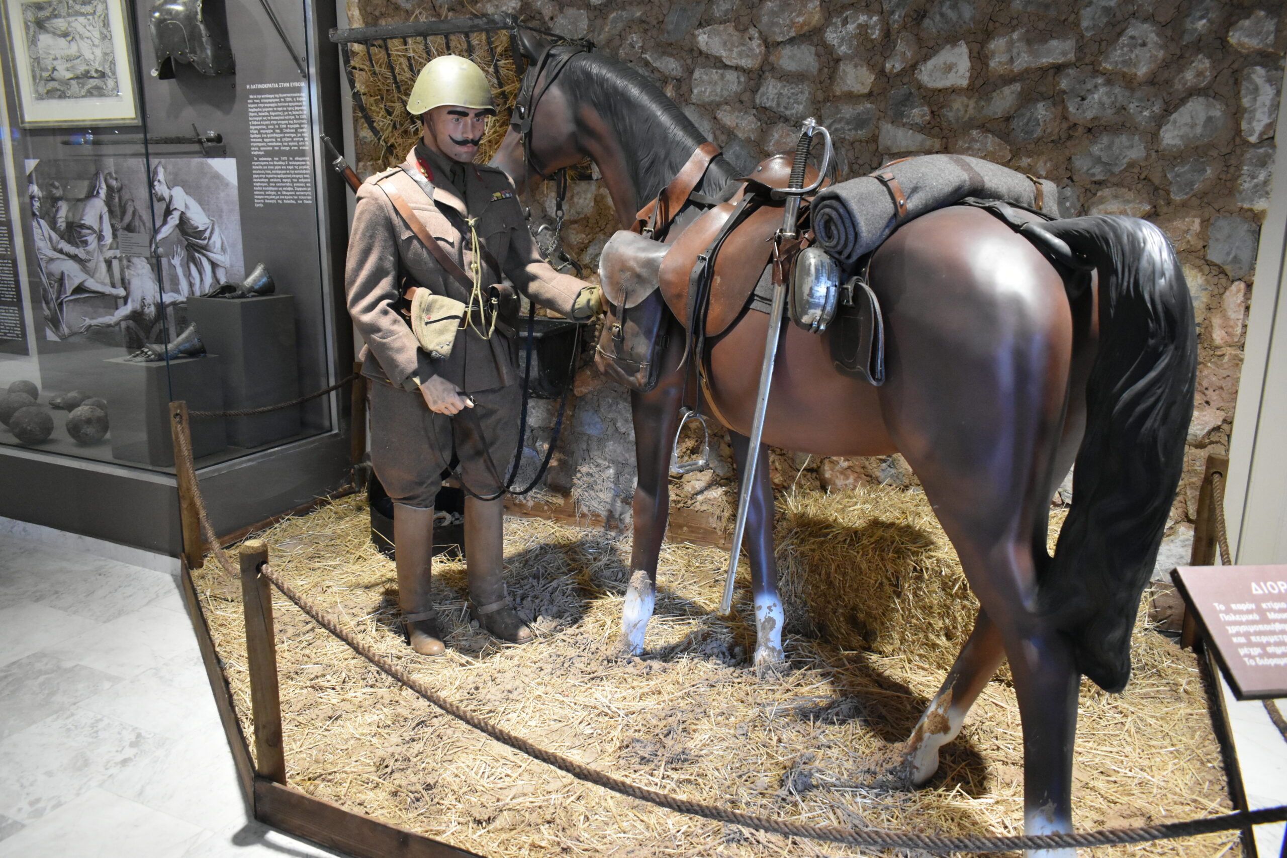 Όσο για τις πολεμικές σημαίες στις τελευταίες βιτρίνες, προέρχονται από ειρηνευτικές αποστολές στις οποίες συμμετείχαν μονάδες του ελληνικού στρατού και είναι αυτές που κλείνουν τη συλλογή, μαζί με μια σύντομη παρουσίαση της ιστορίας της σχολής πεζικού στην οποία ανήκει το κτήριο. Η επίσκεψη – φόρος τιμής στους πολεμιστές προγόνους μας ολοκληρώνεται στον περίβολο του μουσείου, όπου πέρα από τα δύο άρματα μάχης μπορεί κάποιος να δει τμήμα της μεσαιωνικής οχύρωσης της Χαλκίδας.