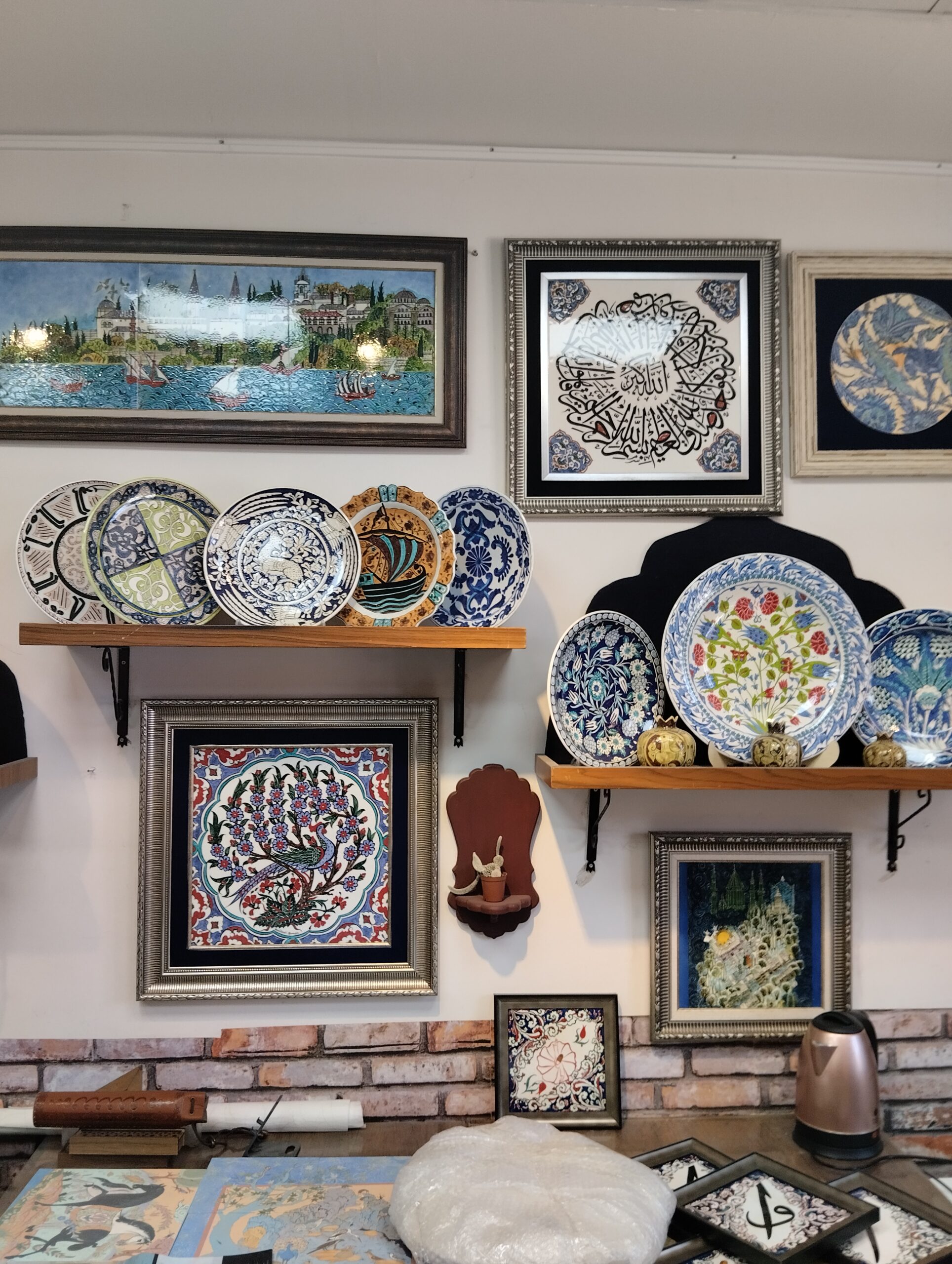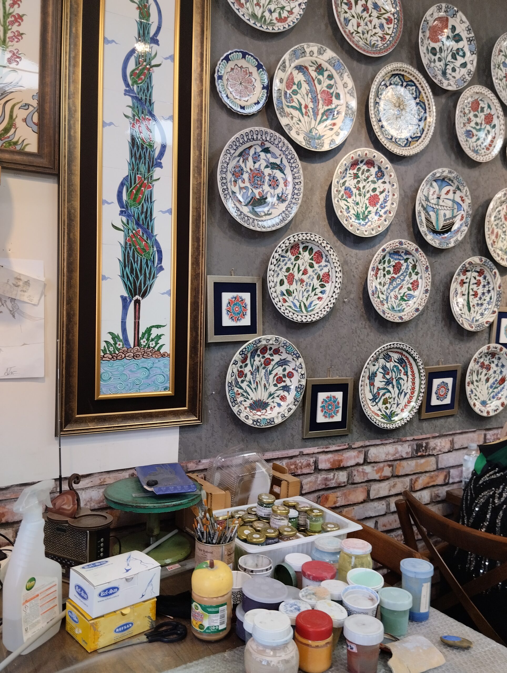 Μπροστά από έναν τοίχο γεμάτο με ζωγραφιστά πιάτα, συστηνόμαστε με την υπεύθυνη του εργαστηρίου και συζητάμε για την διακοσμητική κεραμική, τις εφαρμογές και τις προοπτικές της μαθαίνοντας με εμφανή έκπληξη ότι ο ήσυχος πρωτομάστορας παραδίπλα μας ήταν ο ίδιος που είχε φιλοτεχνήσει τα κεραμικά πλακάκια του υπόγειου σταθμού του μετρό της Κωνσταντινούπολης στην πλατεία Ταξίμ. Μια ακόμη απόδειξη ότι μια παραδοσιακή τέχνη έχει με το παραπάνω θέση σε μια πλήρως αναπτυγμένη πόλη. Έχοντας φθάσει η ώρα να επιστρέψουμε στο ατελιέ της κυρίας Ραμπία, χαιρετάμε ευγενικά την καλυμμένη κυρία που μας υποδέχτηκε στο εργαστήριο, ενώ ο πρωτομάστορας απορροφημένος στην μαγεία της δημιουργίας δεν μας δίνει καμία σημασία.