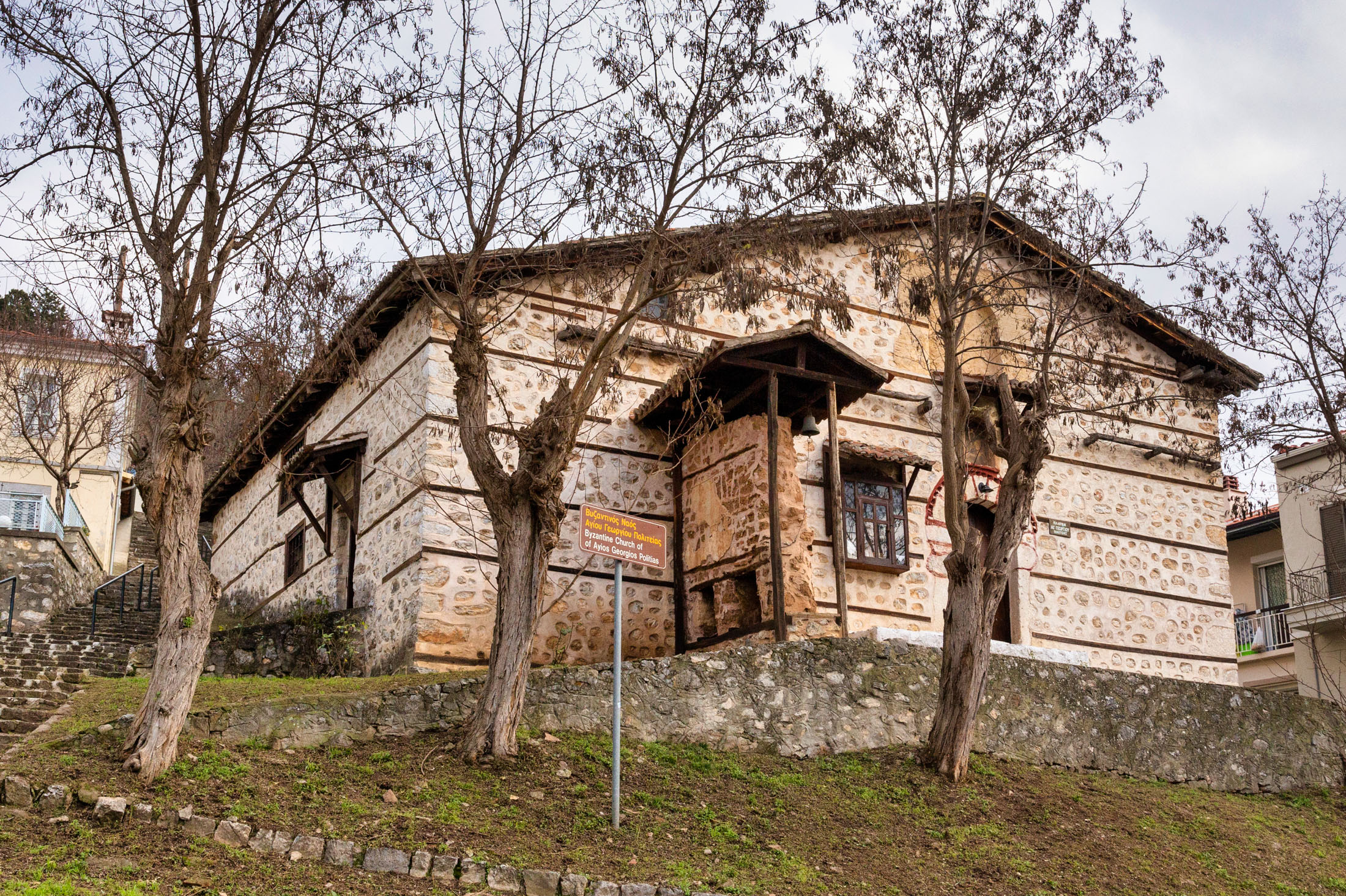 Σε μικρή απόσταση από τον Άγιο Στέφανο βρίσκεται η τρίκλιτη βασιλική -με νάρθηκα από τη βόρεια πλευρά- του Αγίου Γεωργίου Πολιτείας. Η εκκλησία χρονολογείται αρχικά τον 11ο αιώνα και ακολουθούν και άλλες περίοδοι οικοδόμησης με την πιο ενδιαφέρουσα αυτή του 19ου αιώνα, όπου ο ναός επεκτείνεται αισθητά και διακοσμείται εσωτερικά κατά τα πρότυπα των αρχοντικών. Η οροφή του ναού είναι θολωτή, στηρίζεται σε ξύλινους κίονες και στεγάζει την αγία τράπεζα. Για μικρό διάστημα επί Τουρκοκρατίας λειτούργησε ως μητροπολιτικός ναός της Καστοριάς.