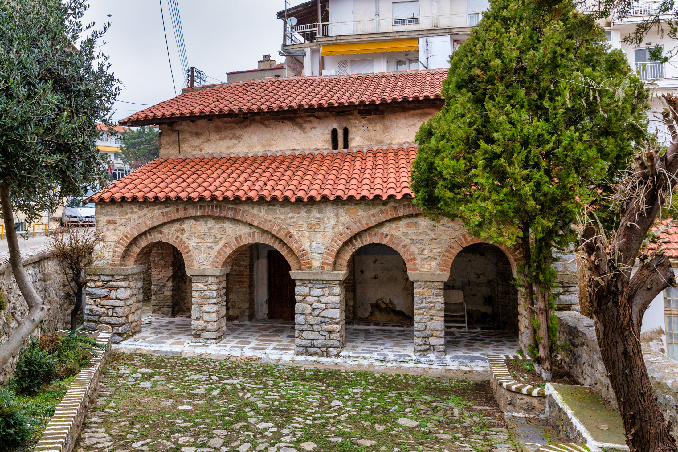 Πρόκειται για μονόχωρη, ξυλόστεγη βασιλική -που τιμάται στη μνήμη των τριών Αγίων Γουρίου, Σαμωνά και Αβίβου– με μεταγενέστερες προσθήκες στη βόρεια και τη νότια πλευρά. Ο ναός εσωτερικά ήταν διακοσμημένος με τοιχογραφίες, που όμως καλύφθηκαν με ασβέστη τα νεότερα χρόνια. Μετά από εργασίες συντήρησης ήρθαν στο φως φιγούρες Αγίων. Χρόνος δημιουργίας των τοιχογραφιών είναι το 1401 και ανήκουν στο αντικλασικό ρεύμα ζωγραφικής της ύστερης περιόδου των Παλαιολόγων. Εκτιμάται πως και την ίδια εποχή κτίστηκε και ο ναός.