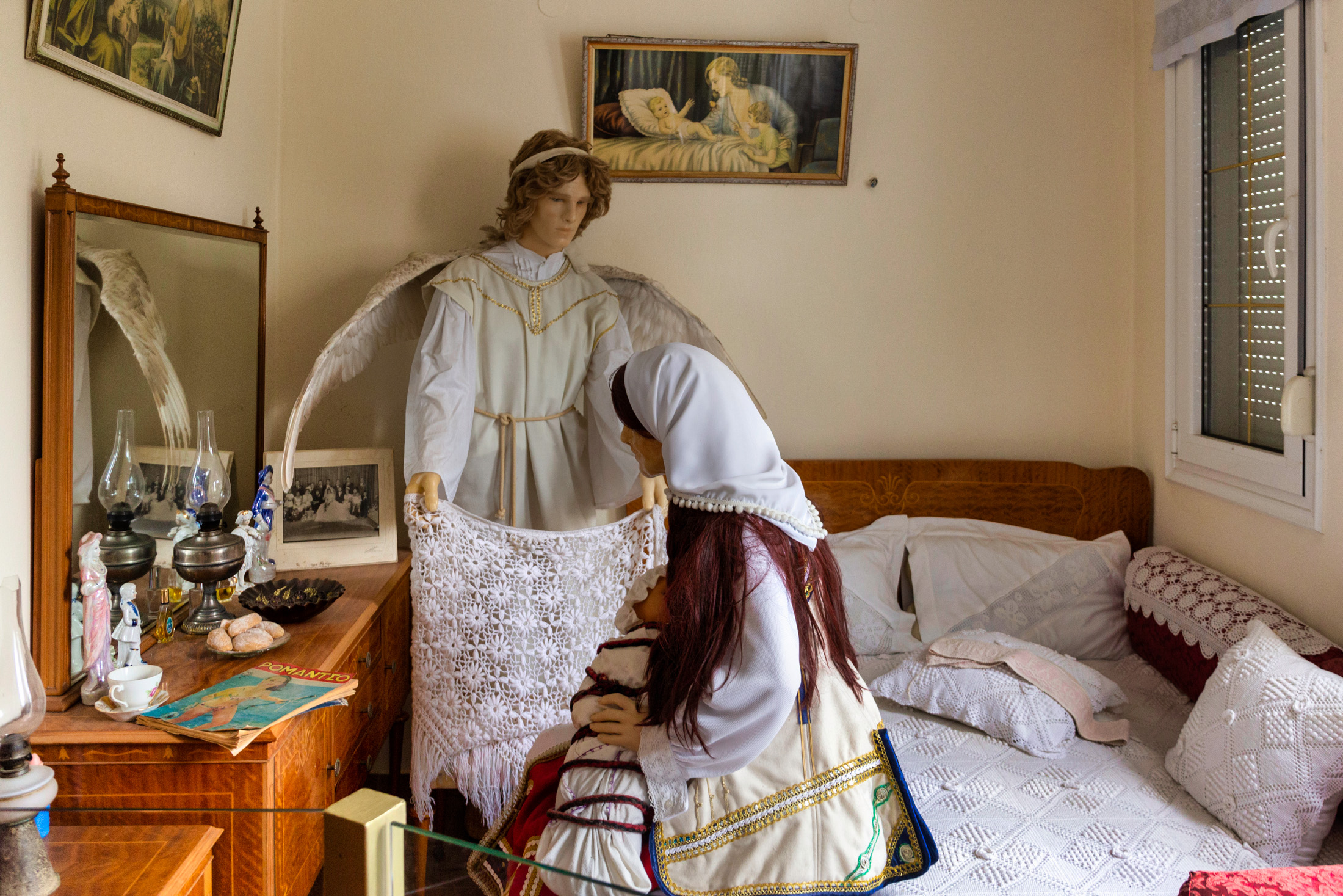 Στον επάνω όροφο παρουσιάζονται το νυφικό δωμάτιο, ο καλός οντάς όπου η οικογένεια υποδέχεται επισκέπτες και δίπλα το δωμάτιο των παππούδων που φροντίζουν τα εγγόνια, καθώς και το δωμάτιο του αργαλειού. Δίπλα, με μία ωραία και τρυφερή σκηνή της καθημερινότητας, η μητέρα φασκιώνει το μωρό και ο φύλακας άγγελος του σπιτιού, βρίσκεται δίπλα τους.