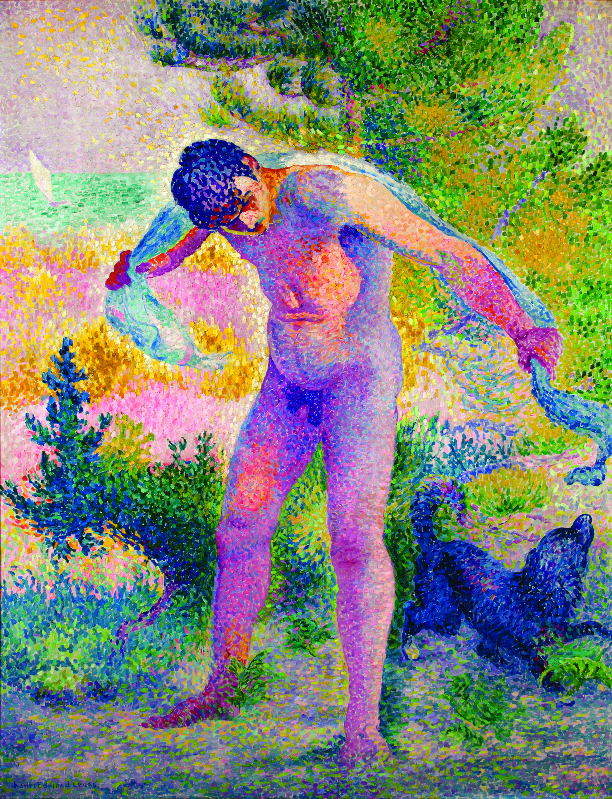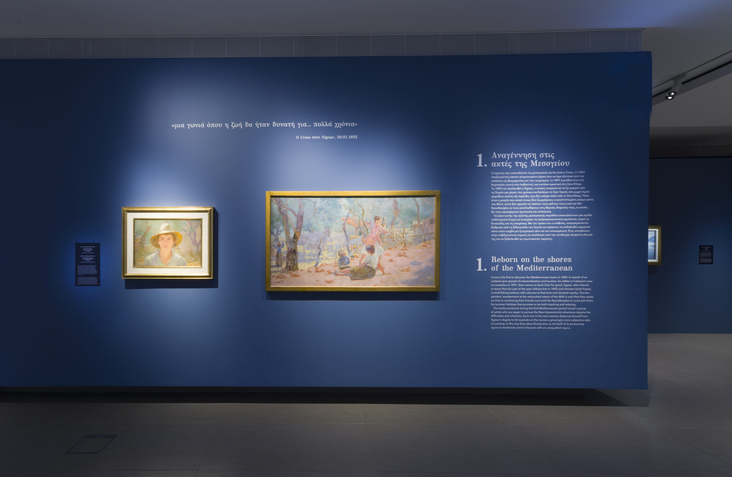 Με τον Cross να ανοίγει το δρόμο στα τέλη του 19ου αιώνα, ανακαλύπτοντας πρώτα το Καμποσόν κι ύστερα το Σαιν Κλαιρ στην Κυανή Ακτή, το μεσογειακό κλίμα που αρχικά προτιμούνταν από ανθρώπους με προβλήματα υγείας, προσελκύει όλο και περισσότερους φίλους της τέχνης. Εκείνοι, γοητευμένοι από τα έντονα χρώματα, το φως και τους γαλήνιους ρυθμούς μακριά από την επέλαση της βιομηχανίας και του τουρισμού, εκφράζονται με μια ζωγραφική βαθιά πλέον ριζωμένη στις αισθήσεις και στην υποκειμενικότητα. Η επαφή με τον ήλιο της Μεσογείου, όπως μας αποκαλύπτει η παρούσα έκθεση, εμπνέει τους καλλιτέχνες του κινήματος να εμβαθύνουν στις εικαστικές αναζητήσεις τους, να χρησιμοποιήσουν ζωηρότερα χρώματα και περισσότερες αντιθέσεις. Η Cote d’ Azur μετατρέπεται σταδιακά σε ένα μεγάλο, υπαίθριο καλλιτεχνικό εργαστήριο.