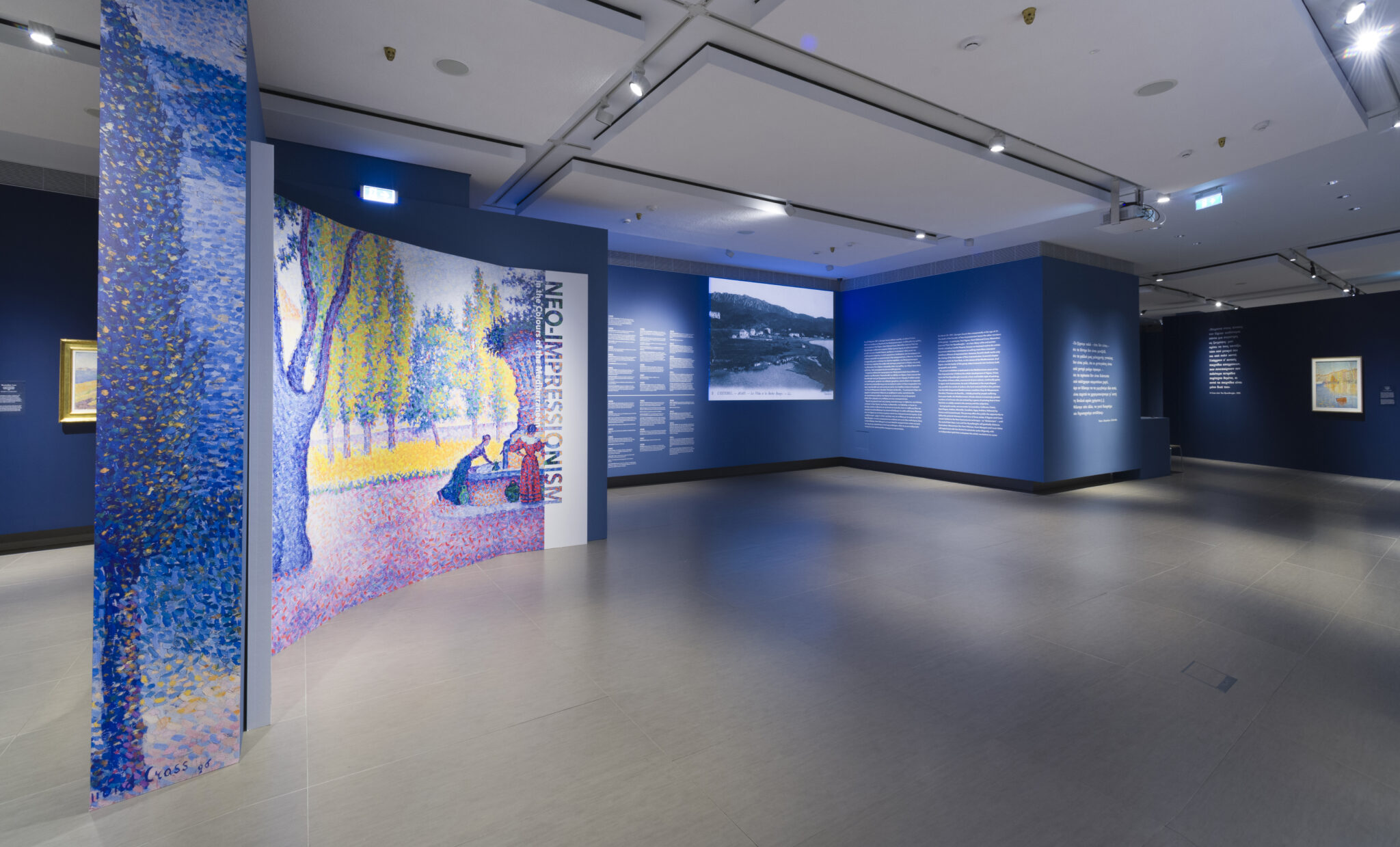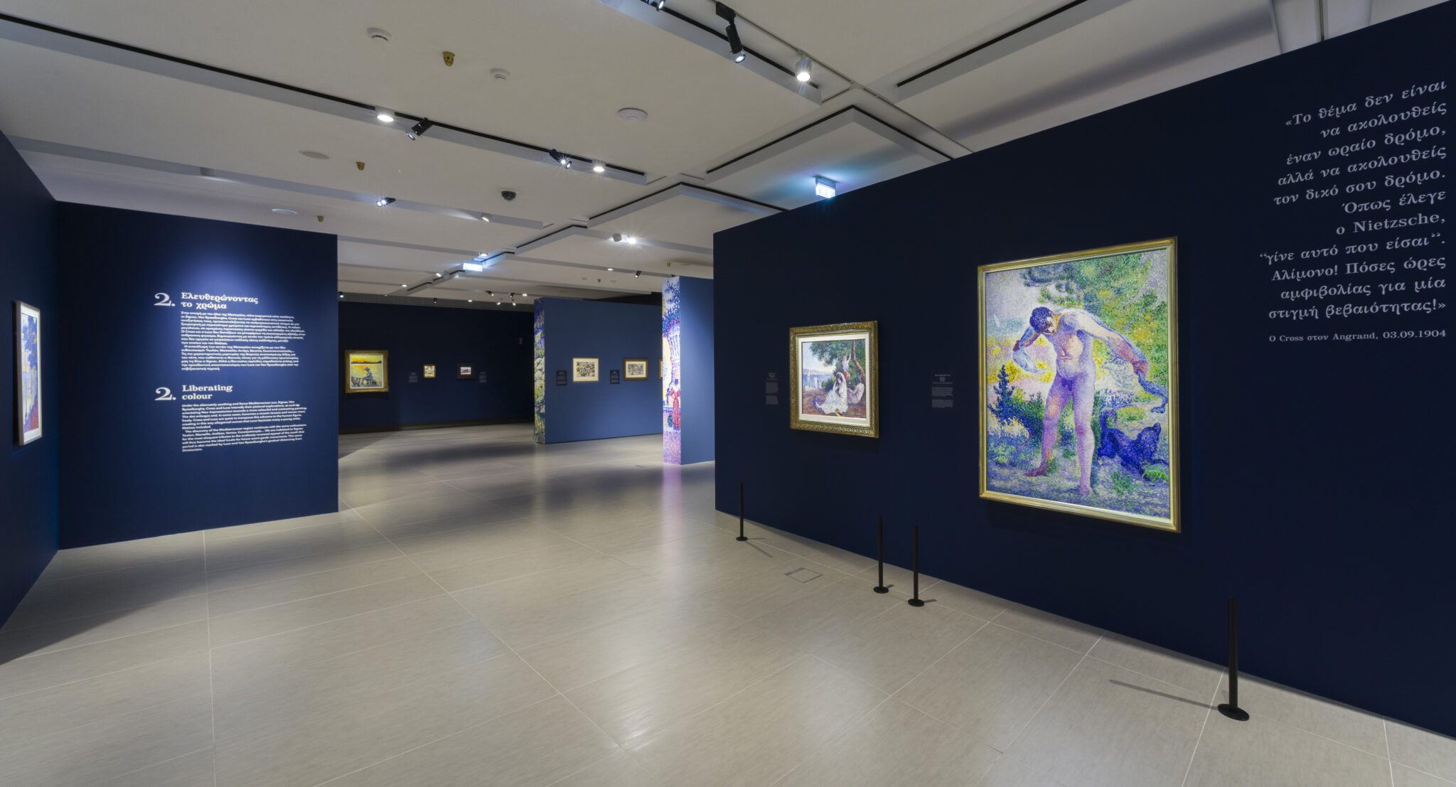 Η εξαιρετική αυτή έκθεση συστήνει στο ευρύ κοινό το κίνημα που διαφοροποιήθηκε από τον Ιμπρεσιονισμό, λαμβάνοντας το όνομα που προτάθηκε αρχικά από τον Γάλλο κριτικό τέχνης Félix Fénéon, διαχωρίζοντας σαφώς τις δύο καλλιτεχνικές τάσεις. Ο επισκέπτης έχει τη δυνατότητα να θαυμάσει συγκεντρωμένα στον ίδιο χώρο, έργα των Paul Signac, Henri-Edmond Cross, Maximilien Luce, Théo van Rysselberghe, Henri Matisse, Henri Manguin και Louis Valtat, που από κοινού δίνουν υπόσταση στο δεύτερο κεφάλαιο του Νεοϊμπρεσιονισμού, όπως εκτυλίχθηκε μετά το 1891 και τον αιφνίδιο θάνατο του θεμελιωτή του, Georges Seurat. Και όπως διαπιστώνουμε με το παρόν αφιέρωμα, η δεύτερη αυτή φάση που άνθισε στα παράλια της Μεσογείου και της οποία ηγήθηκε ο Signac, ανέδειξε νέους ορίζοντες, τόσο γεωγραφικούς όσο και καλλιτεχνικούς.