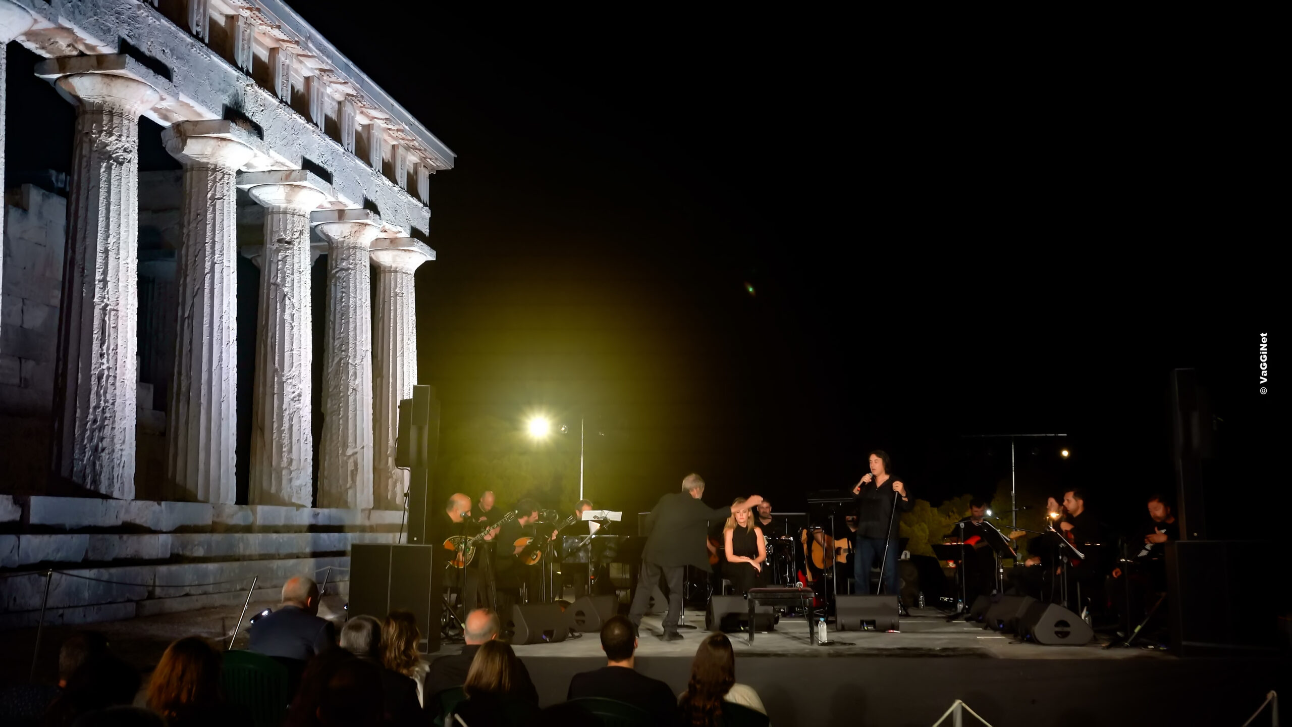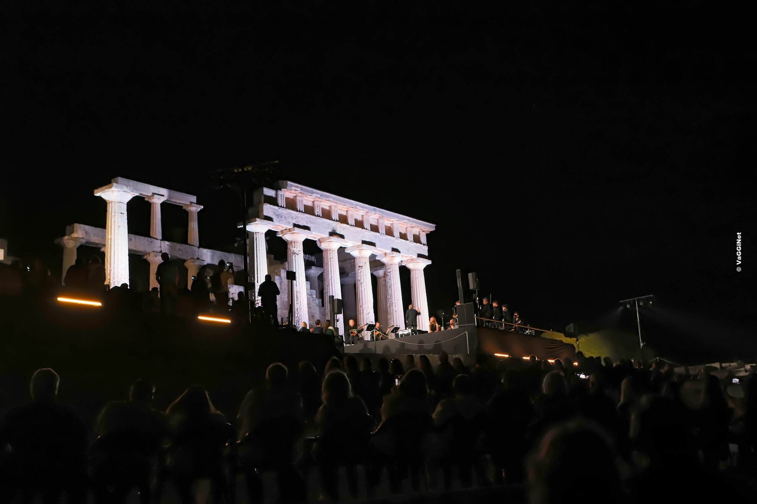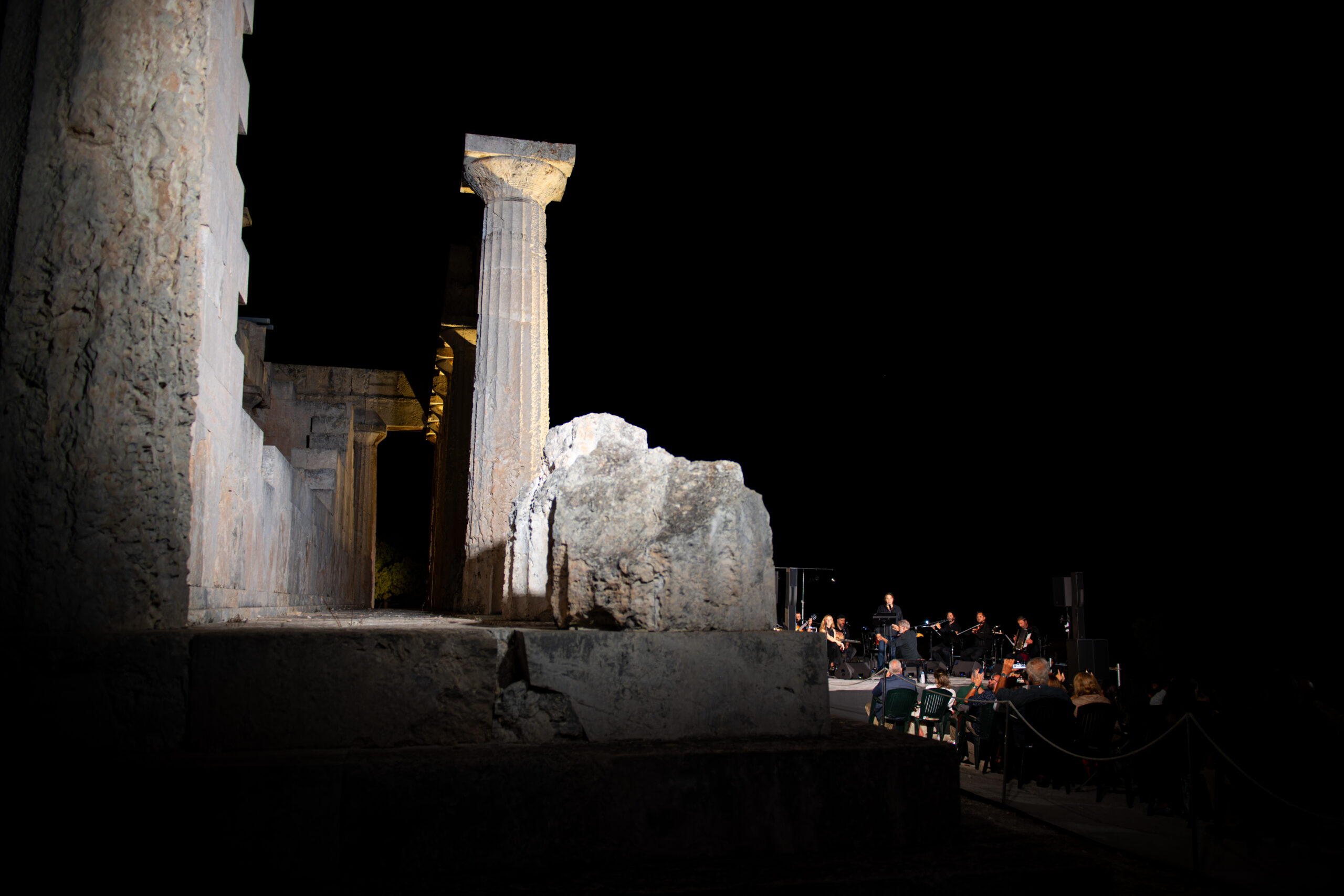 Τι θα μπορούσε άραγε να τον αναδείξει περισσότερο από το ίδιο το φως του σημερινού μας πολιτισμού; Ήταν ακριβώς αυτό το διάχυτο, θερμό φως που έλουζε το βράδυ του Σαββάτου 12 Οκτωβρίου τον αποστομωτικά όμορφο, φωταγωγημένο Ναό της Αφαίας στην Αίγινα, φέρνοντας στο μυαλό των παρευρισκομένων το φως του αρχαίου ελληνικού πολιτισμού, που ακόμα σήμερα λούζει με τη διαχρονικότητα και τη ζεστασιά του τη ζωή όλου του δυτικού κόσμου. Μέσα σε ένα πυκνό δάσος γεμάτο πεύκα, στη βορειοανατολική πλευρά του νησιού, με φόντο ένα μνημείο-ζωντανό ποίημα, περίπου 200 θεατές είχαν την ευκαιρία να παρακολουθήσουν μια αξέχαστη συνάντηση της μουσικής με την υψηλή στιχουργική, υπό τη διεύθυνση του σπουδαίου Σταύρου Ξαρχάκου.