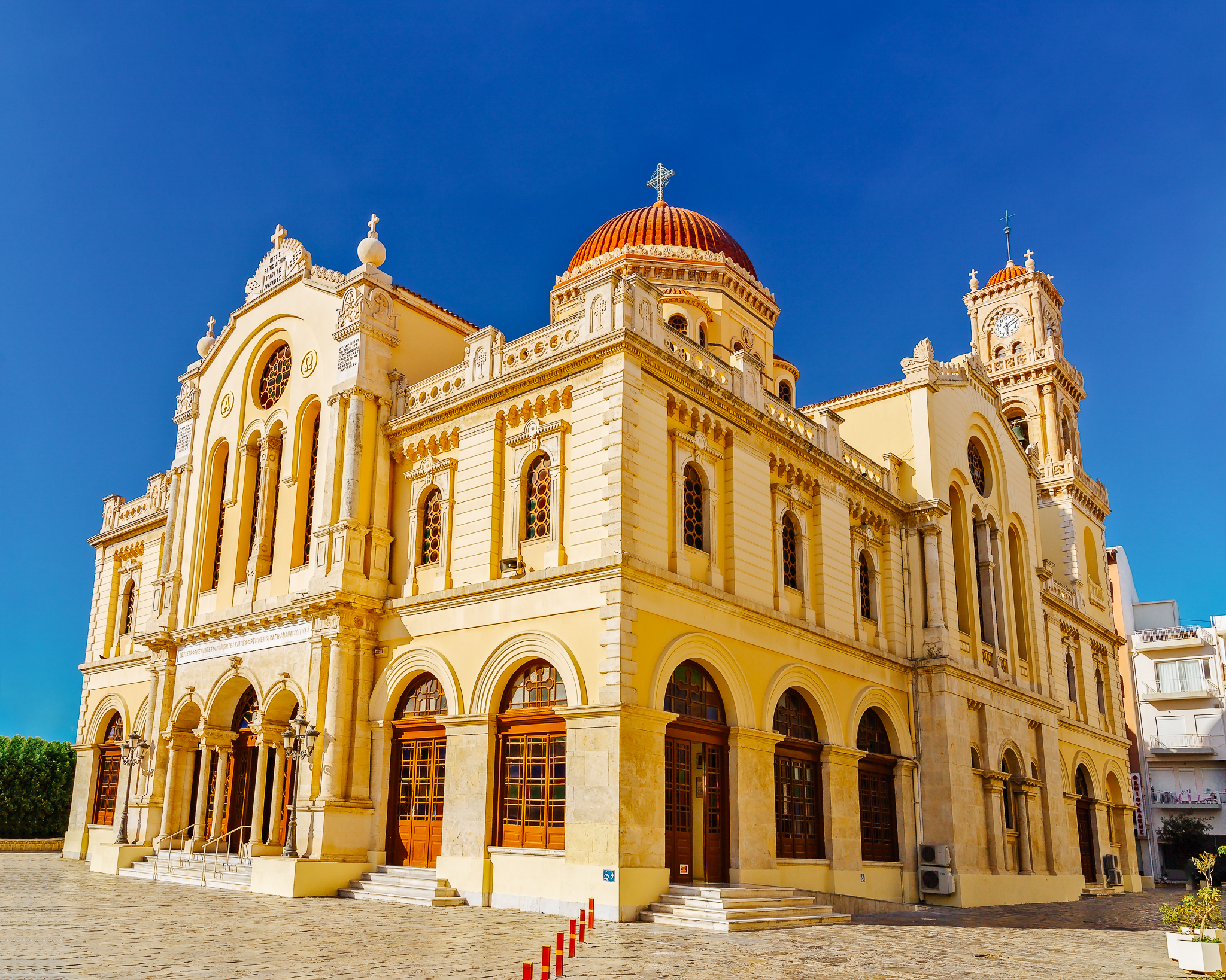 Ο Μητροπολιτικός Ναός του Ηρακλείου είναι ένα από τα πιο ενδιαφέροντα σημεία στην πόλη του Ηρακλείου, γιατί συνδυάζει την βυζαντινή εκκλησιαστική αισθητική με μεσογειακά μπαρόκ στοιχεία συνθέτοντας ένα πρωτότυπο μίγμα που αξίζει οπωσδήποτε μια επίσκεψη. Χτισμένος με έξοδα των χριστιανών της πόλης, ο ναός ξεκίνησε να χτίζεται το 1862, ενώ τέσσερα χρόνια αργότερα, η ανέγερσή του διακόπηκε λόγω της Κρητικής Επανάστασης του 1866. Χρειάστηκε να περάσουν σχεδόν 30 χρόνια, μέχρι το 1895, οπότε και ο ναός εγκαινιάστηκε από τον τότε Μητροπολίτη Κρήτης, Τιμόθεο Α’, ενώ σήμερα το εσωτερικό του ναού εντυπωσιάζει χάρη στα σκούρα χρώματα των τοιχογραφιών του.