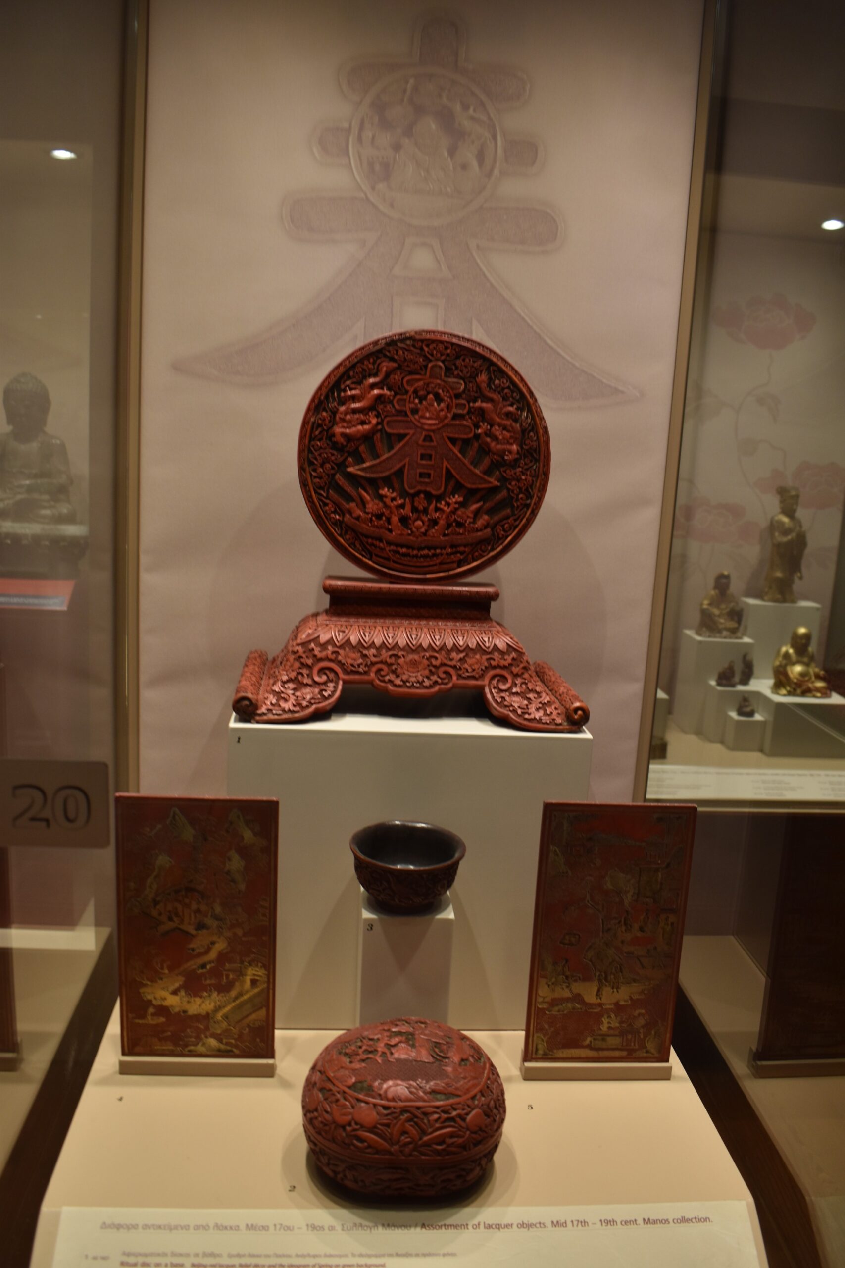 Καθώς τα εκθέματα διαδέχονται το ένα το άλλο, κινούν όλο και περισσότερο το ενδιαφέρον του επισκέπτη για τις διαφορετικές κουλτούρες που παρουσιάζονται και τους δεσμούς μεταξύ τους. Ξεκινώντας από τον πρώτο όροφο του ανακτόρου, η ανατολική πτέρυγα είναι αφιερωμένη στην κινεζική Συλλογή του Γρηγορίου Μάνου. Ένα πανόραμα αντικειμένων κινεζικής τέχνης που καλύπτει μια περίοδο 30 αιώνων, ξετυλίγεται μπροστά στα μάτια σας ακολουθώντας χρονολογική σειρά. Θα θαυμάσετε κεραμικά, σπάνιες πορσελάνες, λίθινα και ορειχάλκινα αγαλματίδια καθώς και άλλα από σμάλτο και νεφρίτη, μαζί με αντικείμενα από λάκα, ελεφαντόδοντο και ημιπολύτιμα υλικά, που όλα φανερώνουν τις μοναδικές και εξελιγμένες τεχνικές των κινεζικών εργαστηρίων. Από προϊστορικά αγγεία των Δυναστειών Σανγκ και Τανγκ ως τα πολύχρωμα πορσελάνινα βάζα των Δυναστειών Μινγκ και Τσινγκ, υπάρχουν άπειρες εξαιρετικές λεπτομέρειες σε αυτά τα εντυπωσιακά έργα που θα τραβήξουν την προσοχή σας. Η συλλογή ολοκληρώνεται με σπάνια κινέζικα νομίσματα -μη χάσετε αυτά σε σχήμα μικρού σπαθιού – και με τους διάσημους κυλίνδρους ζωγραφικής σε λεπτό χαρτί ή μετάξι.