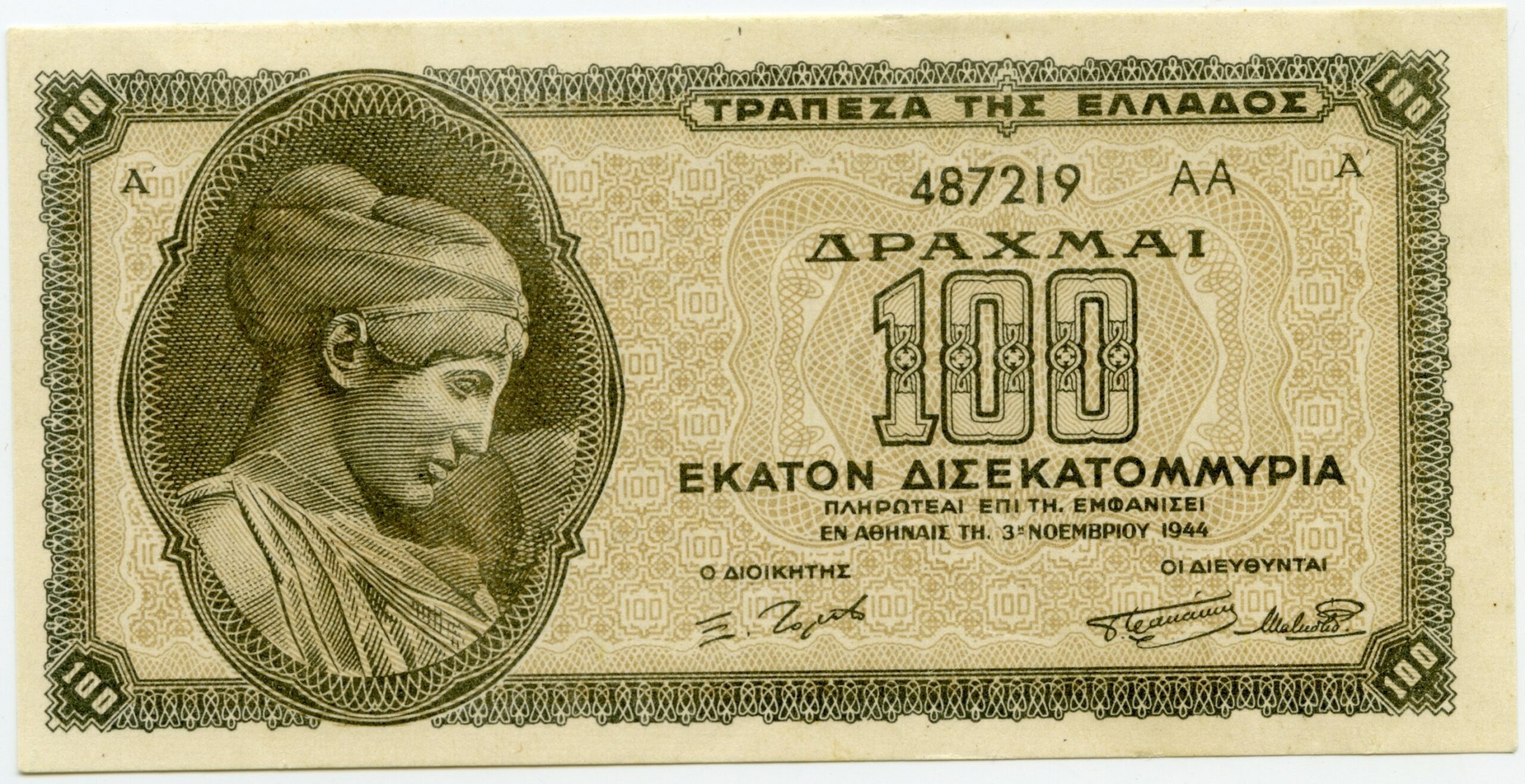Κατή τη ζοφερή περίοδο του Δεύτερου Παγκοσμίου Πολέμου η Ελλάδα δέχθηκε την εισβολή των Γερμανικών στρατευμάτων το 1941, οπότε και τα αποθέματα χρυσού της χώρας μεταφέρθηκαν πρώτα στην Κρήτη και ύστερα από την εισβολή και σε αυτή, στην Αίγυπτο, τη Νότιο Αφρική και εντέλει στο Λονδίνο, όπου παρέμειναν μέχρι το τέλος του πολέμου. Όπως ήταν αναμενόμενο η Ελληνική οικονομική πολιτική ελέγχονταν πλήρως από τους Γερμανούς, που είχαν αποκλειστικό σκοπό τη διασφάλιση επαρκών μέσων για την κάλυψη των αναγκών του πολέμου. Έτσι, προχώρησαν σε μια ανεξέλεγκτη έκδοση χαρτονομισμάτων που οδήγησε στο φαινόμενο του υπερπληθωρισμού. Προκειμένου να καλυφθούν οι ανάγκες της διαρκούς έκδοσης χρήματος, δούλευαν παράλληλα πολλά ελληνικά τυπογραφεία, εκδίδοντας 20 διαφορετικούς τύπους χαρτονομισμάτων, των οποίων η αξία κυμαίνονταν από 10.000 σε 100 δισεκατομμύρια δραχμές. Αυτό μάλιστα ήταν και το χαρτονόμισμα με τη μεγαλύτερη αξία που εκδόθηκε ποτέ. Στις προθήκες του μουσείου εκτίθεται ολόκληρη η σειρά αυτών των χαρτονομισμάτων, μαζί με άλλα ίσης αξίας που κυκλοφόρησαν τα χρόνια της οικονομικής κατάρρευσης, η οποία ακολούθησε με την απελευθέρωση της χώρας. Οι κοντινές ημερομηνίες έκδοσης υποδηλώνουν και το πόσο γρήγορα έχαναν τα χρήματα την αξία τους, με αποτέλεσμα την έκδοση νέων υψηλότερης αξίας.