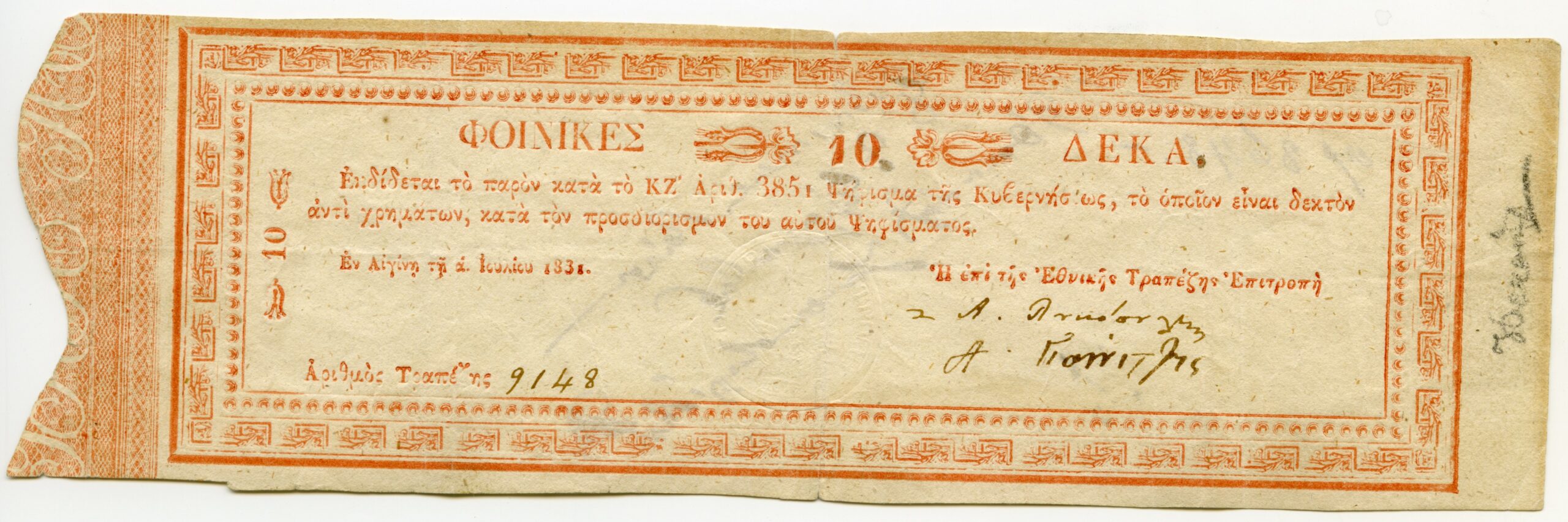 Η ενδιαφέρουσα και σπάνια συλλογή ξεκινά με την έκθεση δύο αρχαίων νομισμάτων: το πρώτο από ήλεκτρο ανάγεται στο 650 π.Χ. και το άλλο από ασήμι με μια ανάγλυφη χελώνα, περίπου από το 470 π.Χ. Κατόπιν, καλύπτεται μια χρονολογική περίοδος 200 ετών, από την Ελληνική επανάσταση του 1821, όταν εκδίδονταν ομόλογα ως μέσο συναλλαγών, και το 1829 όταν ο Ιωάννης Καποδίστριας ως πρώτος Κυβερνήτης της Ελλάδας ίδρυσε το πρώτο Νομισματοκοπείο στον αυλόγυρο και το ισόγειο της κατοικίας του στην Αίγινα. Το πρώτο νόμισμα του Ελληνικού κράτους ήταν ο Φοίνικας και όπως μπορούμε να δούμε, παρότι εκδόθηκε το 1829, φέρει ως ημερομηνία έκδοσης το 1828. Μερικά χρόνια αργότερα, το 1833, αντικαταστάθηκε από τη Δραχμή μετά τη δολοφονία του Καποδίστρια στο Ναύπλιο και τη μεταφορά της πρωτεύουσας στην Αθήνα από τον βασιλιά Όθωνα.