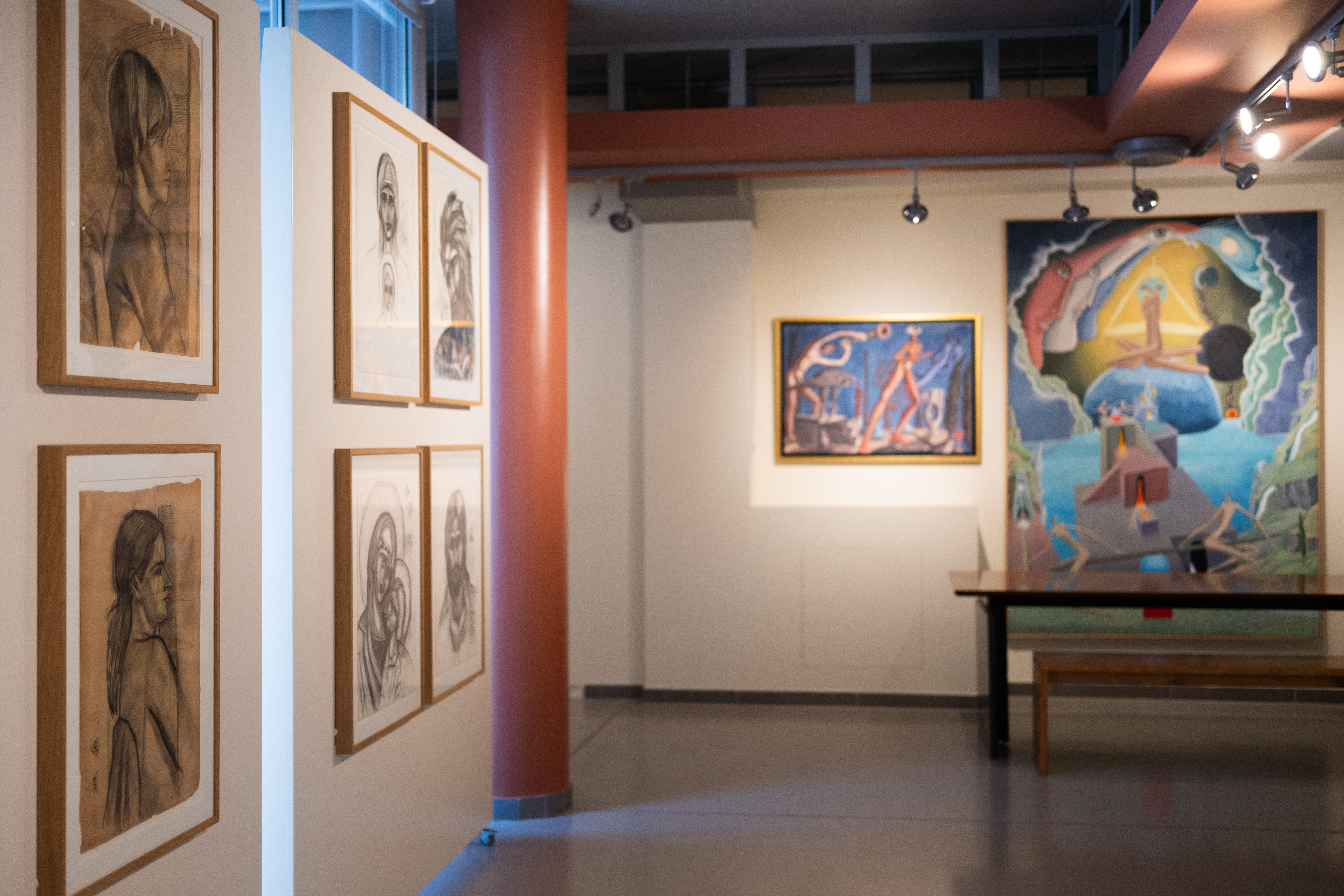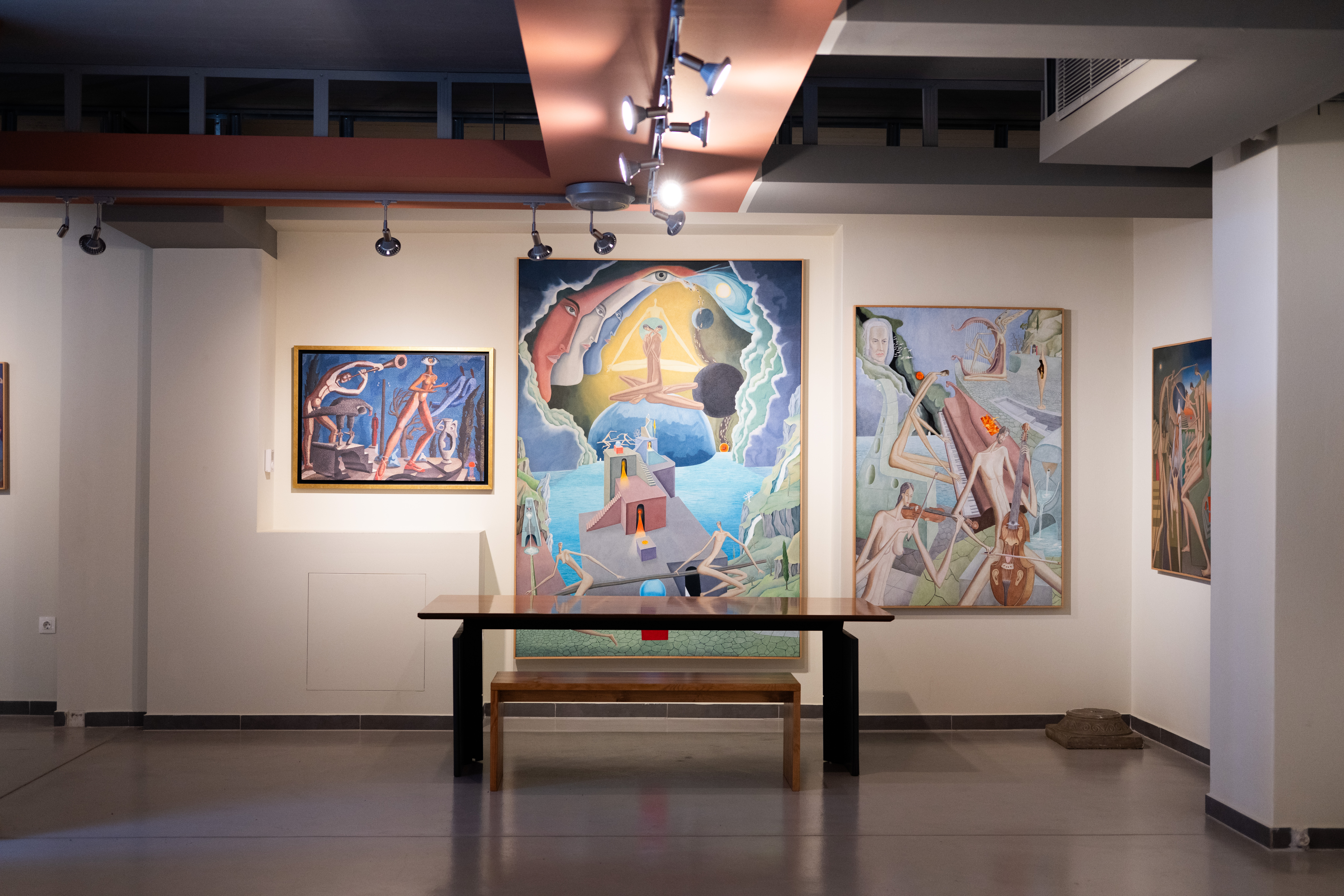 Στον δεύτερο όροφο, τα ζωγραφικά έργα του Ηλία Ηλιόπουλου αποπνέουν μια σουρεαλιστική ποιητικότητα που μεταφέρει τον θεατή σε όνειρα και αναμνήσεις. Η σύνδεση πατέρα και γιου γίνεται ορατή: ο ένας αποτυπώνει τη ζωή μέσα από τον φακό, ο άλλος τη μεταπλάθει μέσα από το πινέλο.