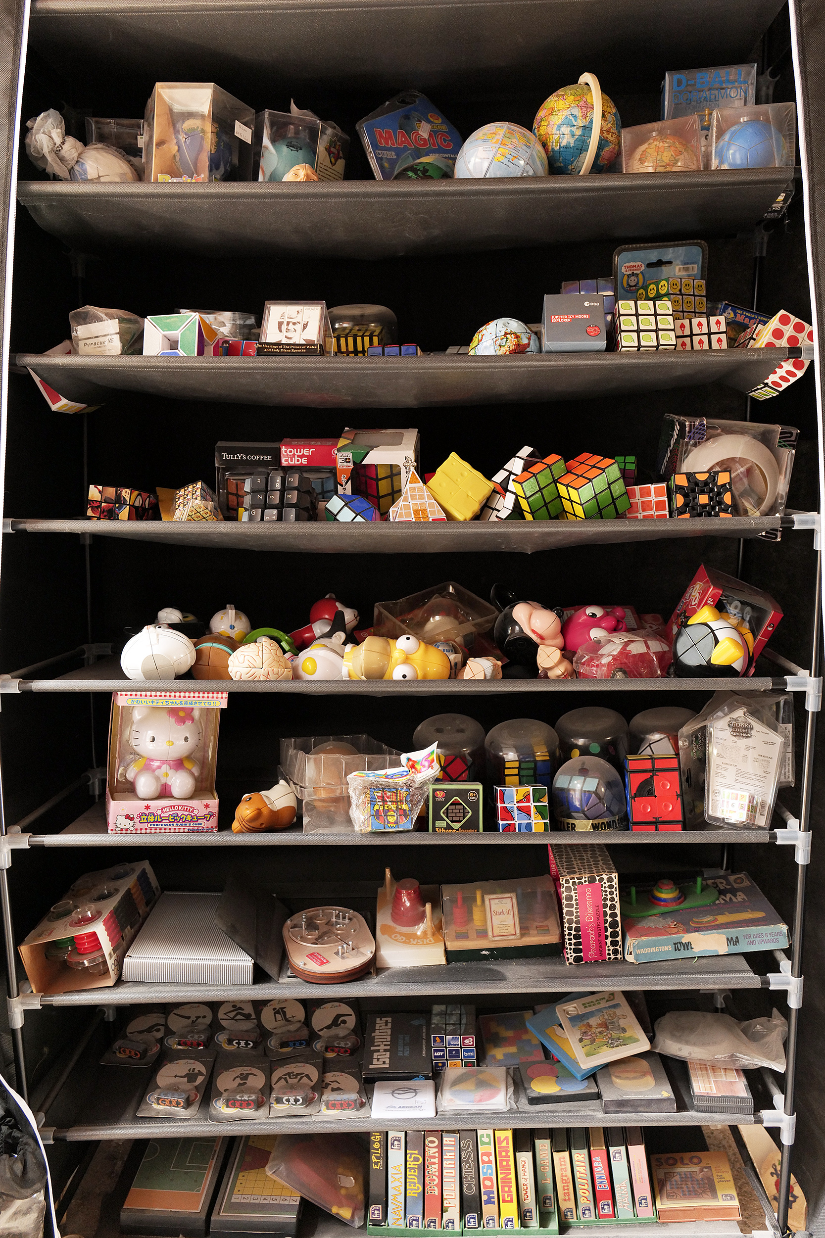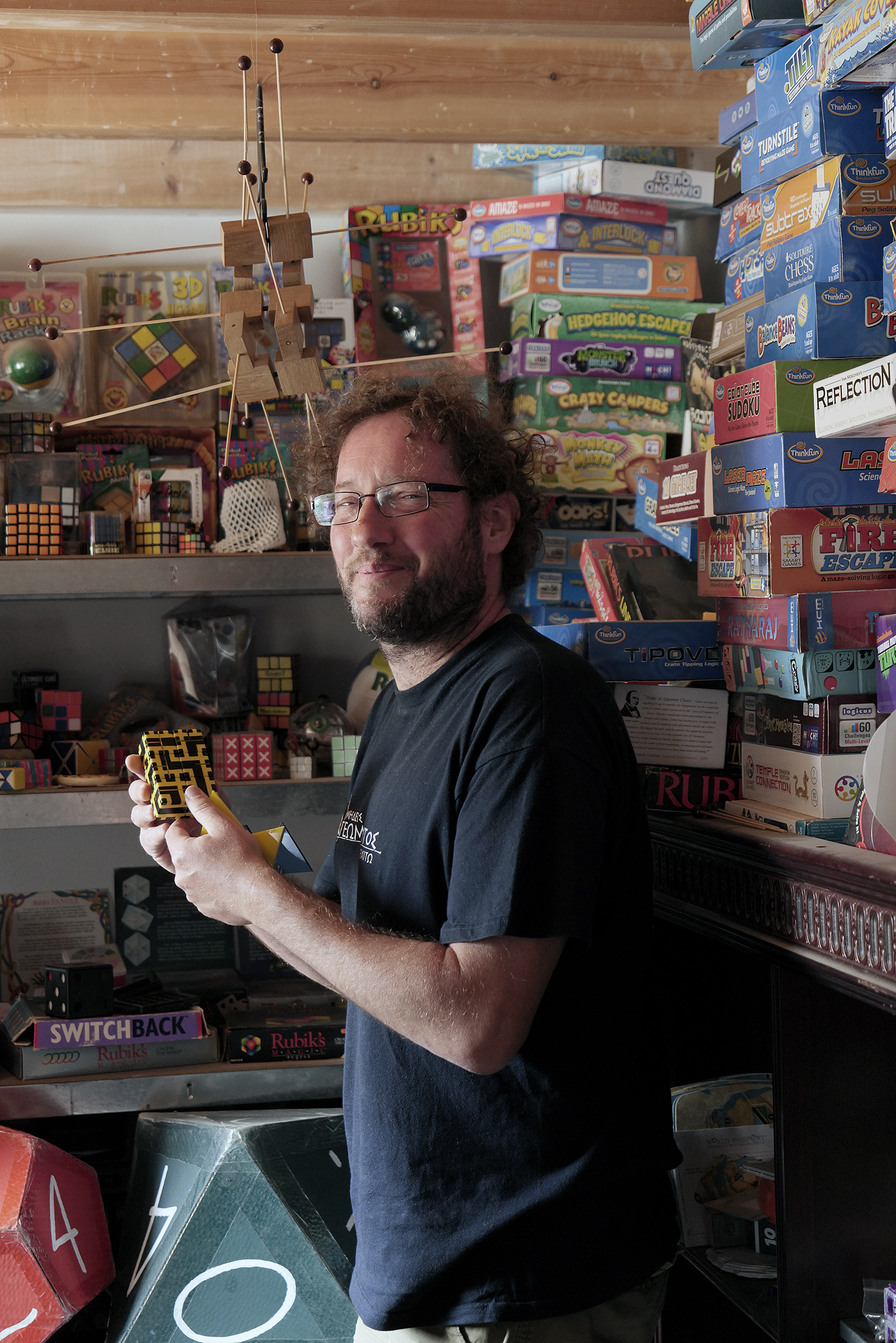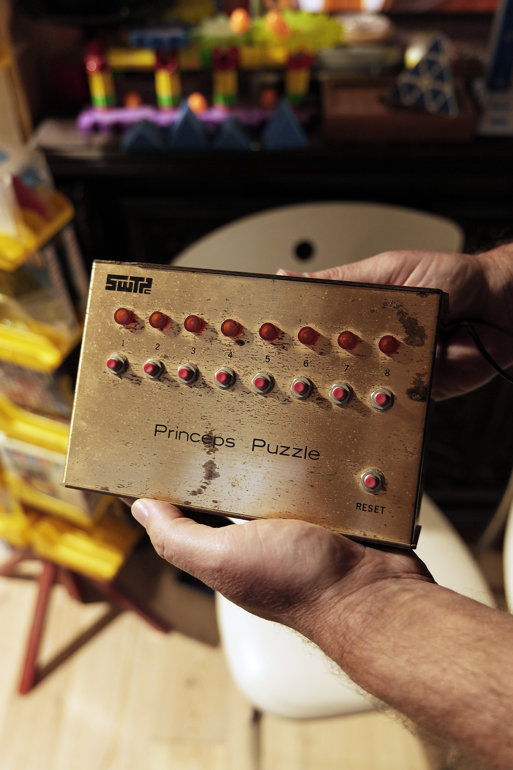 Βελάσματα ακούγονται από έξω, καθώς επεξεργάζομαι μια ιταλική αριθμομηχανή του 1955, χωρίς να καταλαβαίνω ούτε λίγο πως λειτουργεί, καθώς ο Πανταζής κλείνει το παράθυρο για να περιορίσει τις ριπές του αέρα. Οι δικές του ριπές πληροφοριών συνεχίζονται αδιάκοπα, προκαλώντας την ανάγκη της απόλυτης συγκέντρωσής μου. Παρότι ηχογραφώ τη συνομιλία, έχω την αίσθηση πως, αν χάσω τον ειρμό τώρα, εδώ μέσα στον λαβυρινθώδη χώρο, θα είναι σχεδόν αδύνατο να ταξινομήσω τις πληροφορίες αργότερα. Μια φωτογραφία τραβάει την προσοχή μου, η οποία απεικονίζει τον Πανταζή μαζί με τον Έρνο Ρούμπικ, εμπνευστή και δημιουργού του ομώνυμου πολύχρωμου κύβου, ενός γρίφου ακολουθιακού, όπως μου εξηγεί. Τα διαφορετικά είδη σπαζοκεφαλιών και γρίφων, έχουν επίσης ενδιαφέρον. Illusions (ψευδαισθήσεις), ακολουθιακοί, ανοιγόμενοι (ή κλειδαριές, ή κουτιά ιαπωνικά), εξαφανιζόμενοι (ή εκλειπούμενοι), όπου κάποια στοιχεία τους εξαφανίζονται, γρίφοι κούπες (του Πυθαγόρα), λαβύρινθοι, ταιριαστικοί, τοπολογικοί, αναδιπλούμενοι, η λίστα μοιάζει ατελείωτη. Ο Πανταζής μιλά για τους γρίφους με επίθετα όπως «απολαυστικός», καθώς μου δείχνει ένα σημείο κάτω από τη σκάλα, το οποίο αποτελεί «το νοσοκομείο των γρίφων» όπου «νοσηλεύονται» άτυχα κομμάτια τα οποία τα περισσότερα υπέστησαν βία από τους απελπισμένους λύτες τους.