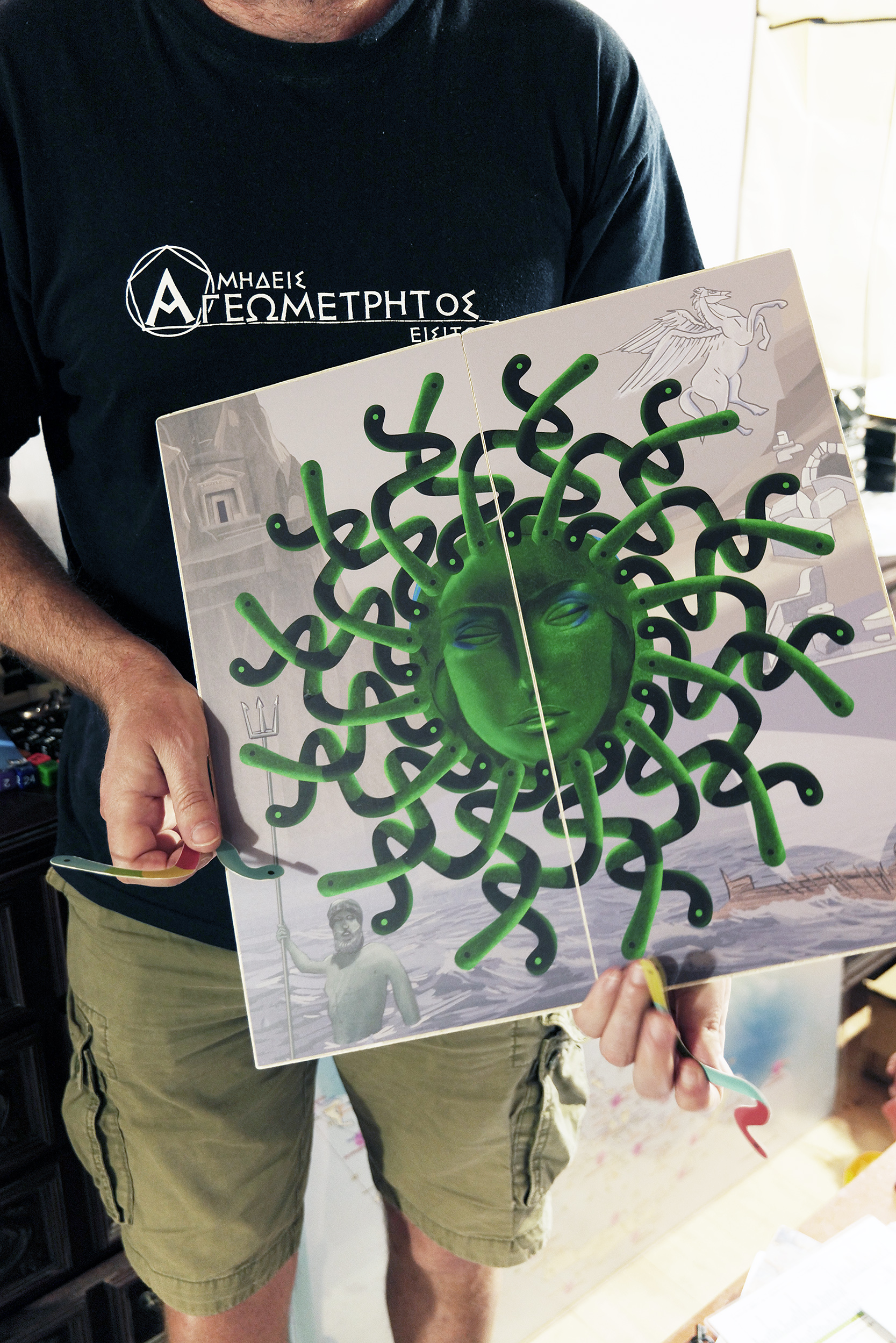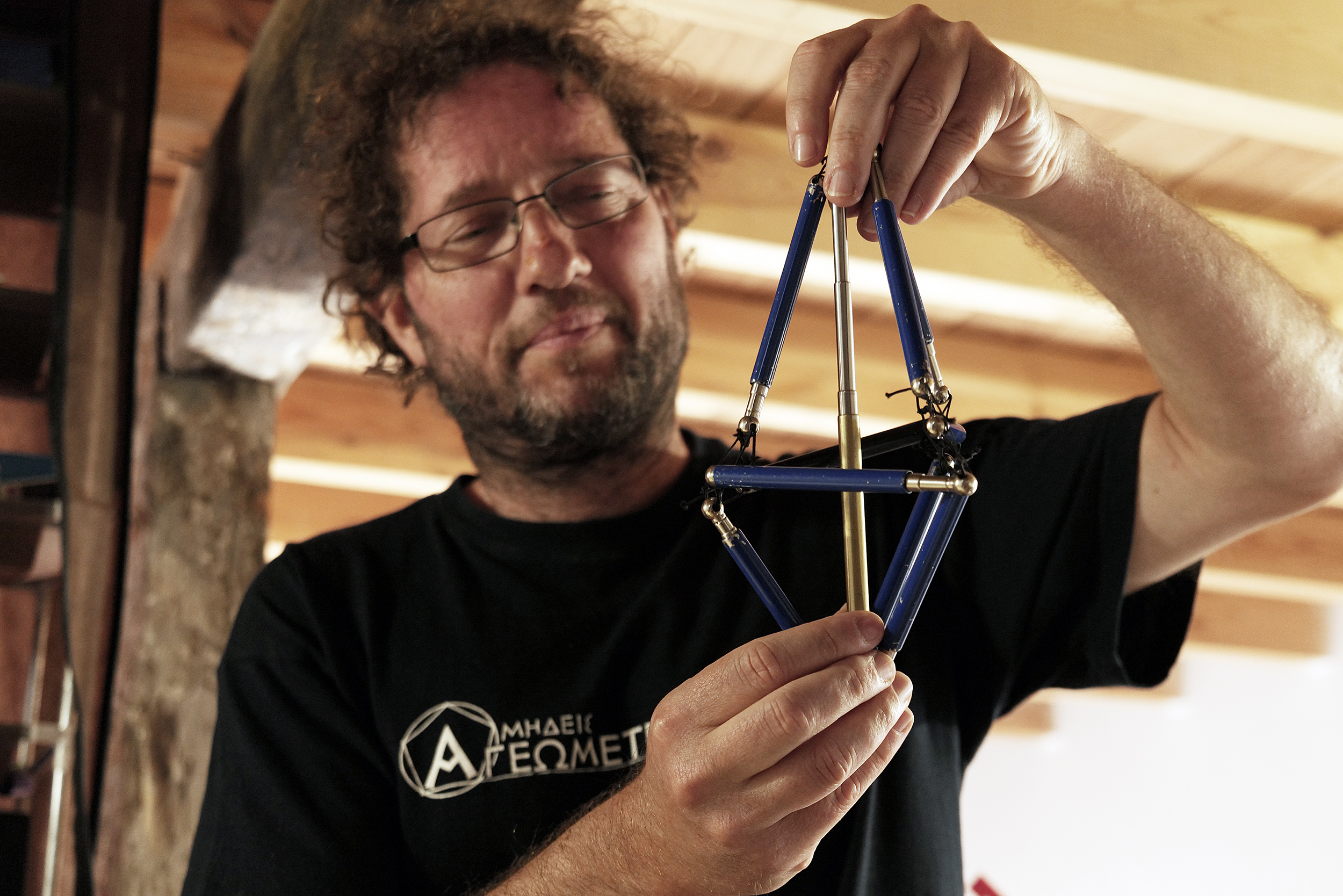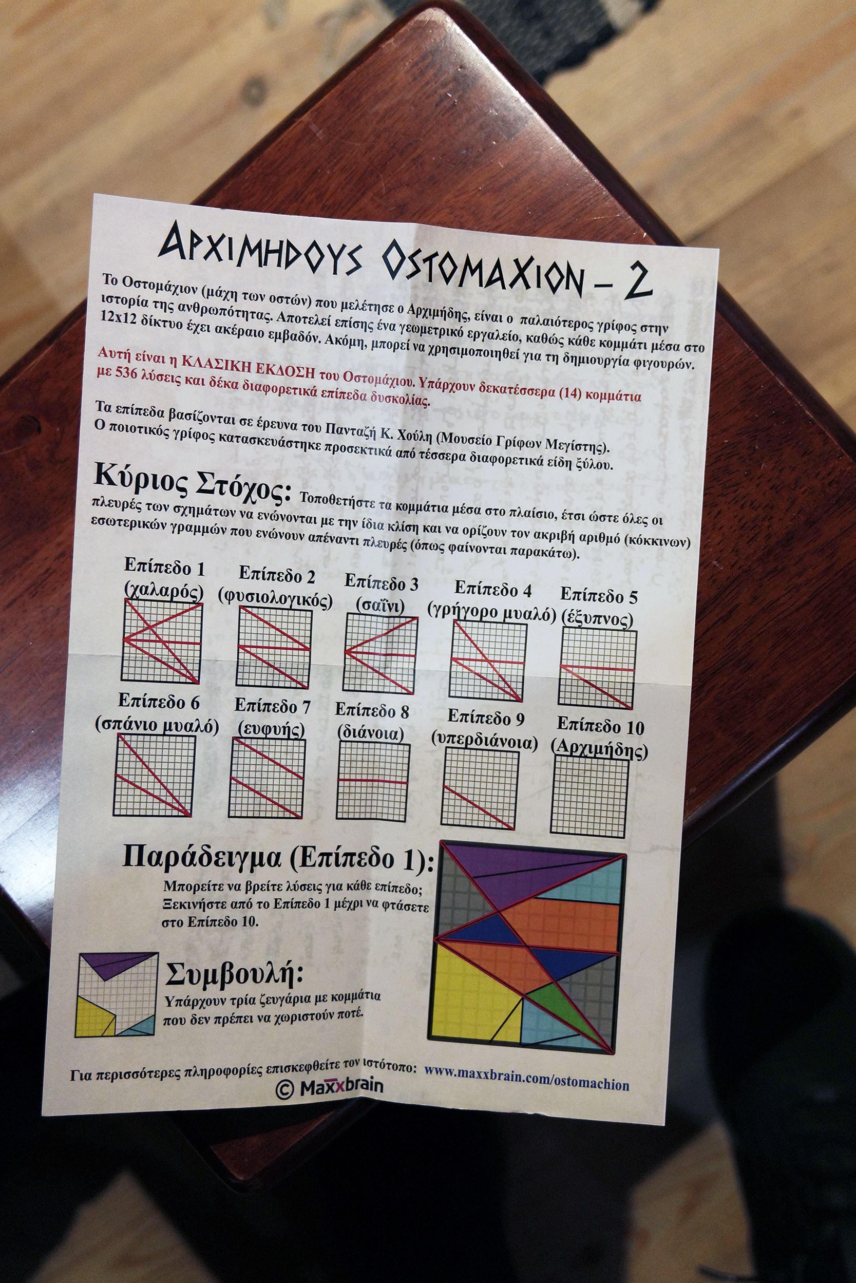Καθώς έχω αρχίσει να νιώθω τον εγκέφαλό μου στα πρόθυρα καψίματος από την ασταμάτητη ροή πληροφοριών και επεξηγήσεων, ο Πανταζής ανασύρει διαρκώς δείγματα από ένα τραπέζι το οποίο μοιάζει και το ίδιο με σπαζοκεφαλιά με μοναδικό λύτη τον ίδιο. «Ότι μας κάνει να σκεφτόμαστε και να αναρωτιόμαστε, είναι γρίφος», μου λέει συνεχίζοντας να κρατά κάποιους από αυτούς που ανασύρει για να φωτογραφηθούν, όπως το διάσημο «οστομάχιον του Αρχιμήδη», έναν αρχαίο γρίφο ταιριαστικό.