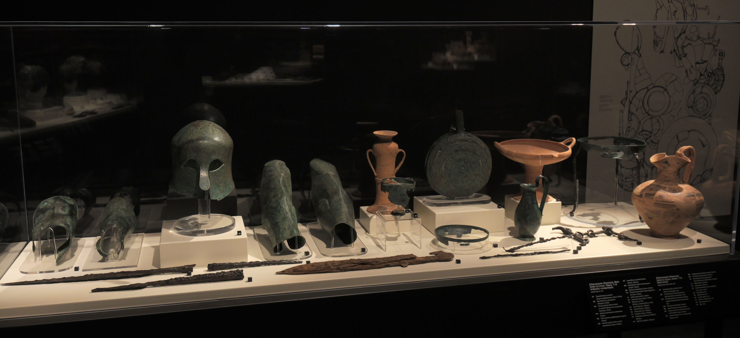 Ο Γενικός Διευθυντής του Μουσείου Ακρόπολης, Καθηγητής Νικόλαος Χρ. Σταμπολίδης, αναφέρει χαρακτηριστικά: «Στην Έκθεση περιλαμβάνονται κυρίως τα υλικά κατάλοιπα που προέρχονται από ταφές, για να το πω ποιητικά παραφράζοντας τον Σεφέρη «από φαντάσματα και φάσματα, φιλιά και χείλη χωνεμένα, με τα παραπετάσματα του χρόνου διάπλατα ανοιχτά». Δηλαδή μέσα από ταφές γυναικών και ανδρών, μέσα από προσωπικά αντικείμενα που τους εναπόθεσαν στις ταφές οι κηδευτές τους, συγγενείς και φίλοι, για το μεγάλο ταξίδι στον Άδη. Με αντικείμενα συνοδευτικά που φανερώνουν τις πίστεις και τις δοξασίες τους, τις σχέσεις και τα έθιμά τους όταν αυτοί ήσαν εν ζωή, τόσο με έργα του πρώιμου πολιτισμού της Basilicata όσον κι αργότερα με έργα-αντικείμενα, τα οποία σχετίζονται με τους Έλληνες που κατέφθασαν στην περιοχή. Αντικείμενα που κατάπινε η γη στις ταφές και που τώρα πρωταγωνιστούν στις προθήκες της Έκθεσης».
