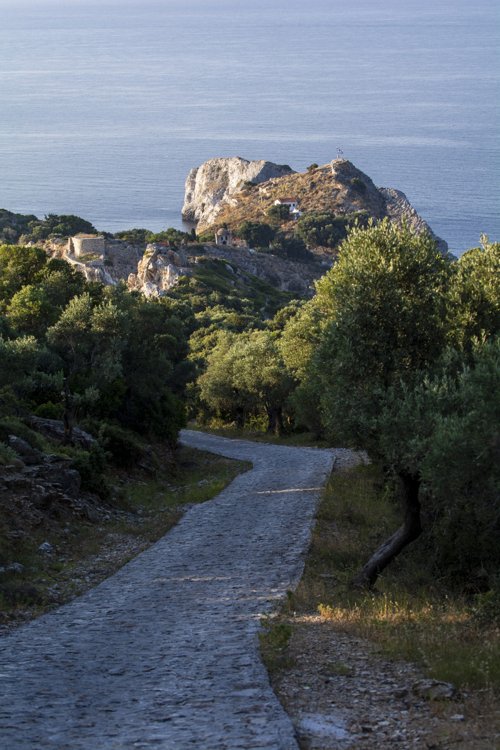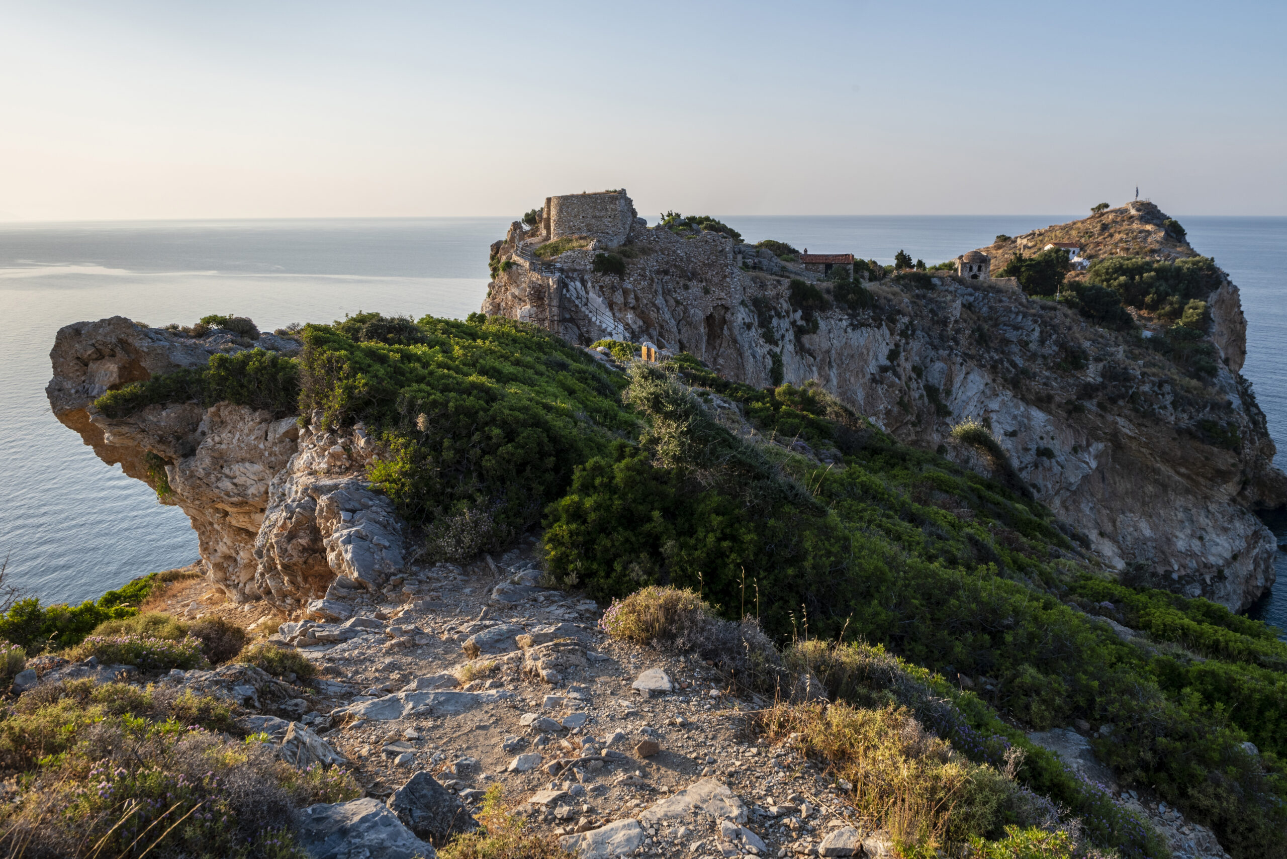Βρίσκεται στο βορειότερο άκρο του νησιού απέχοντας 11 χιλιόμετρα από την πόλη. Η ίδρυσή του χρονολογείται στις αρχές του 14ου αιώνα τότε που η πειρατεία μάστιζε τα νησιά του Αιγαίου και αποτέλεσε επί 5 αιώνες τον μοναδικό οργανωμένο οικισμό του νησιού. Οι τρεις πλευρές του που κοιτάζουν προς τη θάλασσα διέθεταν ασθενέστερο τείχος λόγω της φυσικής οχύρωσης που παρείχαν οι απόκρημνες ψηλές ακτές. Προς την ξηρά όμως, σώζονται ακόμη ισχυρές επάλξεις και η πύλη με τον πυργίσκο. Με το υπόλοιπο νησί συνδεόταν μέσω ξύλινης γέφυρας η οποία σε περιπτώσεις κινδύνου σερνόταν στο εσωτερικό του. Η πρόσβαση σήμερα γίνεται μέσω χτιστών σκαλοπατιών.