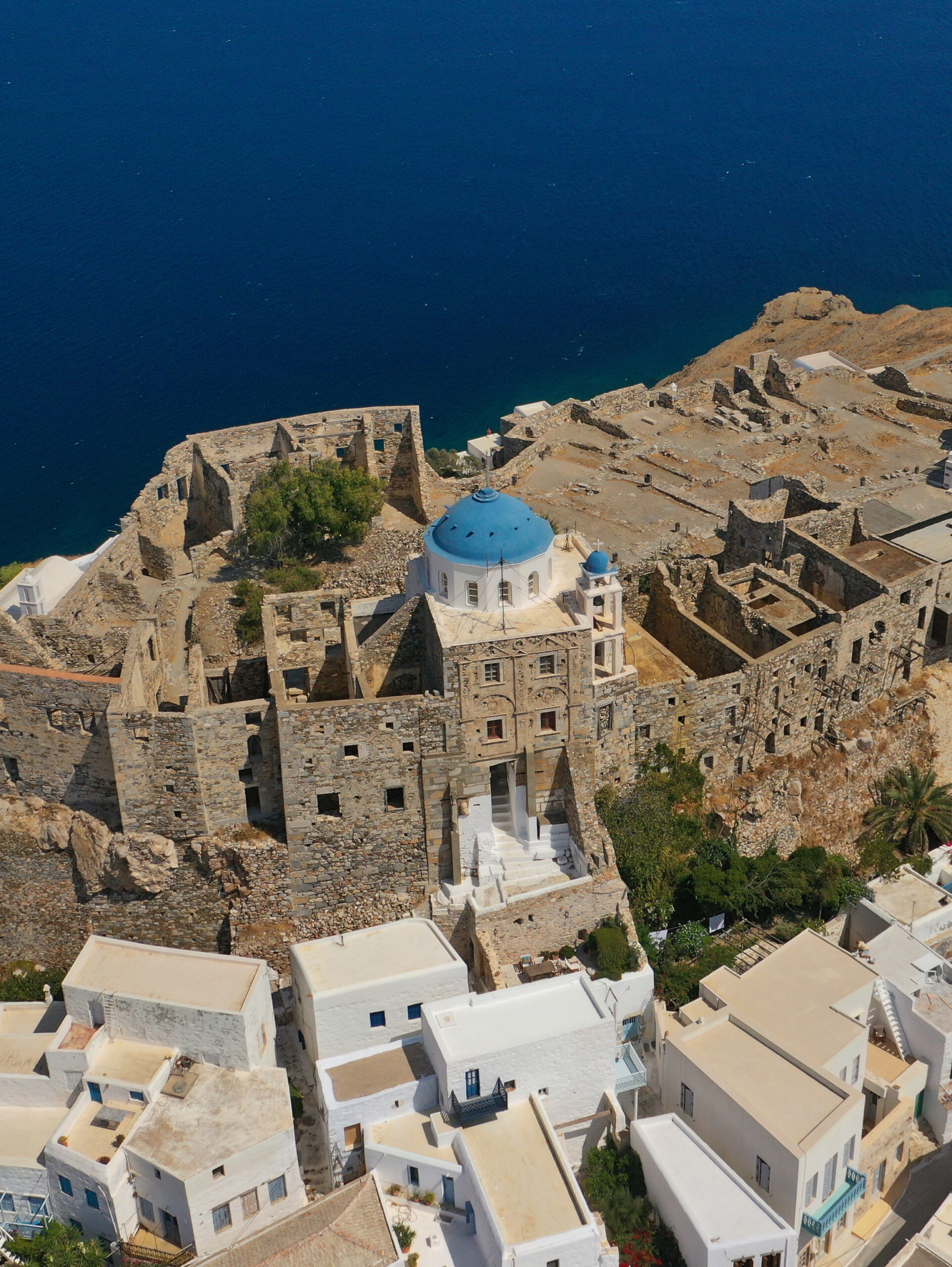 Το μοναστήρι ήταν κάποτε ανθηρό και οι εγκαταστάσεις του απλώνονταν σε δύο πλαγιές με απρόσκοπτη θέα προς το πέλαγος. Σήμερα σώζεται μόνο το ξωκλήσι του Τιμίου Προδρόμου και μπορείτε να φτάσετε ως εκεί είτε δια θαλάσσης με εκδρομικό σκάφος, είτε από μονοπάτι που διατρέχει τη βορινή πλαγιά της Βάρδιας. Αντικριστά στο μοναστήρι, σε ένα άλλο απόκρημνο ύψωμα, υπήρχε κάστρο. Σύμφωνα με την παράδοση, επικοινωνούσαν μεταξύ τους με μυστική σήραγγα. Σήμερα σώζονται λίγα μόνο χαλάσματα και μια στέρνα. Το μεσαιωνικό φρούριο αλώθηκε τον 16ο αιώνα από τον Αλγερινό κουρσάρο Χαριεντίν Μπαρμπαρόσα. Οι άρρενες κάτοικοί του σφαγιάστηκαν, τα γυναικόπαιδα πουλήθηκαν σκλάβοι και από τότε δεν ξανακατοικήθηκε.