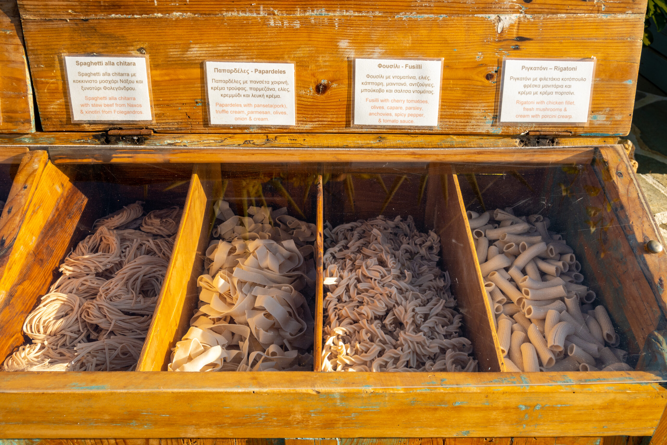 Τα ντόπια ζυμαρικά ονομάζονται «ματσάτα» και θυμίζουν λαζάνια. Το «σουρωτό», είναι το λευκό μαλακό τυρί που συχνά παίρνει τη θέση της φέτας στη χωριάτικη σαλάτα. Το βάζουν μαζί με κρεμμύδι και στην παραδοσιακή τυρόπιτα που τη λένε «καλασούνα».