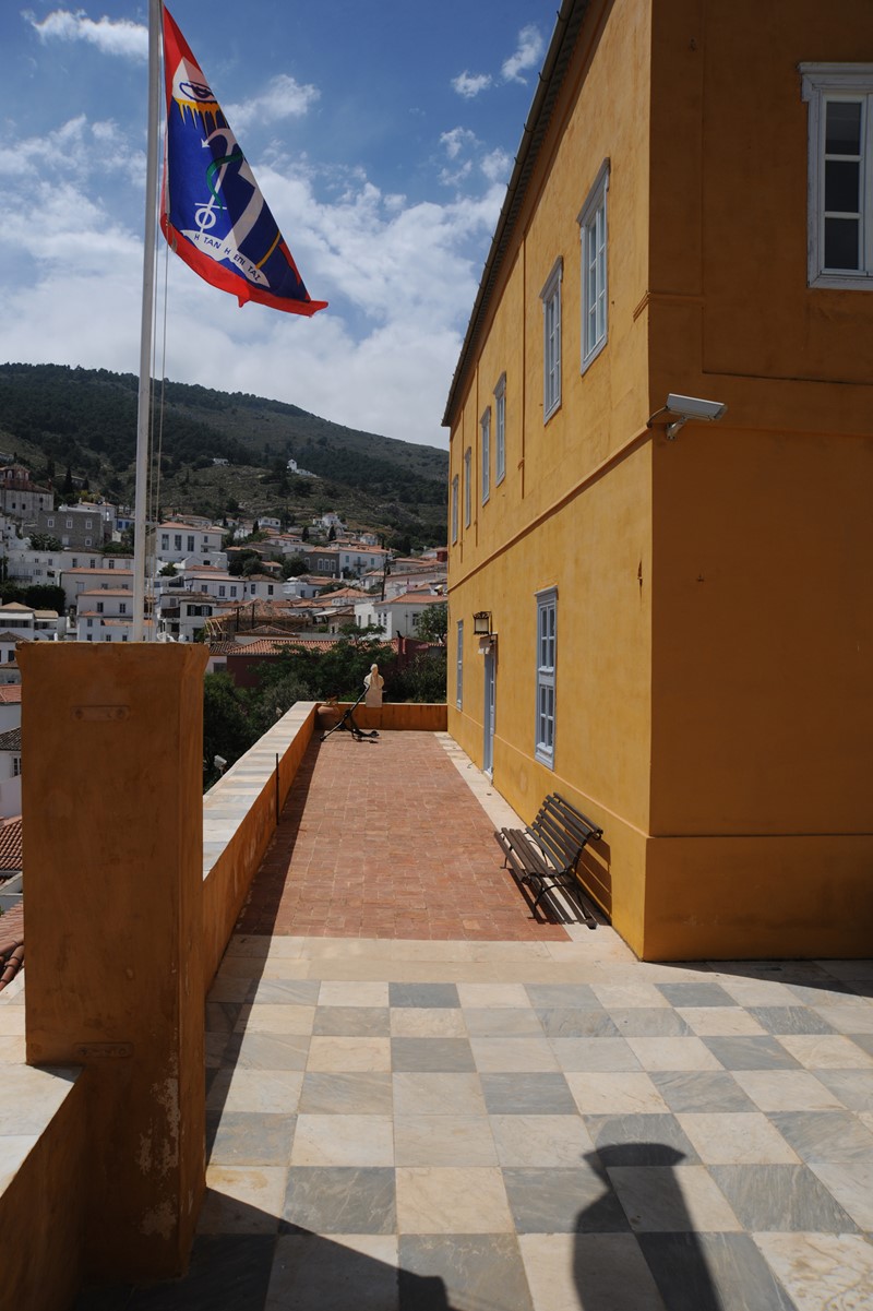 Το εν λόγω επιβλητικό και συνάμα λιτό κτίριο βρίσκεται στο αριστερό μας χέρι κατά την είσοδό μας με το πλεούμενο στο λιμάνι του νησιού. Η ματιά κινείται και παρατηρεί και άλλα κτίρια που δεσπόζουν στο λιμάνι και λίγο πιο ψηλά. Όπως τα Αρχοντικά των Λάζαρου Κουντουριώτη και Αντώνη Κριεζή στην ανατολική πλευρά του λιμανιού, το Αρχοντικό του Μανώλη Τομπάζη (δυτική πλευρά της πόλης) που από το 1936 λειτουργεί ως παράρτημα της ΑΣΚΤ και κατά καιρούς εκεί διοργανώνονται δράσεις του ιδρύματος και φιλοξενούνται καλλιτέχνες.