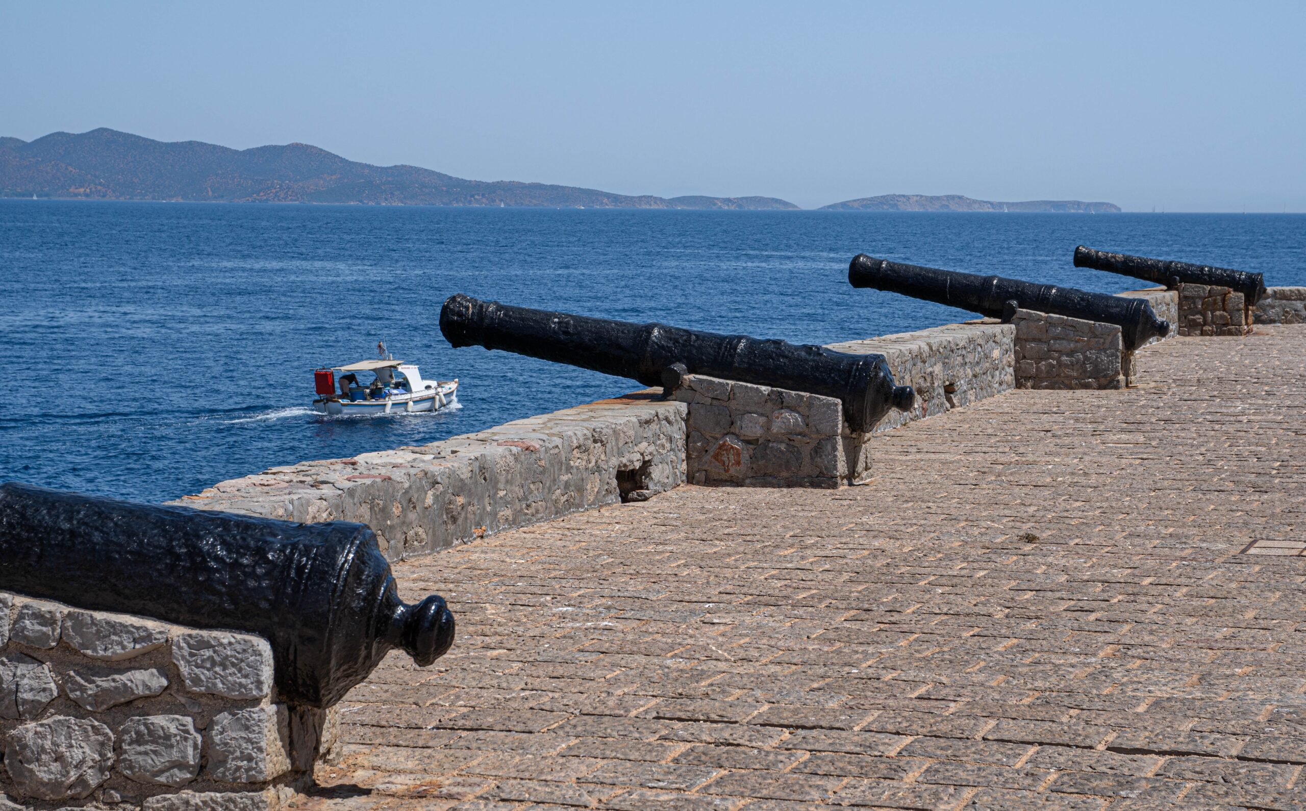Αυθόρμητα, το κεφάλι γυρίζει προς τα πίσω ώστε το νησί να διατηρηθεί λίγο παραπάνω στη ματιά. Μεταξύ άλλων, παρατηρεί τους προμαχώνες με τα κανόνια που αναδεικνύουν την ιστορία του νησιού και λάμπουν σαγηνευτικά υπό το χαμηλό φως του ήλιου που πάει να ξαποστάσει.