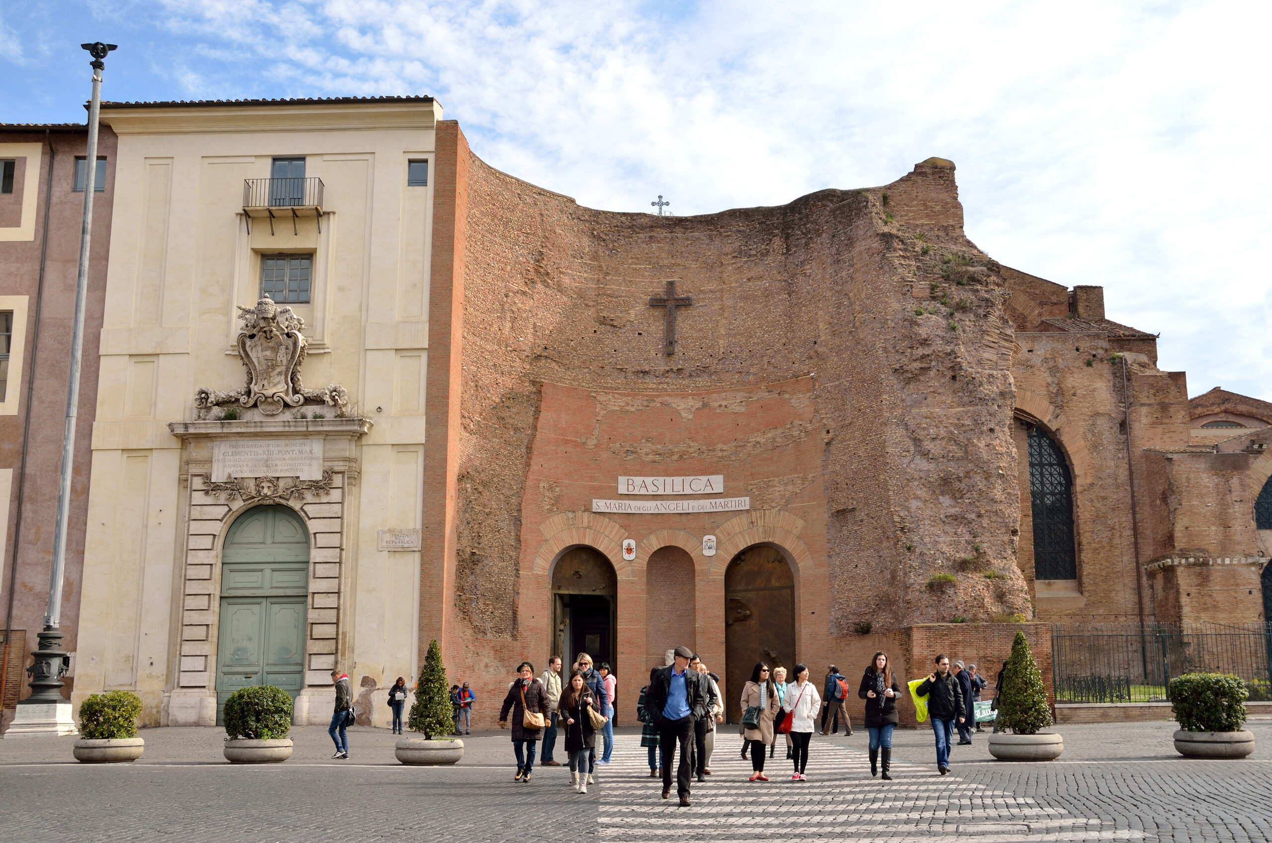 Αυτό που κάνει την «Βασιλική των Αγγέλων και των Μαρτύρων» να ξεχωρίζει, είναι το γεγονός ότι αποτελεί μέρος των Θερμών του Διοκλητιανού –Terme di Diocleziano– του 3ου αιώνα, του μεγαλύτερου συγκροτήματος λουτρών της αρχαίας Ρώμης, το οποίο μπορούσε να φιλοξενήσει έως 3.000 άτομα, καθώς και αθλητικές και πολιτιστικές εκδηλώσεις, και που πλέον αποτελεί μέρος του Εθνικού Μουσείου της Πόλης. Στα σημαντικά ερείπιά τους κλήθηκε από τον Πάπα Πίο Δ΄ ο Michelangelo το 1561, ώστε να μετατρέψει τμήμα των θερμών σε εκκλησία.