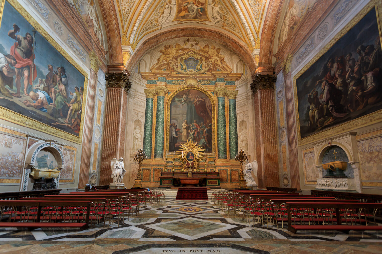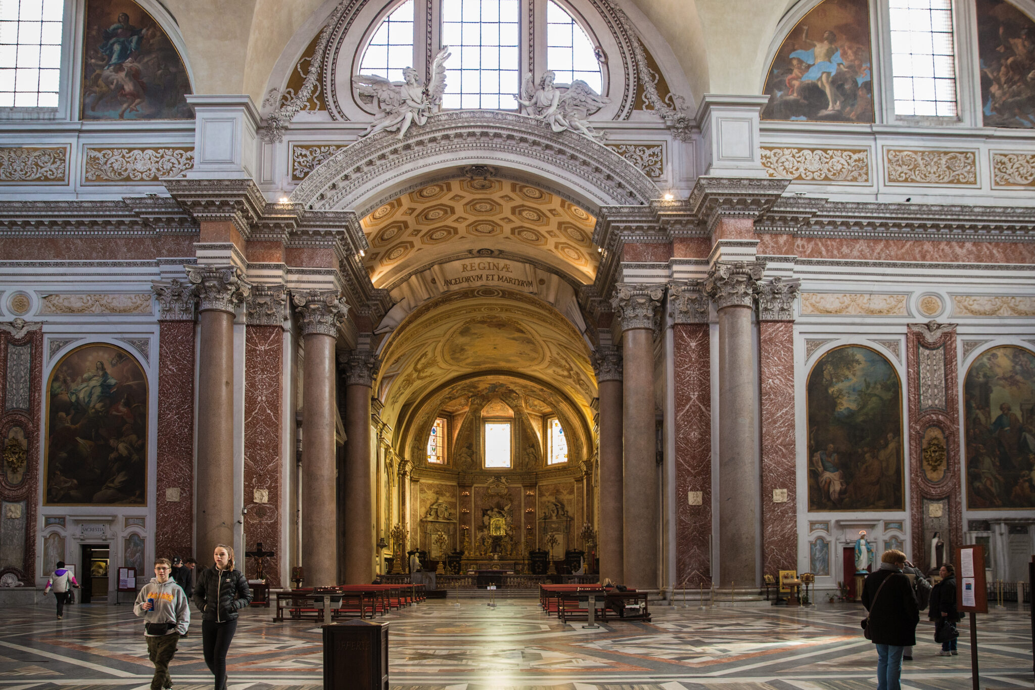 Ο επισκέπτης σήμερα, καθώς στέκει απέναντι από την αρχαία εξέδρα των λουτρών που αποτελεί τη γιγάντια πρόσοψη της βασιλικής, κοίλη και χτισμένη από τούβλα, λιτή και σχεδόν ακατέργαστη, δεν υποψιάζεται το μπαρόκ μεγαλείο που κρύβει το εσωτερικό, το οποίο ο Μιχαήλ Άγγελος κατάφερε να σχεδιάσει χωρίς να αλλοιωθεί η ρωμαϊκή δομή της ορθογώνιας αίθουσας του frigidarium, με αποτέλεσμα οι θεαματικές διαστάσεις του ναού όντως να προκαλούν δέος: το συνολικό μήκος της βασιλικής είναι 90 μ., ενώ ο θόλος φτάνει σε διάμετρο τα 22 μ. Το γεμάτο δραματική ένταση και θεατρικότητα, υποβλητικό σκηνικό, συμπληρώνουν οι οκτώ αρχαίοι κίονες από κόκκινο γρανίτη που φτάνουν σε ύψος τα 17 μ. και πλαισιώνουν τις ψηλές καμάρες, οδηγώντας το βλέμμα στο περίτεχνο ιερό – μια πανδαισία από πράσινο μάρμαρο και χρυσά γυψανάγλυφα που αποθεώνουν το μπαρόκ ύφος. Για τη διακόσμησή του, όπως και στο εγκάρσιο κλίτος, έχουν χρησιμοποιηθεί θρησκευτικοί πίνακες από τη βασιλική του Αγίου Πέτρου στο Βατικανό.