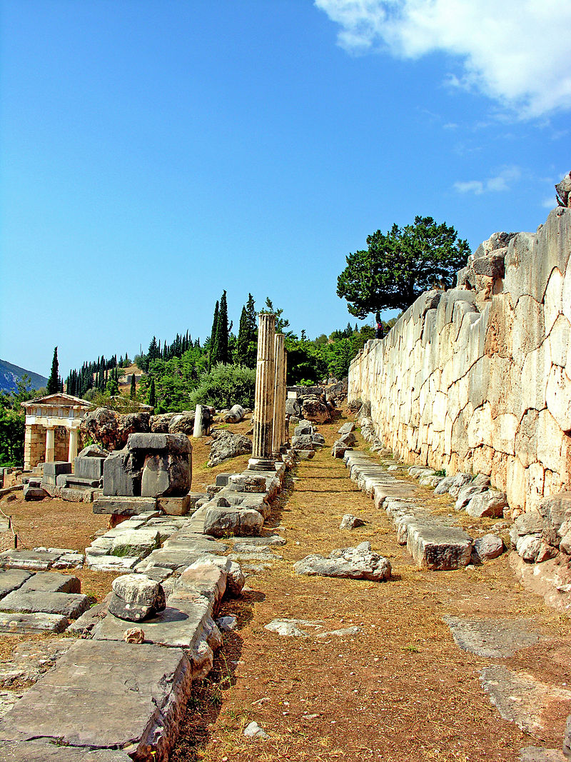 Ο ναός του Απόλλωνα. Ναός υπήρχε μέσα στο τέμενος του Απόλλωνα, σε περίοπτη θέση και εκεί γίνονταν οι ιεροτελεστίες και οι μαντείες. Μετά την πυρκαγιά του 548 π.Χ. που κατέστρεψε τον πρώτο λίθινο ναό, άρχισε η ανέγερση του επόμενου. Ήταν δωρικός περίπτερος και πολύ εντυπωσιακός. Κτίστηκε μεταξύ 513-505 π.Χ., αλλά ερειπώθηκε από φυσική καταστροφή το 373 π.Χ. Ο επόμενος ολοκληρώθηκε το 330 π.Χ. -και σε αυτόν ανήκουν τα ερείπια που βλέπουμε σήμερα. Είναι δωρικού ρυθμού, παρόμοιος σε σχέδιο και διαστάσεις με τον προηγούμενο. Οι Αθηναίοι γλύπτες Πραξίας και Ανδροσθένης φιλοτέχνησαν τα μαρμάρινα αετώματα. Στο ανατολικό απεικονιζόταν ο Απόλλωνας με τις Μούσες και στο δυτικό ο Διόνυσος και οι Μαινάδες.