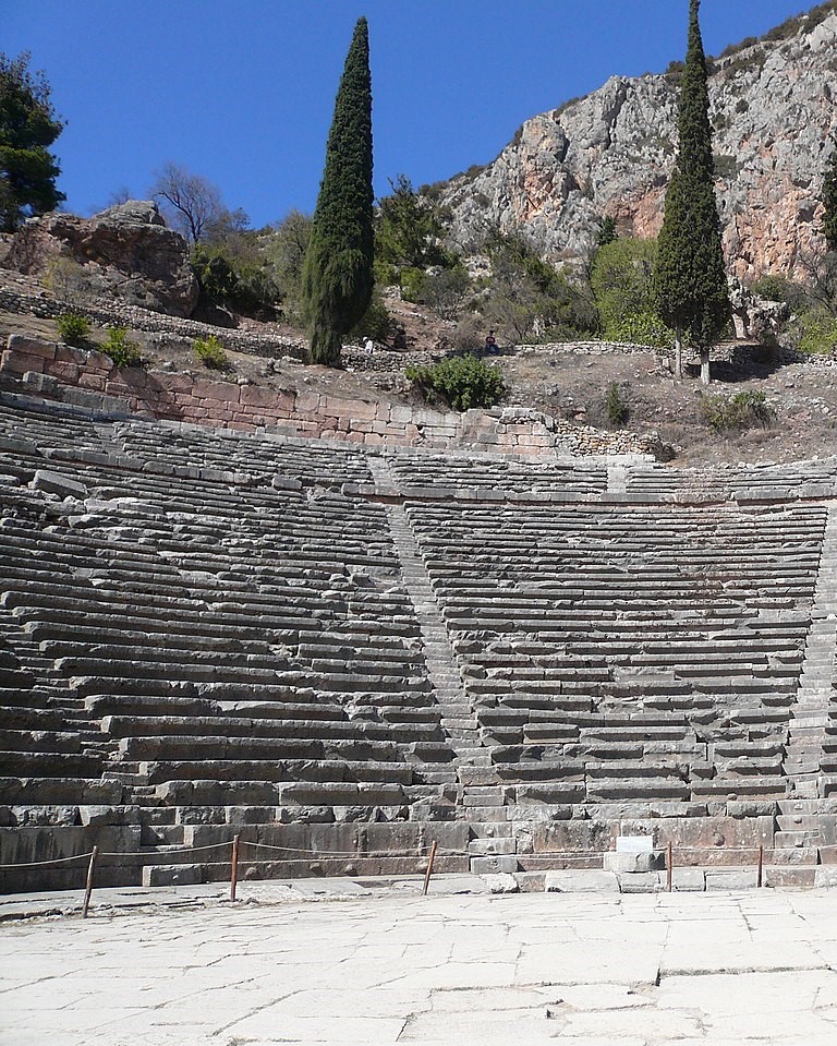 Το θέατρο και το στάδιο. Το αρχαίο θέατρο των Δελφών φιλοξενούσε μουσικούς και δραματικούς αγώνες. Το πρώτο λίθινο θέατρο πρέπει να κτίστηκε 4ο αι. π.Χ. και το 159 π.Χ. ανέλαβε την επισκευή του ο Ευμένης Β’ βασιλιάς της Περγάμου. Θεωρείται πως χωρούσε 5.000 θεατές. Προσθήκες έγιναν κατά τους ρωμαϊκούς χρόνους. Στο θέατρο αυτό το 1927 και το 1930 ο Άγγελος και η Εύα Σικελιανού οργάνωσαν για πρώτη φορά από την αρχαιότητα παραστάσεις αρχαίου δράματος. Το όραμά τους ήταν να δημιουργήσουν έναν νέο «πνευματικό ομφαλό της γης».