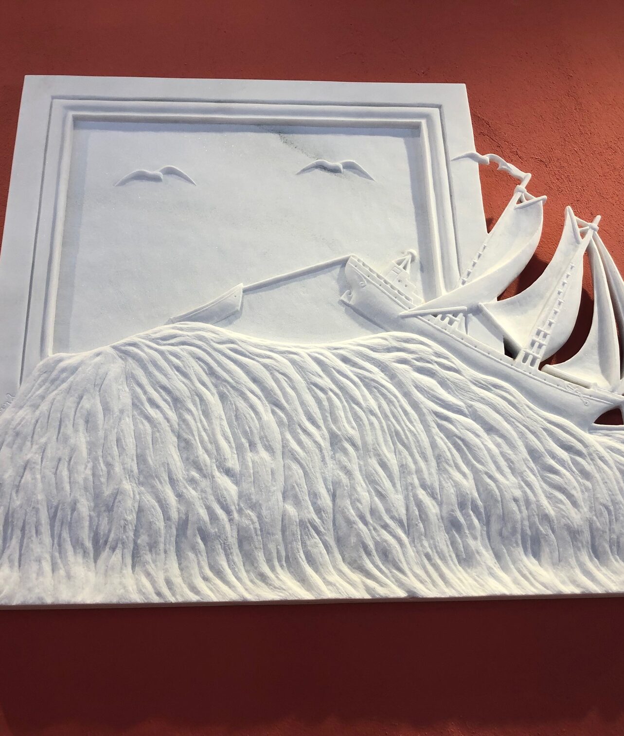 Σε περίοπτη θέση στον τοίχο βρίσκεται ακόμη το αγαπημένο μου ανάγλυφο μεγάλο έργο, που απεικονίζει καΐκια σε τρικυμία με πανιά και κατάρτια τόσο λεπτεπίλεπτα που αναγκάστηκε όταν τα έφτιαχνε να κλείσει τις πόρτες και το τηλέφωνο, μην τον τρομάξουν και κάνει το λάθος τελευταία στιγμή.