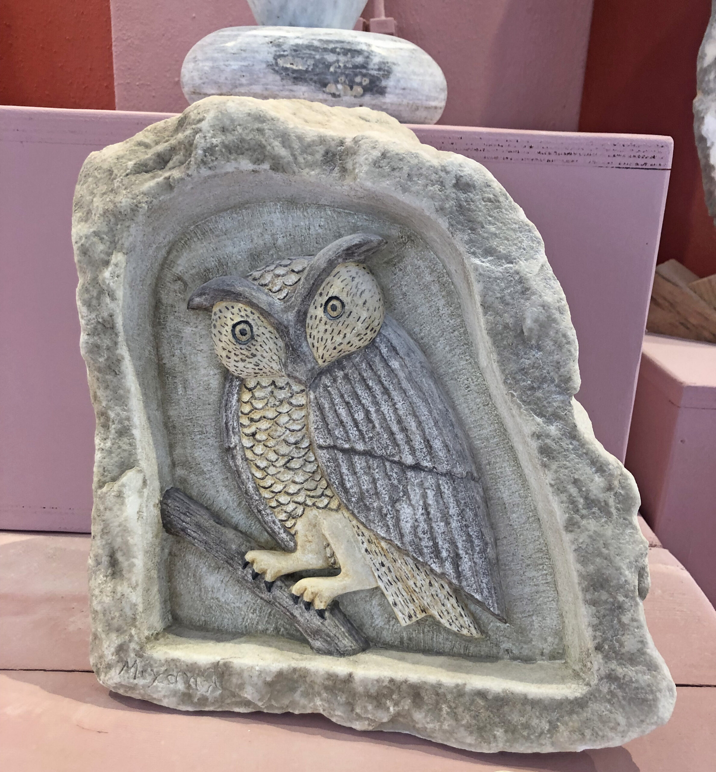 Tην πρώτη γνωριμία με τον γνωστό γλύπτη θα την κάνεις στο εκθετήριό του στο κεντρικό σοκάκι του Πύργου. Εκεί θα θαυμάσεις τα χαρακτηριστικά έργα του που είναι τα ολόγλυφα λευκά περιστέρια και τα μαρμαρόγλυπτα «χάρτινα καραβάκια». Έχει δημιουργήσει, επίσης, πολλά χρηστικά αντικείμενα -πιατέλες και μαρμάρινα τραπέζια με ρόδια, ελιές, στάχυα και σταφύλια- και κατά παραγγελία αντικείμενα για τη διακόσμηση διάφορων χώρων.