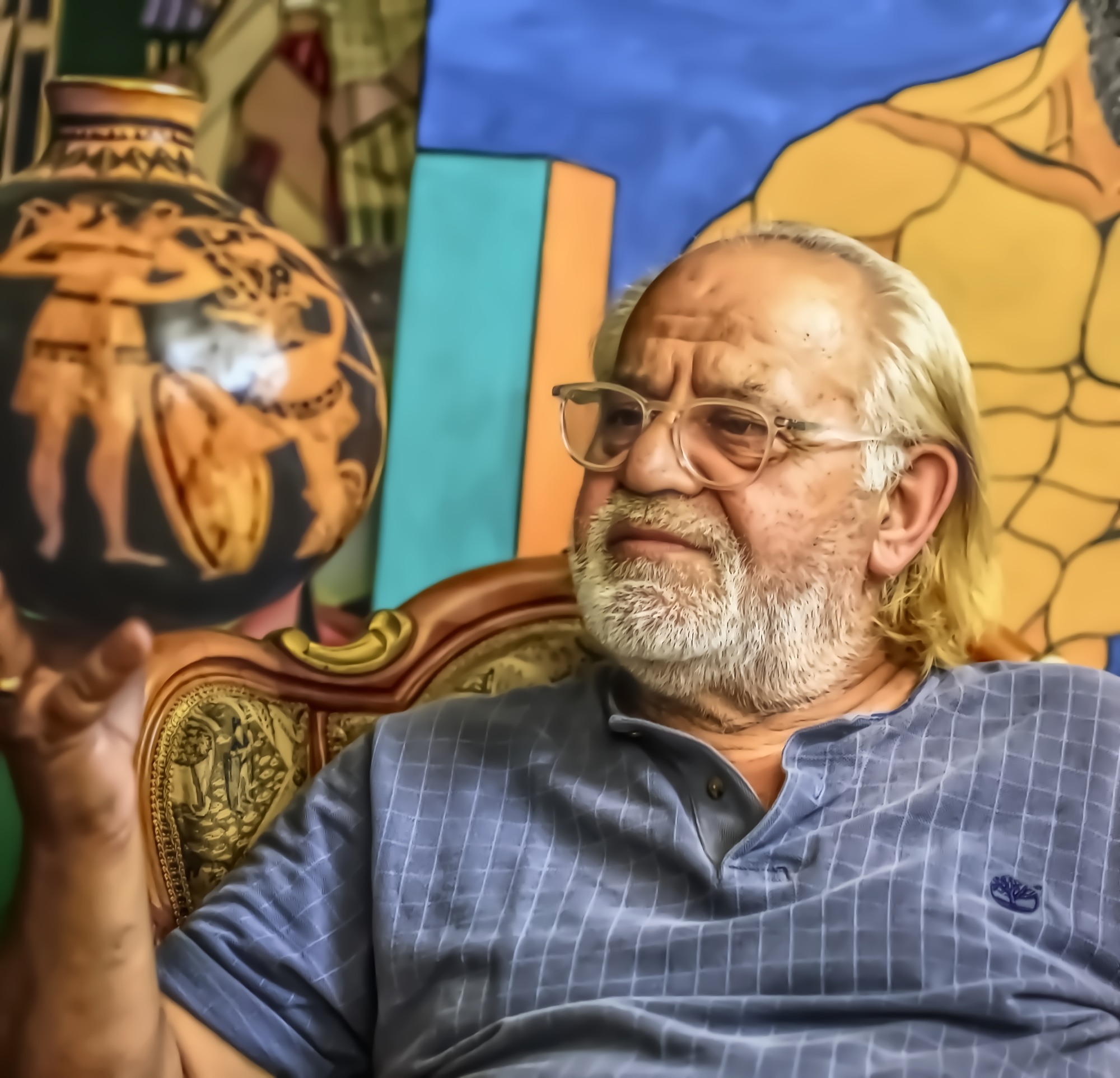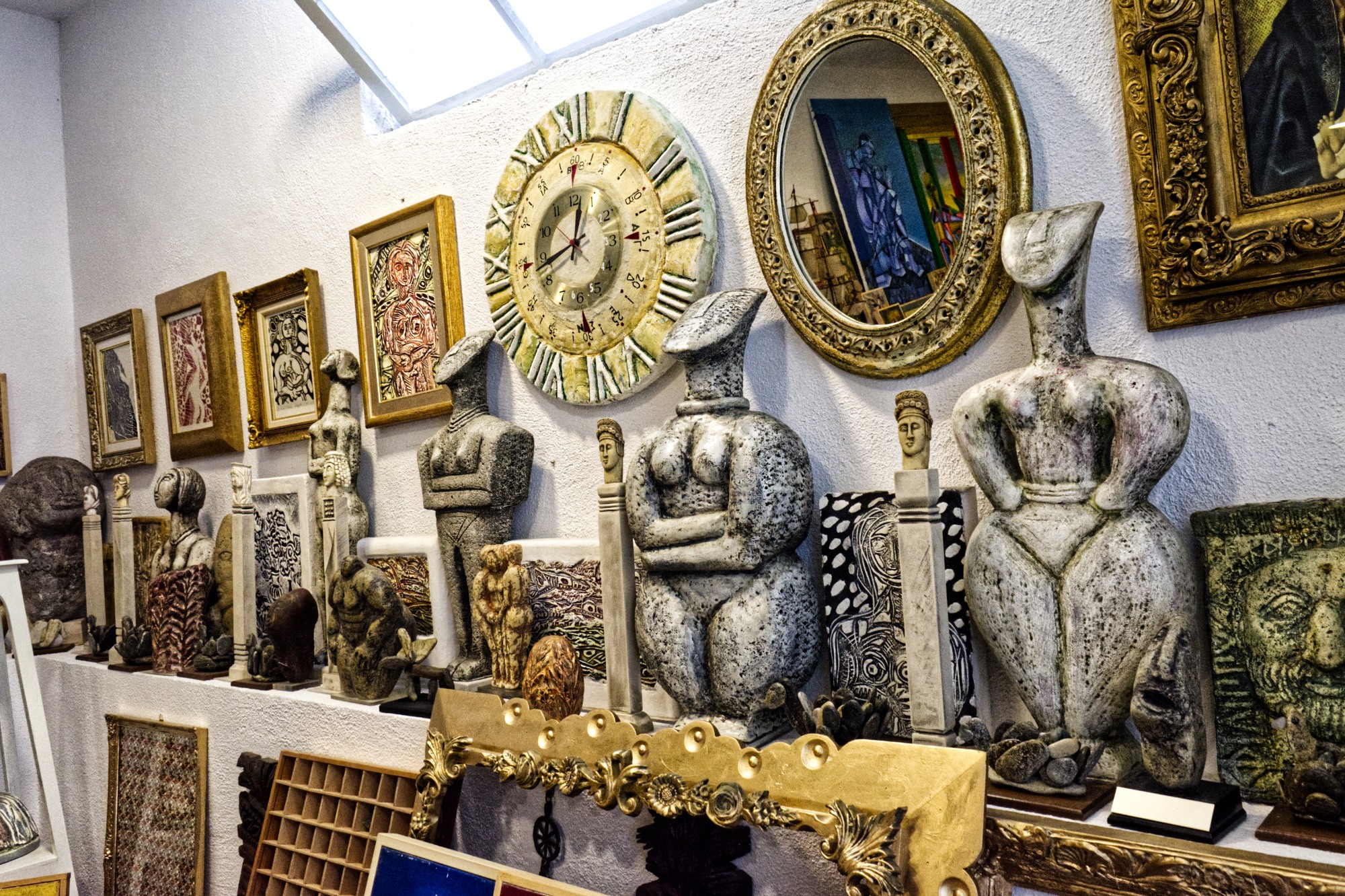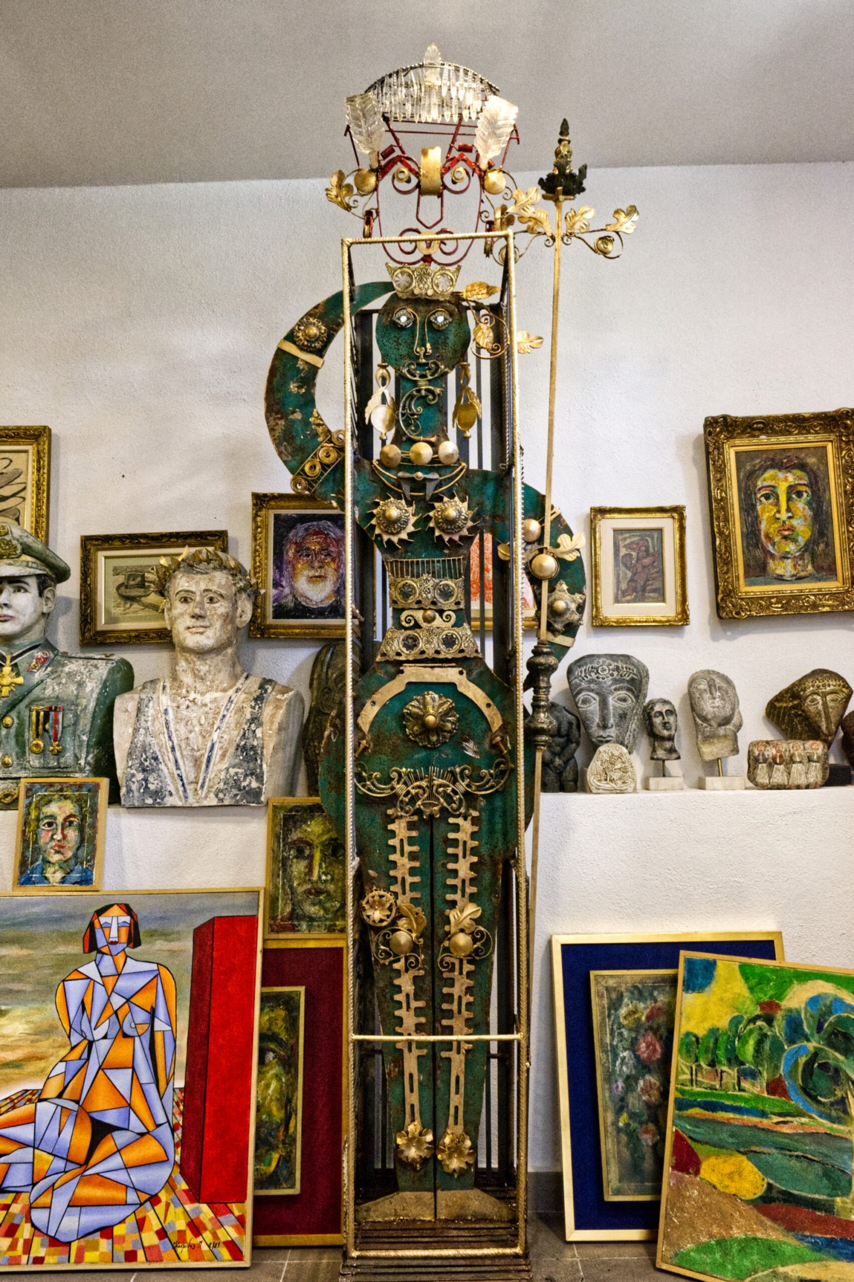 Σαν περνάς την γαλάζια δίφυλλή πόρτα, εντυπωσιάζεσαι από την ποικιλία των έργων και της τεχνικής του δημιουργού, που ξέρει να σμιλεύει την πέτρα και να χειρίζεται αριστοτεχνικά το πινέλο. Μέσα στους τέσσερις τοίχους, η καλλιτεχνική πορεία μιας ολόκληρης ζωής. Και βέβαια είναι συγκινητικό, πως μέσα εδώ ξεκίνησε μικρό παιδί να ζωγραφίζει στα σχολικά του τετράδια και να σκαλίζει πέτρες. Κάποια από εκείνα τα πρώτα του έργα, εκθέτει με αγάπη και νοσταλγία στον χώρο του.