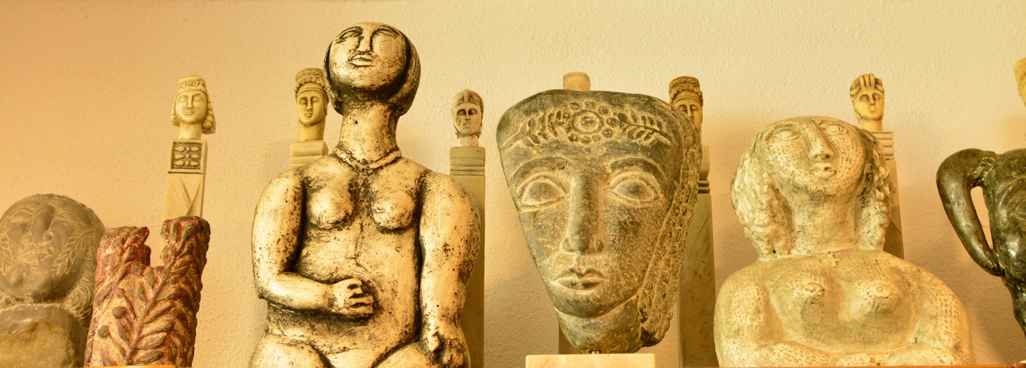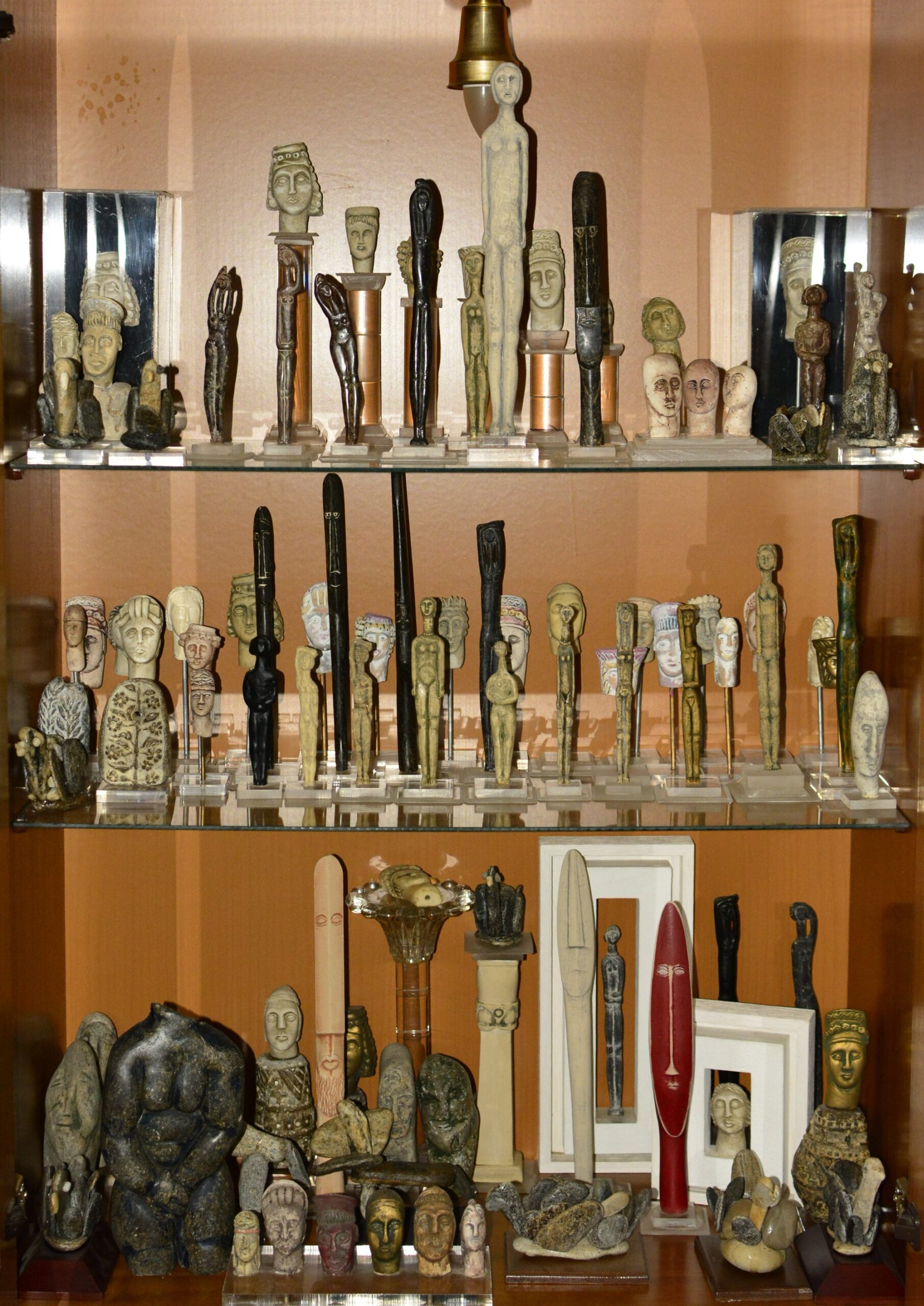 Σε μια προθήκη υπάρχουν μικρά και μεγάλα γλυπτά από πέτρα, ειδώλια τα περισσότερα. Όταν ήταν μικρός είχε κατασκευάσει μια βουκέντρα για να χτυπάει με τη μύτη της πέτρες δίπλα στα ρέματα για να βρει μαλακές και να μπορεί στη συνέχεια να τις σκαλίσει. Και μια και εκείνη την εποχή δεν υπήρχαν εργαλεία, οι πέτρες έπαιρναν τη μορφή που επιθυμούσε με ένα μικρό μαχαίρι.