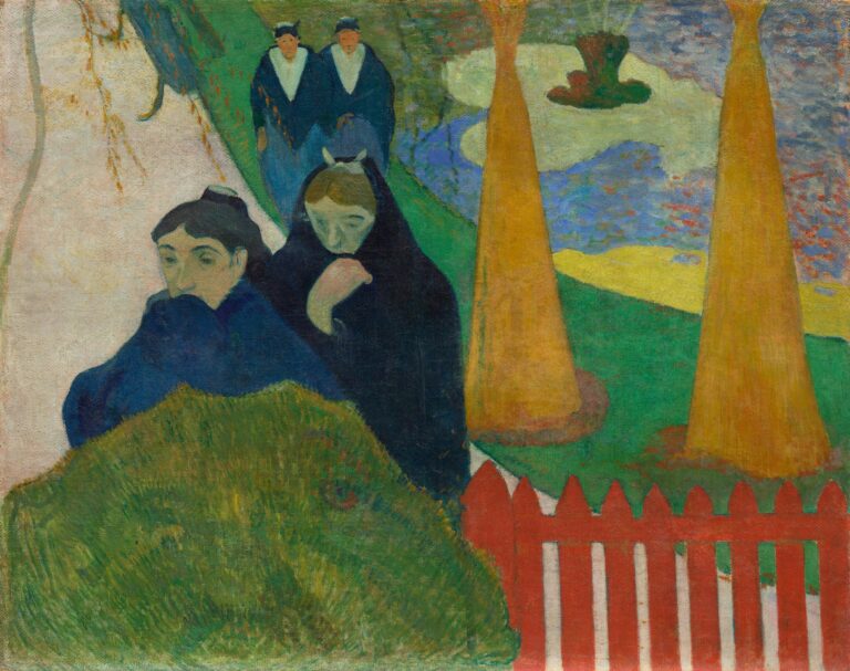 Η σπουδή της νεκρής φύσης ήταν ανέκαθεν ελκυστική για τον Gauguin και τα δύο αυτά έργα, αρκετά παρόμοια σε μέγεθος, απεικονίζουν θαυμάσια την ικανότητά του να συνδυάζει τις προηγούμενες επιρροές του και την υψηλή του μαεστρία στη σύνθεση με μια ακόμα πιο απλοποιητική προσέγγιση που κυριαρχείται από το χρώμα. Από την άλλη, το «Τοπίο με λεύκες» του Cézanne δημιουργήθηκε μεταξύ 1885 και 1887, δηλαδή περίπου την ίδια περίοδο με την «Αυτοπροσωπογραφία» του, έργο της μόνιμης Συλλογής του Ιδρύματος, δίπλα στην οποία έχει τοποθετηθεί.
