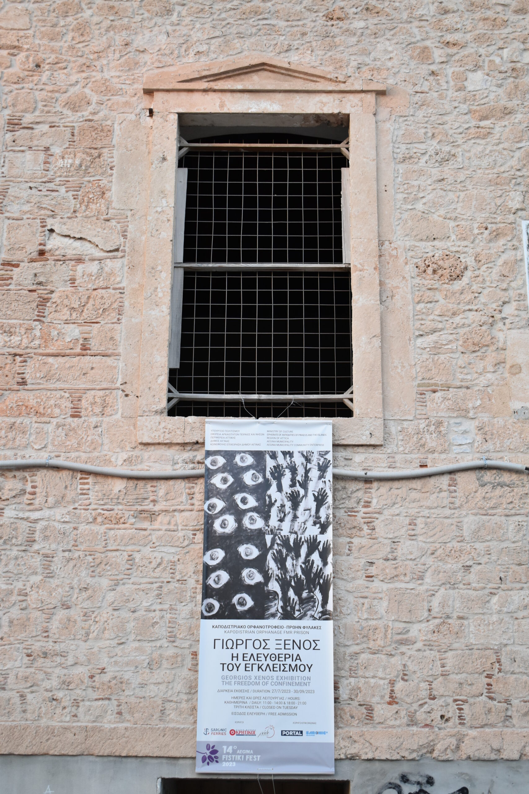 Παρατηρώντας προσεκτικά, μπορεί κανείς να δει τα χέρια των ναυαγών-προσφύγων που εναγωνίως αναζητούν εκείνα των διασωστών τους. Πρόκειται για το επίκεντρο των εκθεμάτων, που μαζί με τα installations στον προαύλιο χώρο, μας καλούν να σπάσουμε τα δεσμά του φόβου, της βίας, των στερεότυπων και της μισαλλοδοξίας. Η έκθεση που θα παραμείνει ανοιχτή για το κοινό μεταξύ 27 Ιουλίου – 30 Σεπτεμβρίου 2023, αποτελεί μέρος του πολιτιστικού προγράμματος του 14ου Aegina Fistiki Fest, διοργανώνεται από το Υπουργείο Πολιτισμού, την Εφορεία Αρχαιοτήτων Πειραιώς και Νήσων, την Περιφέρεια Αττικής, τον Δήμο Αίγινας και την Κοινωφελή Επιχείρηση Δήμου Αίγινας και παρουσιάζεται παράλληλα με μία ακόμη έκθεση του Γιώργου Ξένου στην Αίγινα, που τιτλοφορείται «Πορευόμενοι στην Ιερότητα» και φιλοξενείται στο Αρχαιολογικό Μουσείο Κολώνας.