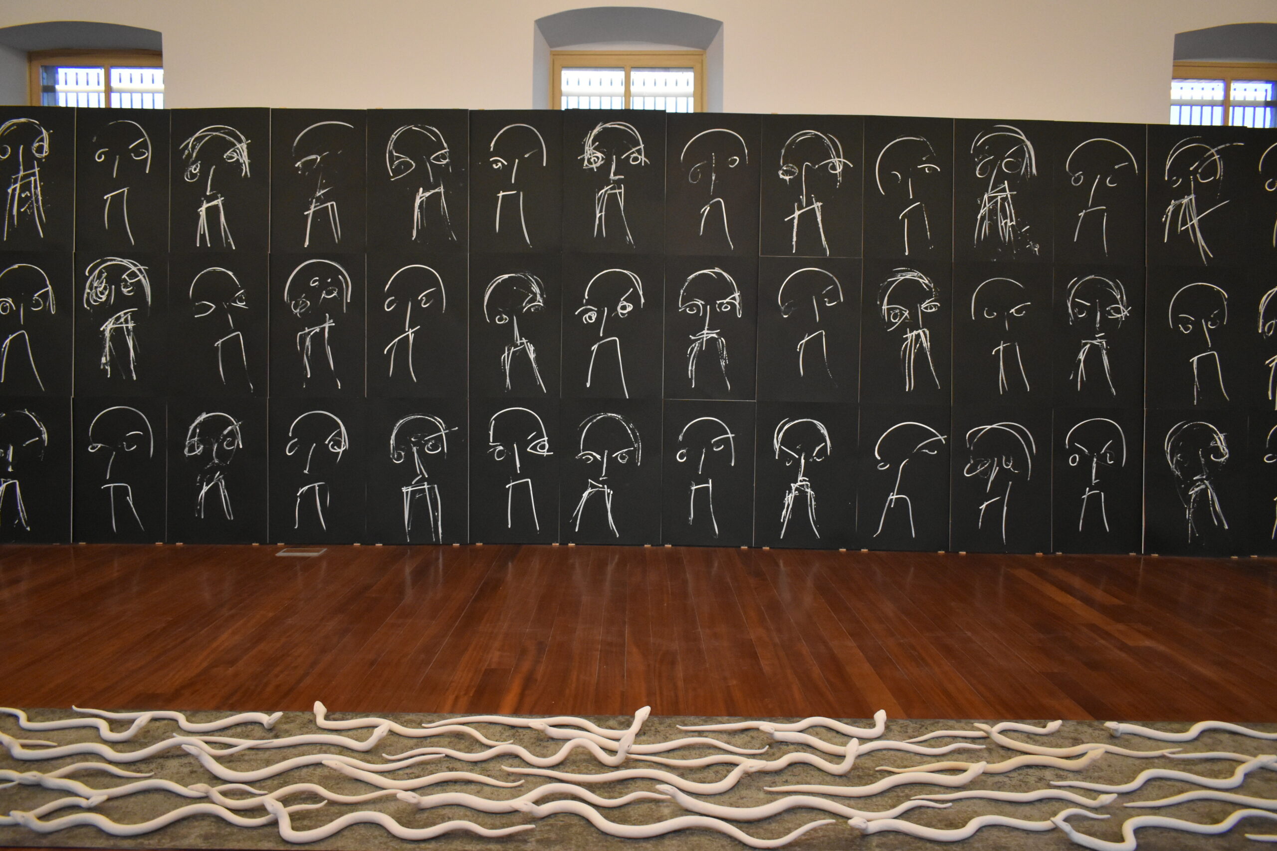 Ο σπουδαίος εικαστικός Γιώργος Ξένος είναι ο πρώτος καλλιτέχνης του οποίου το έργο ήδη εκτίθεται σε αυτόν το χώρο ιστορικής μνήμης. Η θεματική της έκθεσής του μάλιστα, «Η ελευθερία του εγκλεισμού», αποτελεί μια ευτυχή σημειολογικά συγκυρία: από τη μια φιλοξενείται στο χώρο όπου βασίλευε ο εγκλεισμός και η στέρηση της ελευθερίας, από την άλλη εγκαινιάζει την αναγέννηση του κτιρίου, τη μετάβασή του από μια περίοδο σκοτεινή, γεμάτη περιορισμούς, στην απεριόριστη ελευθερία σκέψης που επιτρέπει η τέχνη. Τα έργα του, κυρίως ακριλικά σε χαρτί, τονίζουν την ανάγκη υπέρβασης των ορίων της σκέψης, της έκφρασης και της ελεύθερης επιλογής, ενώ αίσθηση προκαλούν μεγάλης κλίμακας δημιουργίες, όπως οι «Φυλακισμένοι», οι «Φωνασκούντες» και ιδίως τα «Χέρια», που αποτυπώνουν ένα προσωπικό βίωμα του καλλιτέχνη, που ο ίδιος ανακαλεί με συγκινησιακή φόρτιση: πρόκειται για την καλλιτεχνική αποτύπωση της επιχείρησης διάσωσης μεταναστών στη Μυτιλήνη, το 2005, στην οποία συμμετείχε κι ο ίδιος ο Γιώργος Ξένος.