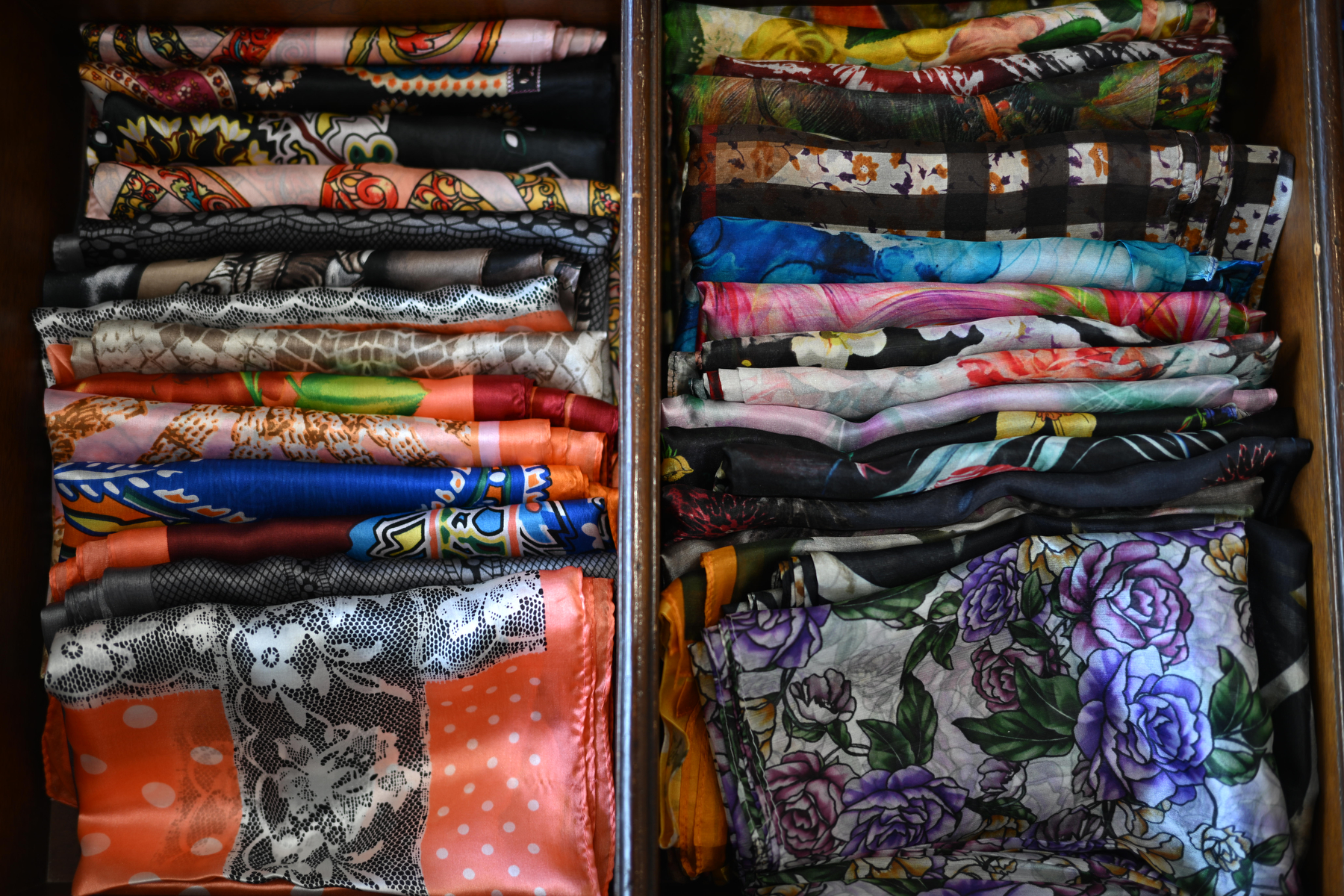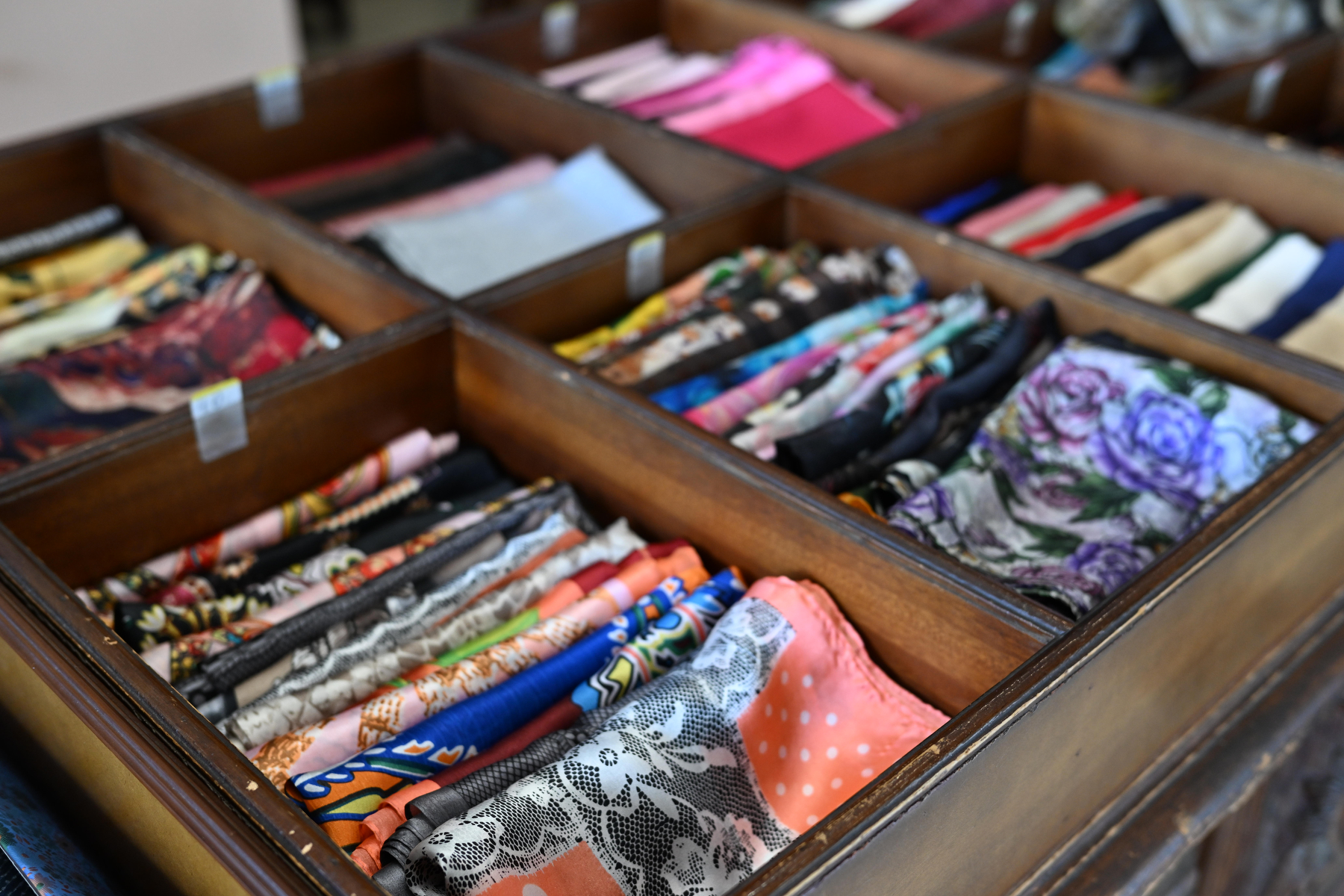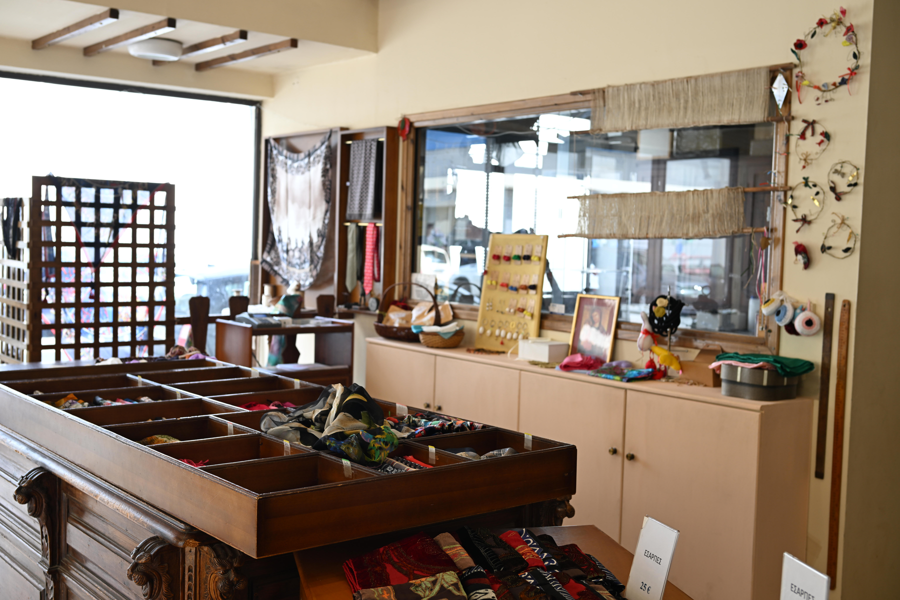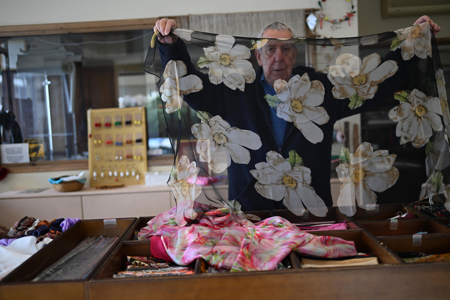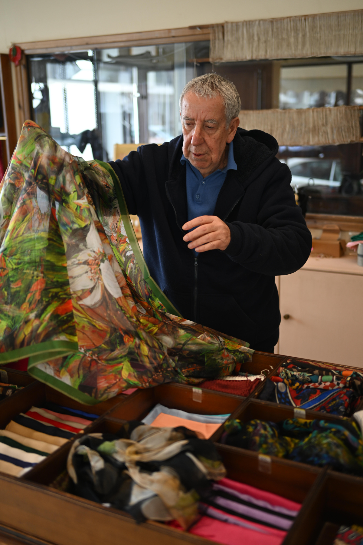 Καθώς η συζήτηση προχωρούσε, ο νεότερος Παναγιώτης, που θα αποτελέσει την τέταρτη γενιά στην οικογενειακή επιχείρηση, άρχισε να μας δείχνει την ποικιλία των προϊόντων τους: «Παράγουμε τετράγωνα μαντήλια, φουλάρια, εσάρπες -μονόχρωμα και εμπριμέ- αλλά και ολομέταξα υφάσματα για ρούχα, εργόχειρα και νυφικά. Όλα από ελληνικό μετάξι», τόνισε με υπερηφάνεια. Κάθε μαντήλι είχε τη δική του προσωπικότητα, τη δική του ιστορία. Άλλα με παραδοσιακά γεωμετρικά μοτίβα, άλλα με λουλουδάτα σχέδια, άλλα σε έντονες αποχρώσεις και άλλα σε απαλούς, γήινους τόνους.