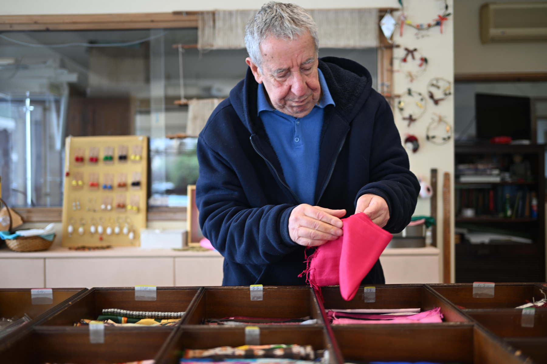 Ο κύριος Γκόνος μας μίλησε και για τη σημασία της σωστής συντήρησης του μεταξωτού. «Το μεταξωτό είναι ζωντανό υλικό», τόνισε. «Χρειάζεται προσοχή στο πλύσιμο -πάντα στο χέρι, με απαλές κινήσεις και ουδέτερο σαπούνι. Ποτέ στεγνωτήριο, και το σιδέρωμα πρέπει να γίνεται όταν το ύφασμα είναι ακόμα ελαφρώς νωπό, από την ανάποδη, με χαμηλή θερμοκρασία». Επέμεινε ιδιαίτερα στην αποθήκευση: «Τα μεταξωτά θέλουν αέρα και σκοτάδι. Τα διπλώνουμε χαλαρά, χωρίς να τα πιέζουμε, και τα τοποθετούμε σε μέρος που αερίζεται αλλά δεν εκτίθεται σε ήλιο».