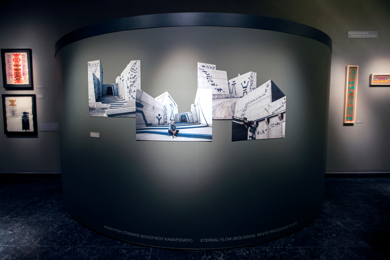 Η διαδρομή προς την έξοδο ολοκληρώνεται με το μεγεθυμένο φωτογραφικό πορτρέτο του Ξενάκη σε αγαλματική στάση Αιγύπτιου φαραωνικού γραφέα ο οποίος κατάγραφει, όχι αγαθά ανακτορικής κατοχής, αλλά τα ζητήματα που θέτει η κοινωνία και η οικονομία στους ανθρώπους και τα οποία ο ίδιος έχει προσπαθήσει να εκφράσει με τη συνολική του δουλειά, φανερή για όποιον έχει ολοκληρώσει την πορεία προς την έξοδο. Δίπλα του, το κείμενο που ο ‘Ιάπωνας φιλόσοφος και ποιητής Makoto Ooka έγραψε για τον Ξενάκη και την εικαστική γλώσσα των συμβόλων που εφηύρε, σχολιάζει τόσο τις αναζητήσεις του καλλιτέχνη σε άλλους πολιτισμούς, όσο και την πικρία του για την ελλειμματική παρουσία της συντεταγμένης χώρας του στην υποστήριξη δημιουργικών φωνών.
