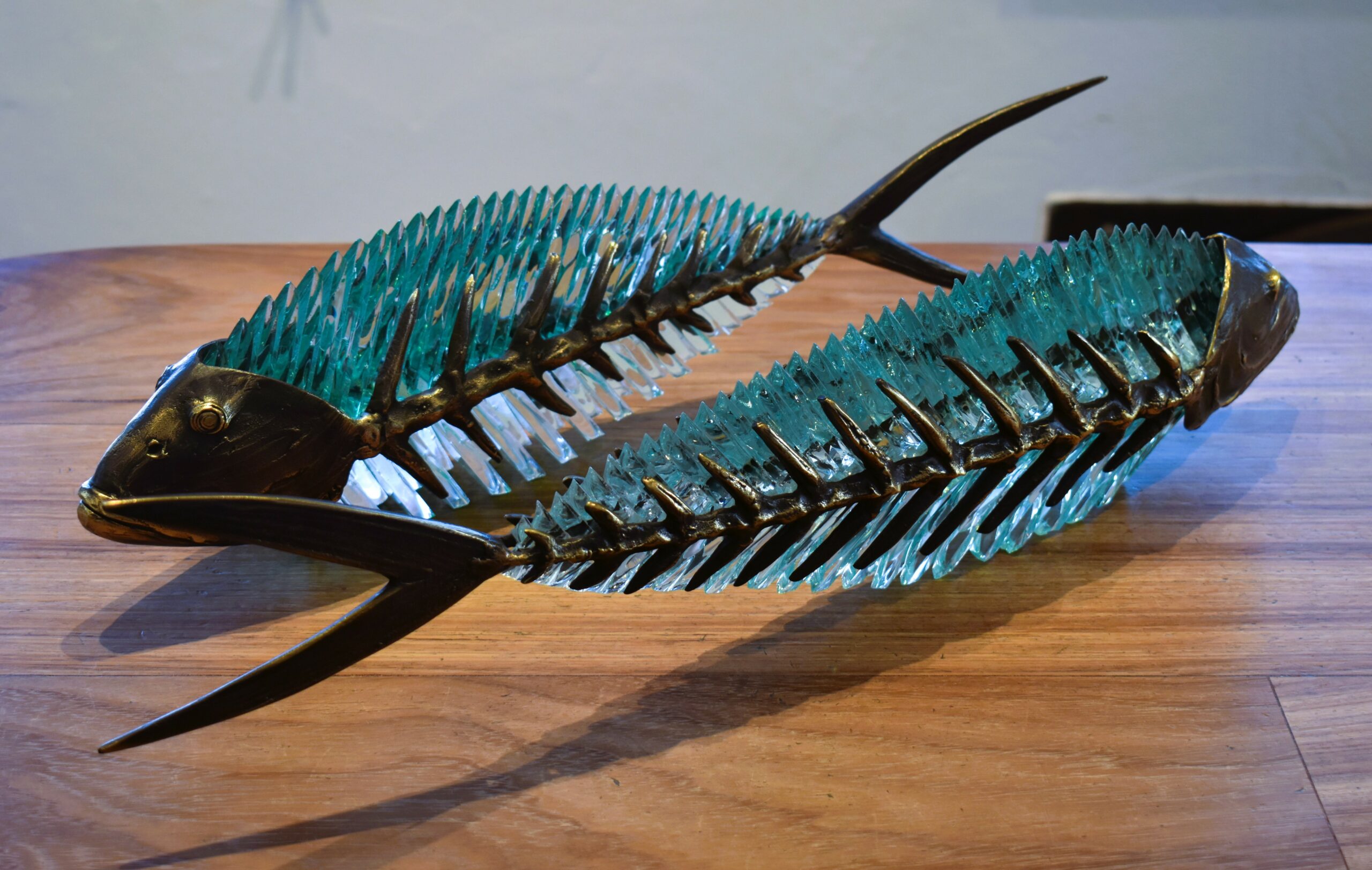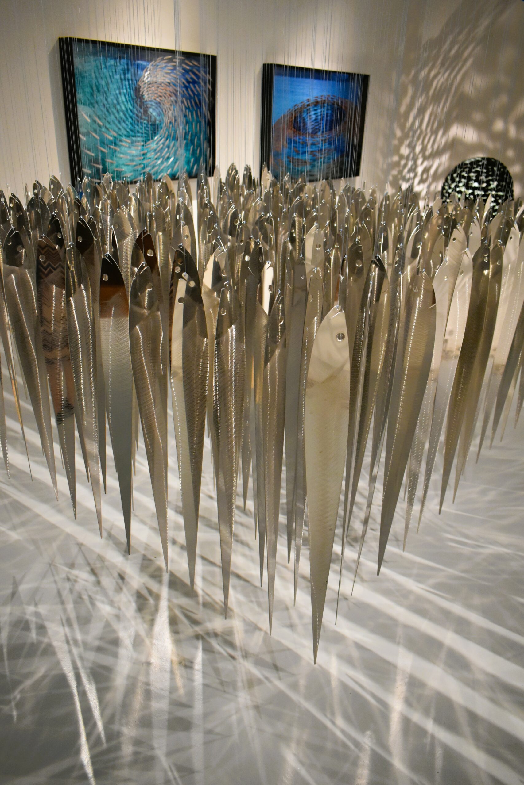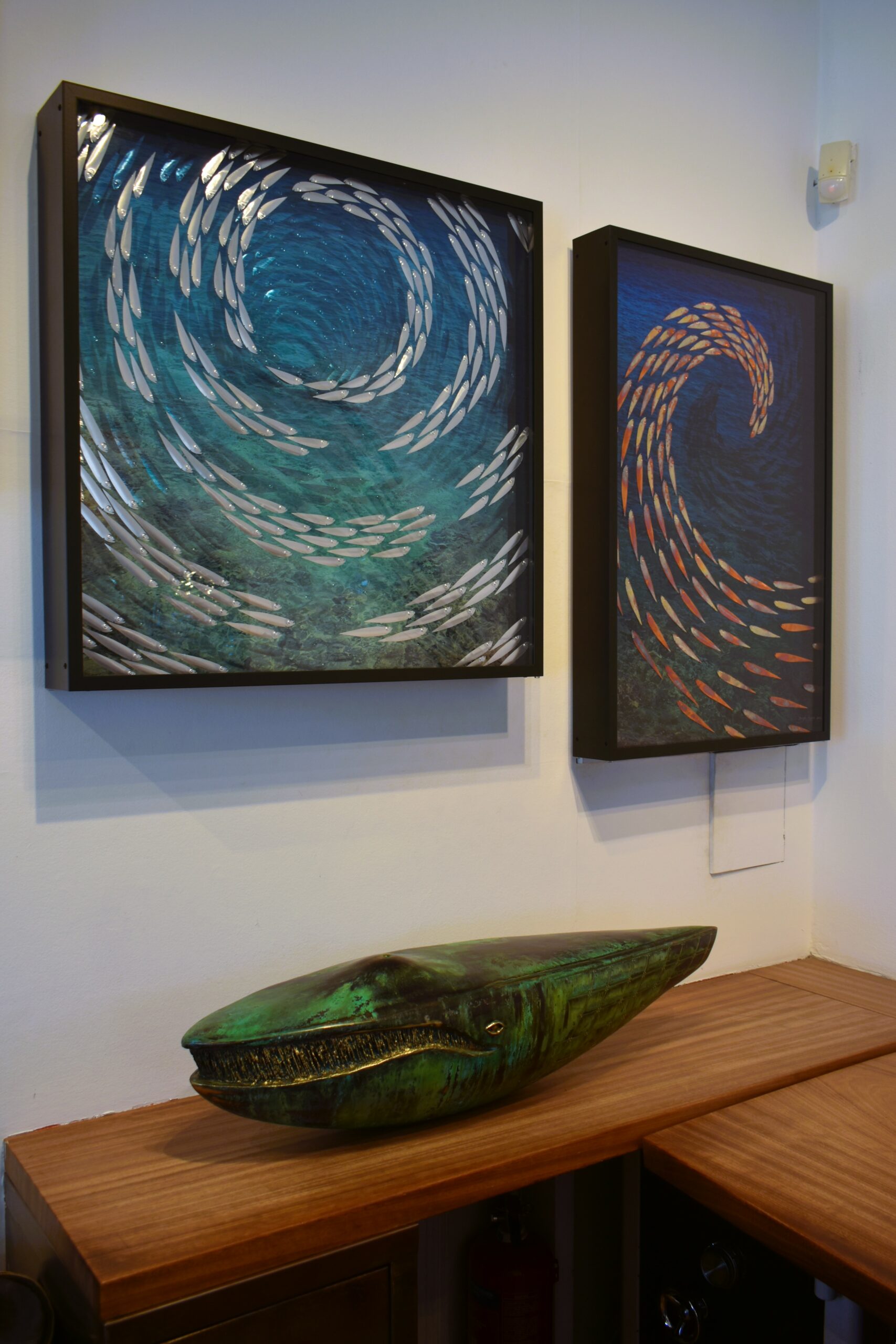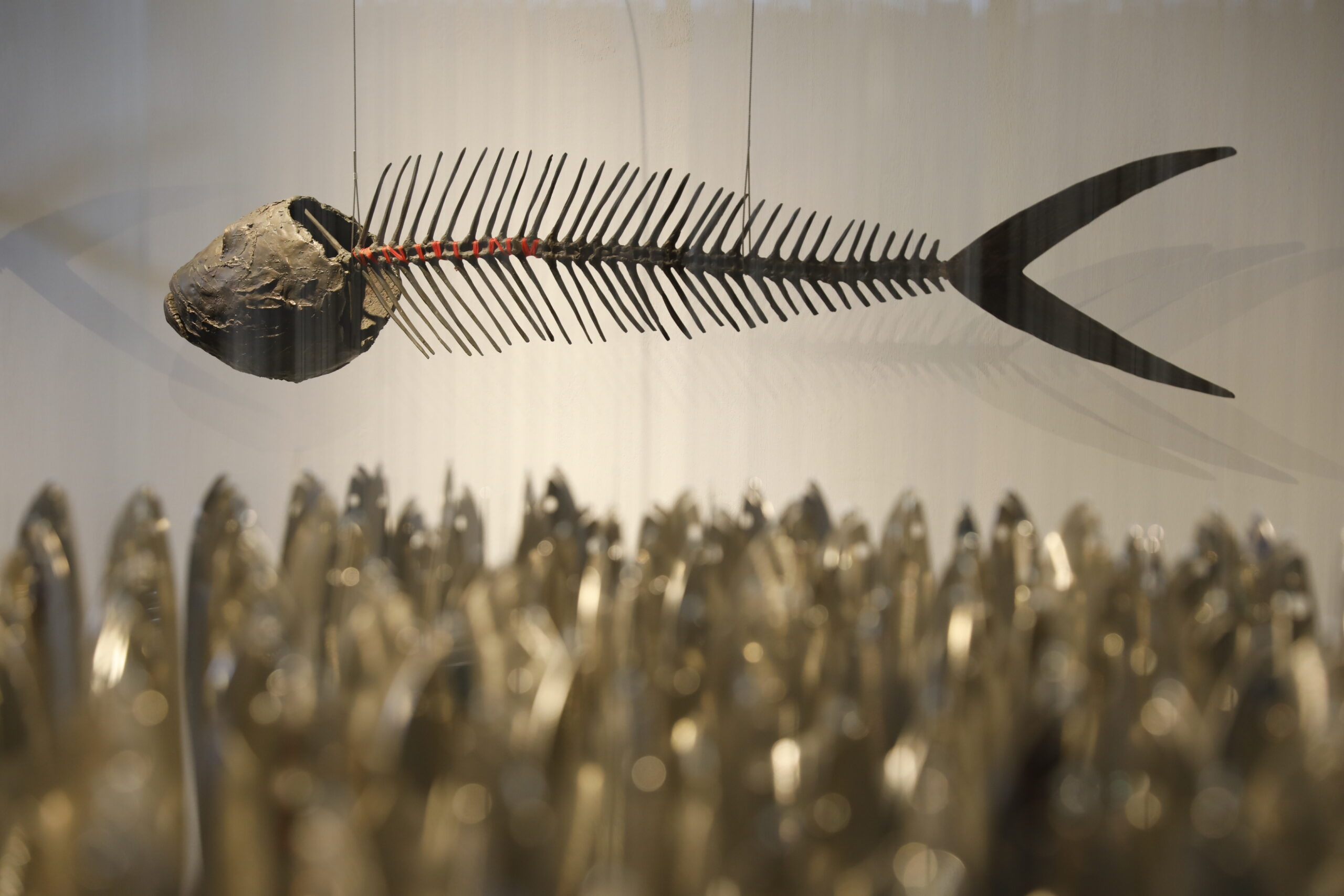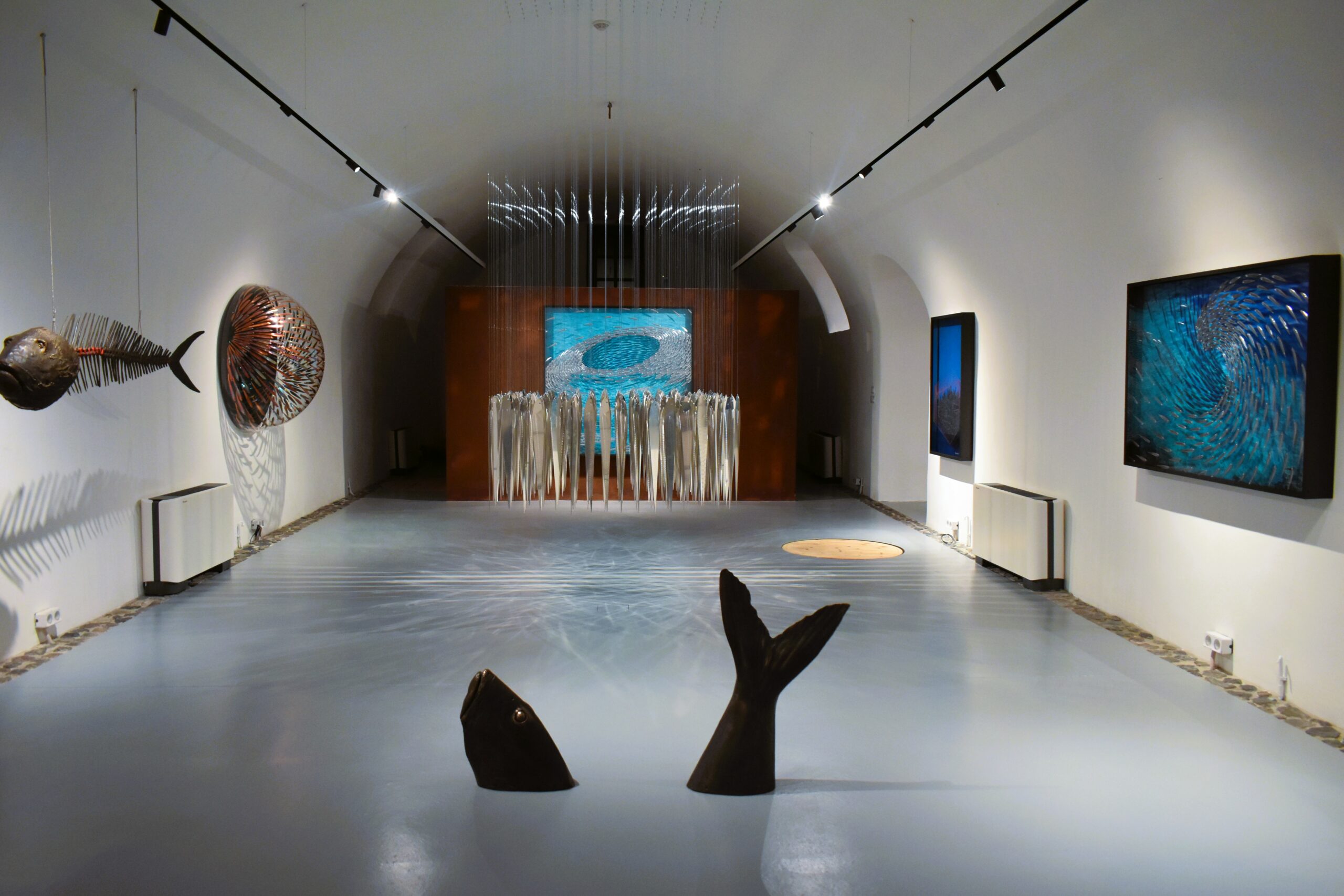 Εδώ, μπορεί κανείς να περιεργαστεί και να θαυμάσει αρκετά από τα έργα της πιο δημοφιλούς σειράς του. Πρόκειται για τα «Ψάρια», ένα θέμα τόσο οικείο και τόσο άγνωστο ταυτόχρονα, ένα σύμπαν μαγευτικό, εύθραυστο, σε αέναη κίνηση σαν την ίδια τη δημιουργικότητα του Γιώργου Κυπρή. Από τον πρώτο κύκλο έργων που έφερε τον τίτλο «Καταστάσεις ψαριών» το 1993, ο καλλιτέχνης δεν έχει πάψει να «βουτά» στο αγαπημένο του θέμα, προσεγγίζοντάς το με τη σοβαρότητα που αρμόζει στον τρόπο που ο άνθρωπος αλόγιστα επιβάλλεται και διαχειρίζεται το περιβάλλον, φέρνοντας στην επιφάνεια τον οικολογικό αντίκτυπο που έχουν οι πράξεις μας, ακόμη κι όταν πρόκειται για το αποτύπωμα των διατροφικών μας αναγκών στην ισορροπία των οικοσυστημάτων.