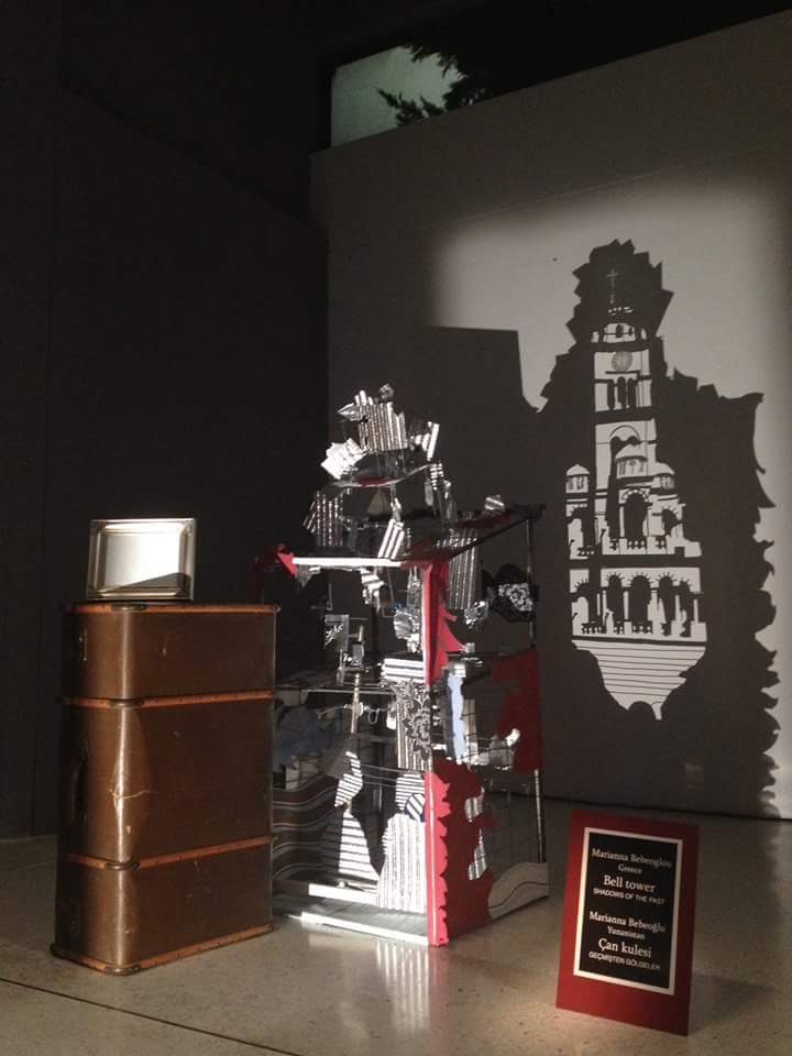 Από τα έργα που εντυπωσιάζουν είναι το «Καμπαναριό», τ΄ οποίο ο καλλιτέχνης δημιούργησε για τις ανάγκες της ταινίας του Γιώργου Κορδέλλα «Η Ρόζα της Σμύρνης». Πρόκειται για την εντυπωσιακή απεικόνιση του καμπαναριού της Αγίας Φωτεινής της Σμύρνης, που καταστράφηκε στα δραματικά γεγονότα του 1922. Για το «Καμπαναριό» και όλα τα έργα που παρουσιάζονται, ο Τριαντάφυλλος και η σύζυγός του Ευδοκία θα σας ενημερώσουν αρχικά και στη συνέχεια θα σας αφήσουν να «ταξιδέψετε» στις σκοτεινές αίθουσες, ανάμεσα σε γλυπτά και σκιές.