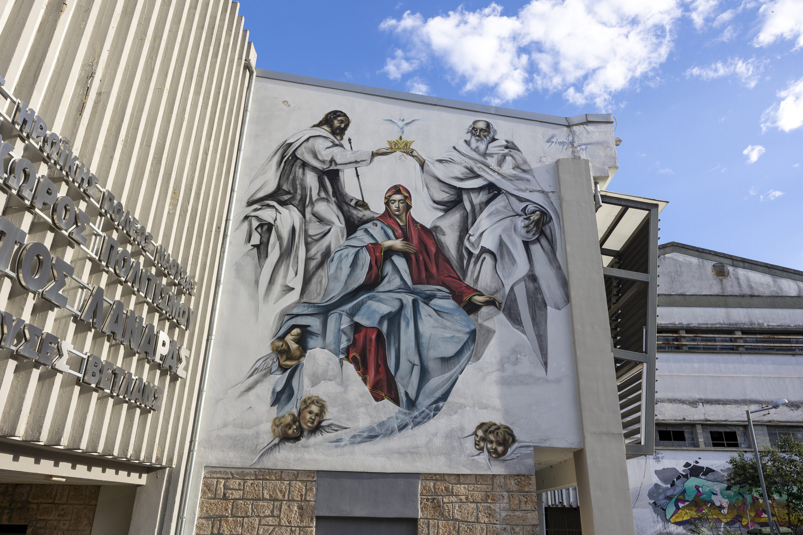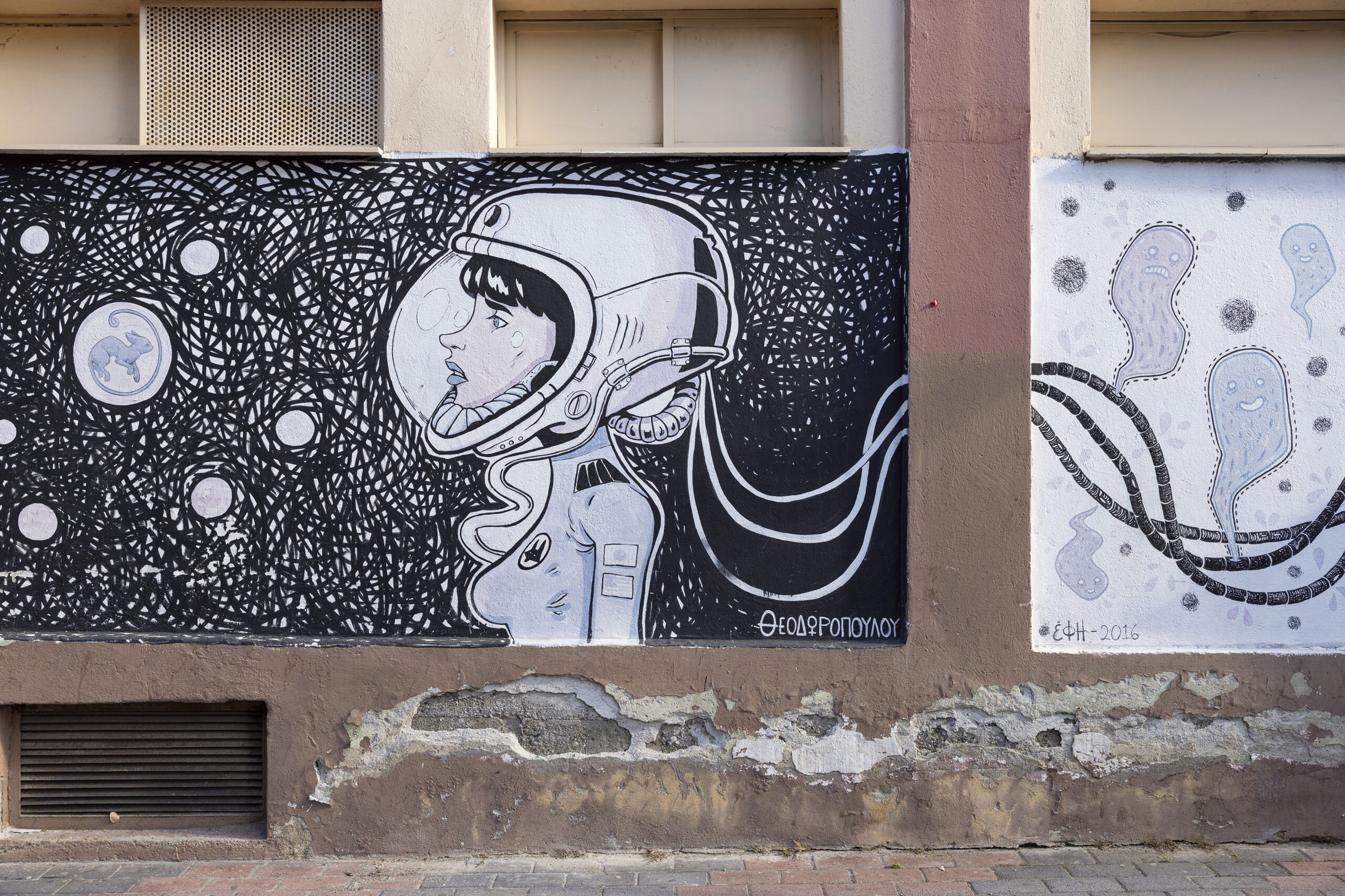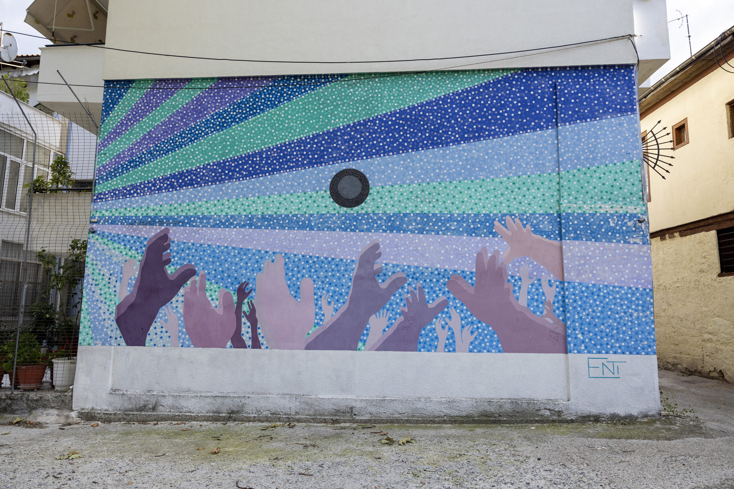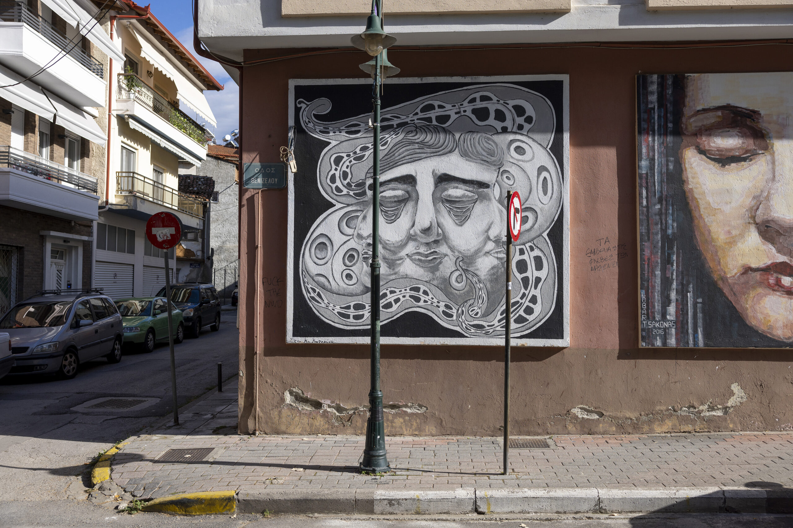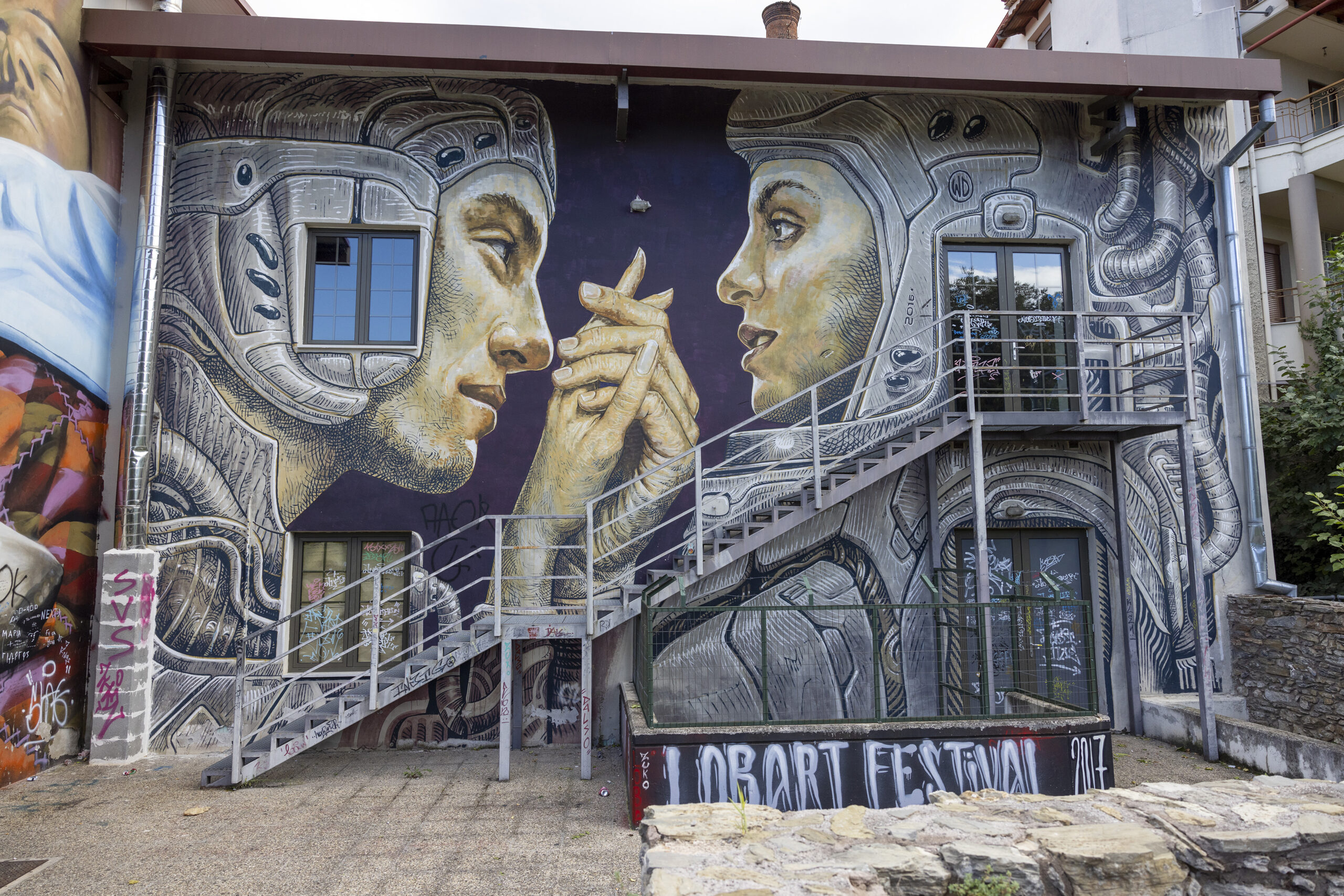 Πάρα πολλά έργα εντυπωσιάζουν σε διάφορα σημεία της Νάουσας όπως στα παλιά υφαντουργεία και στην περιοχή της λαϊκής αγοράς. Το graffiti με την ένωση των χεριών ενός άντρας και μίας γυναίκας σαν να δίνουν όρκο αιώνιας αγάπης, δίνει ζωή σε ένα βιομηχανικό κτίριο. Δημιουργήθηκε το 2016 στο περιθώριο του «Lobart Festival» και η υπογραφή του δημιουργού του είναι «WD».