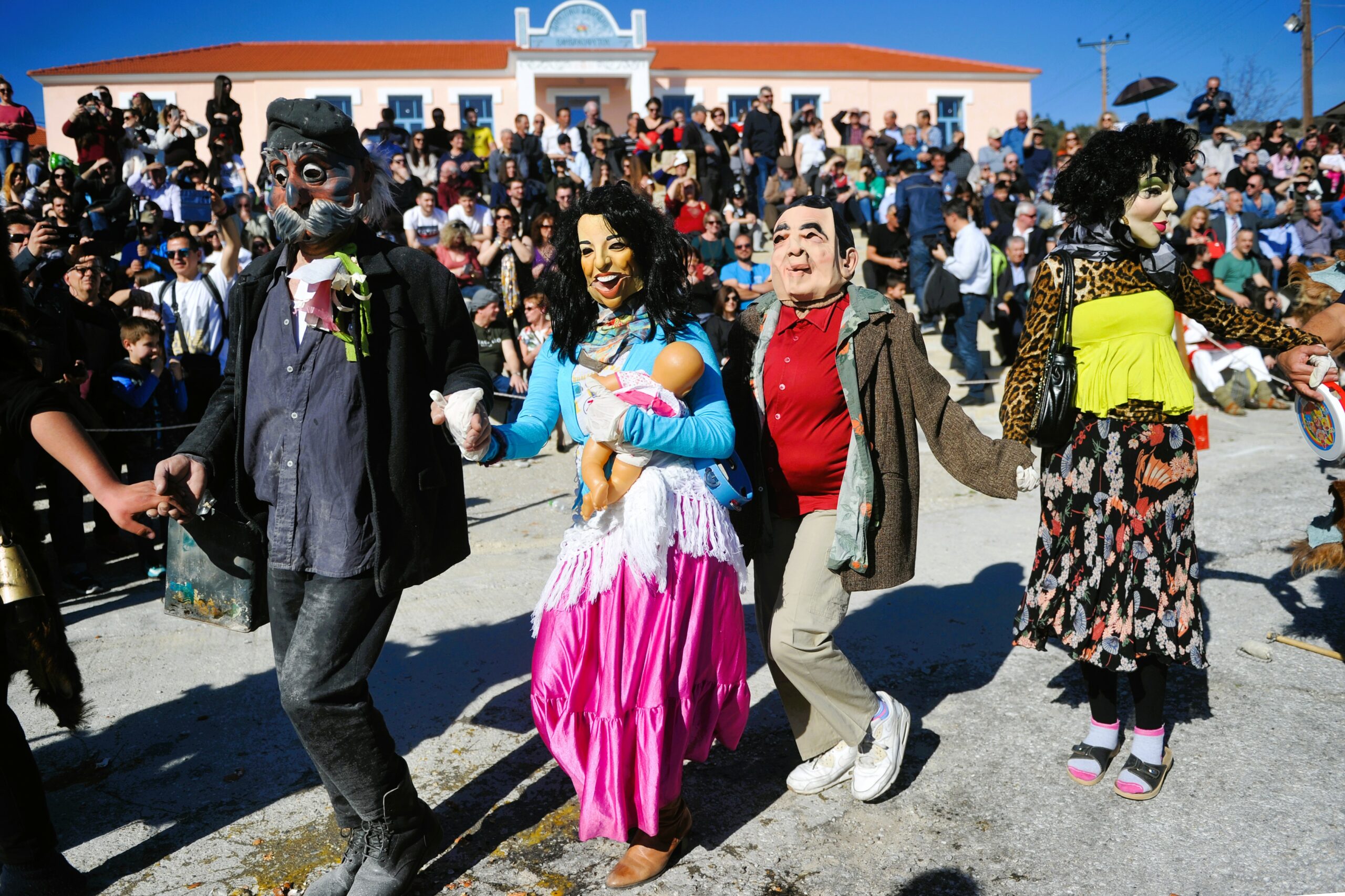 Η πολύχρωμη και πολύβουη πομπή, διασχίζει τους κεντρικούς δρόμους του χωριού, αλληλοεπιδρώντας με το συγκεντρωμένο πλήθος, «περιφρουρούμενη» από τους ταπουζάρηδες, που με άγρια διάθεση προστατεύουν τη νύφη από επίδοξους απαγωγείς, σύμφωνα με το έθιμο. Το ζευγάρι με όλη τη συνοδεία καταλήγει στην πλατεία του χωριού, όπου στήνεται μεγάλο γλέντι υπό τους ήχους παραδοσιακών οργάνων. Εκεί οι μπαμπούγεροι αποκαλύπτουν και τα πρόσωπα τους για να ξαποστάσουν.