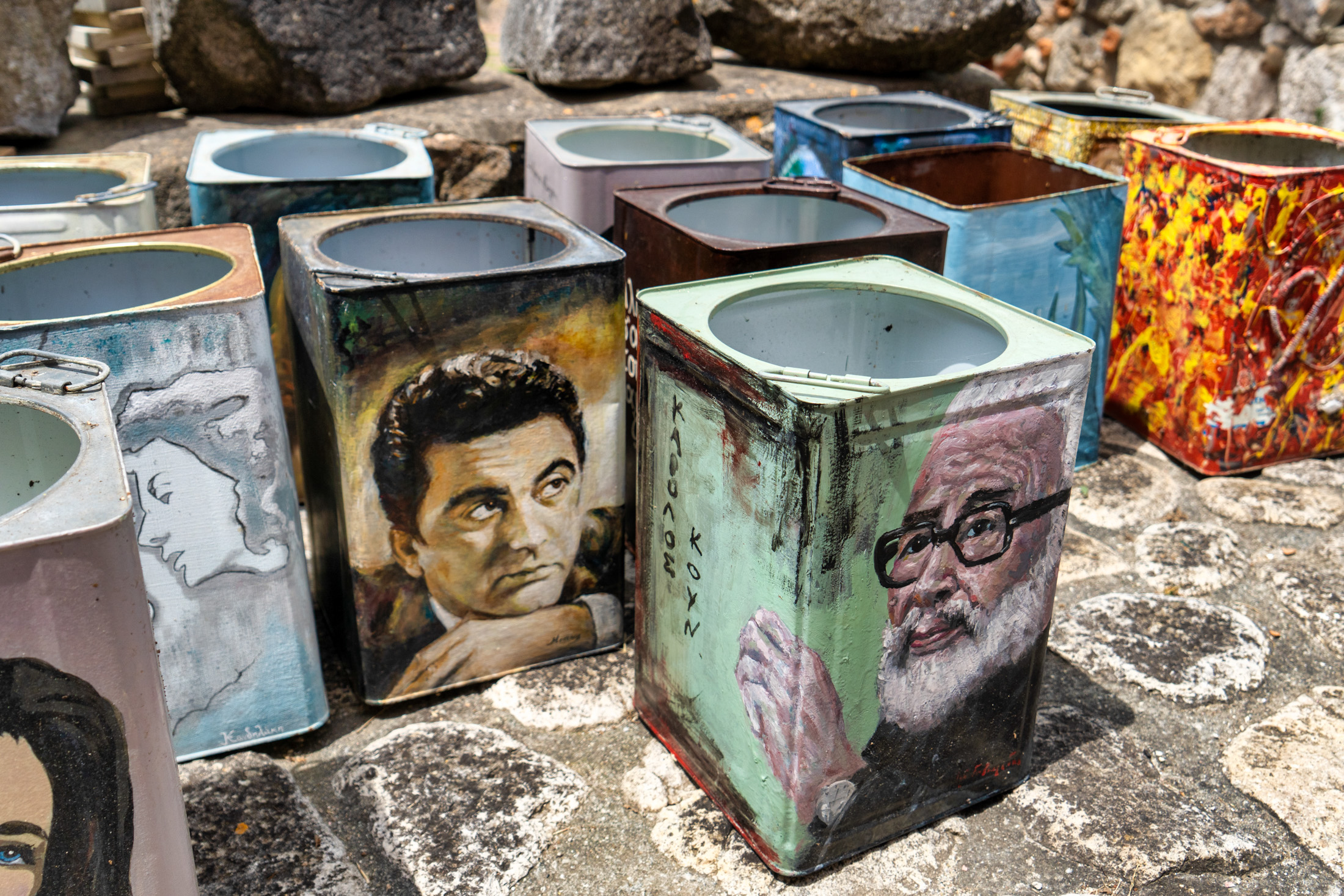 Η πιο σημαντική του συνεισφορά ωστόσο είναι το ότι μετέτρεψε την ιδιαίτερη πατρίδα του σε μία υπαίθρια γκαλερί τέχνης μέσα από δημιουργίες και προτάσεις πρωτότυπες και εντυπωσιακές. Μία τέτοια ενέργεια ήταν η μετατροπή των τενεκέδων του τυριού σε γλάστρες και έργα τέχνης ταυτόχρονα. Σκέφτηκε και πέτυχε, με τη συνδρομή ζωγράφων και εθελοντών από όλη την Ελλάδα, να μετατρέψουν το ταπεινό αυτό αντικείμενο (ζωγραφίζοντας το εξωτερικό του και βάζοντας λουλούδια και φυτά εντός του), σε ολάνθιστο καμβά, που ομορφαίνει την Άφυτο. Περισσότεροι από 350 διάσπαρτοι τενεκέδες, προσφέρουν χρώμα, στυλ και απίστευτο θέαμα.