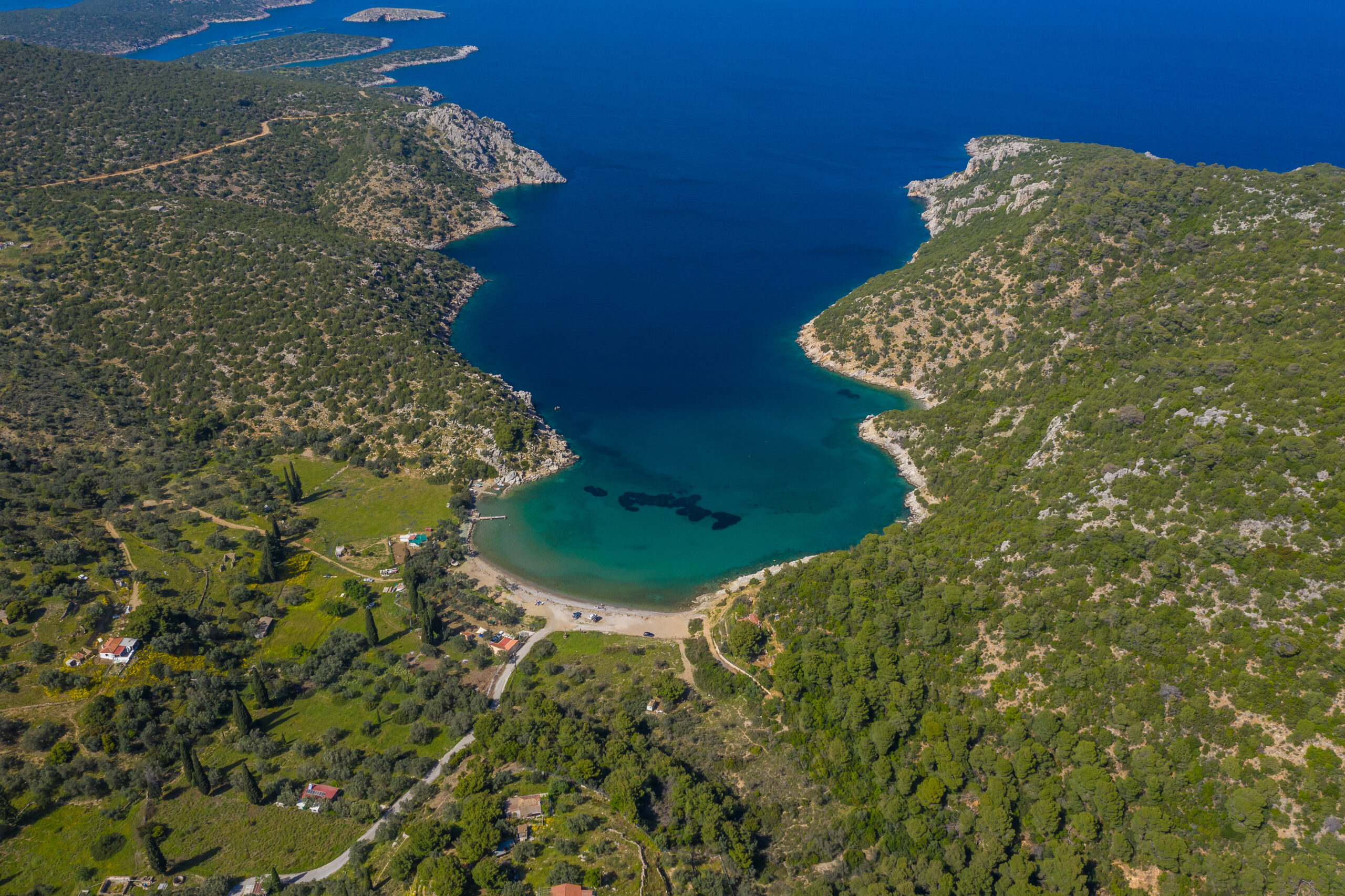 Η ωραιότερη και γνωστότερη παραλία στο βόρειο μέρος του νησιού είναι ένας ακόμη κατάφυτος, γραφικός όρμος, με θέα που απλώνεται ως την Αίγινα και τα Αττικά παράλια. Το πανέμορφο σκηνικό με τα διάφανα νερά να ξεπροβάλλουν μέσα απ΄το πευκόφυτο τοπίο, παρότι απέχει μόνο 7 χλμ. από το λιμάνι του νησιού, θα σας πάρει περίπου μισή ώρα να το προσεγγίσετε, ωστόσο αξίζει η οδήγηση ως εδώ κι όχι μόνο για την απομόνωση και την ηρεμία που σας περιμένει. Η έκπληξη που επιφυλάσσει η ειδυλλιακή παραλία, βρίσκεται στο βυθό της, όπου βουτώντας θα διακρίνετε τα ίχνη αρχαίου οικισμού που υπήρχε στην περιοχή, μεταξύ των οποίων απομεινάρια κατοικιών και οδών.